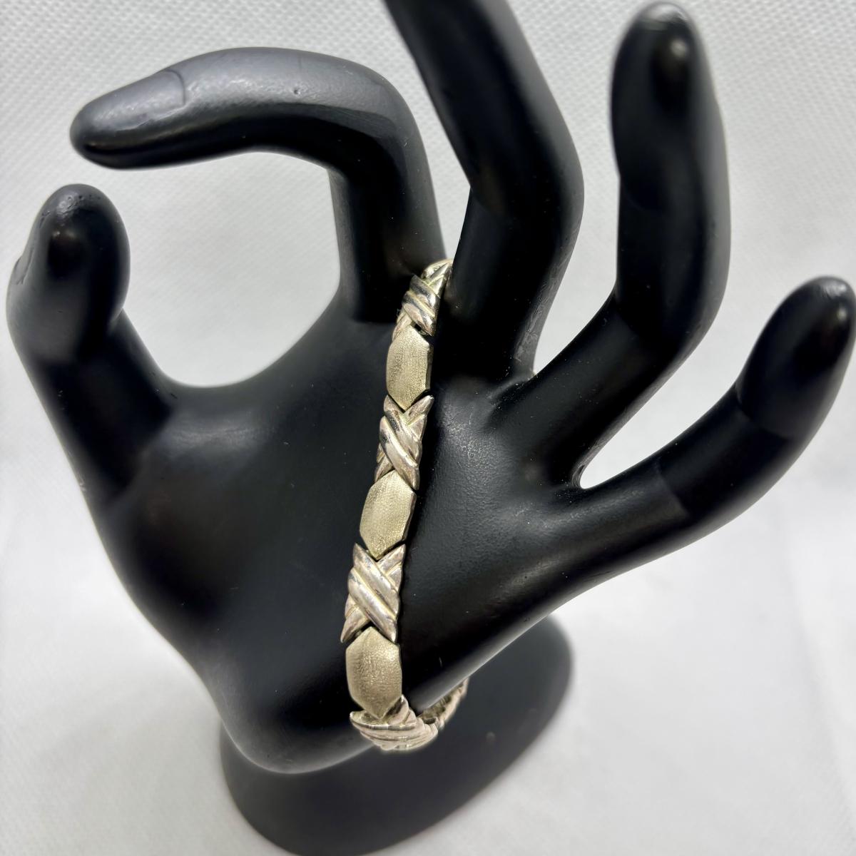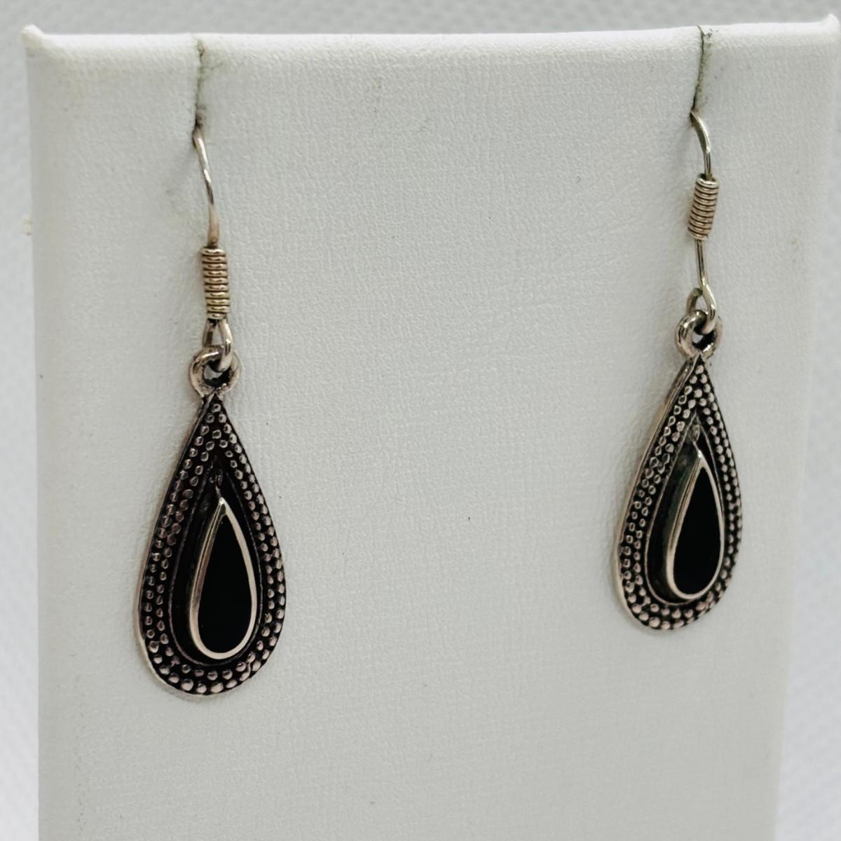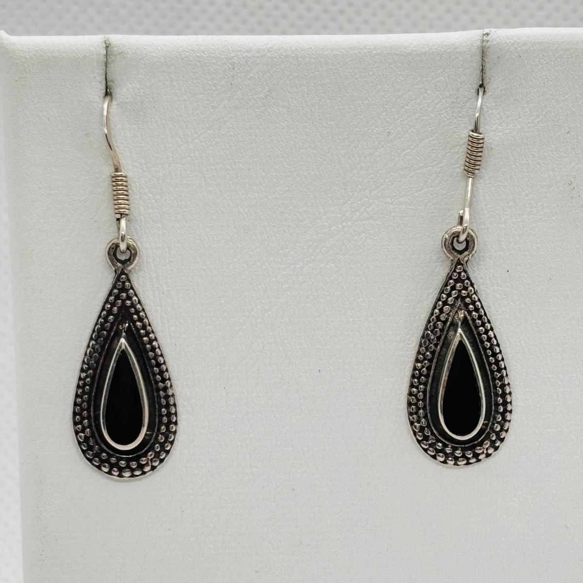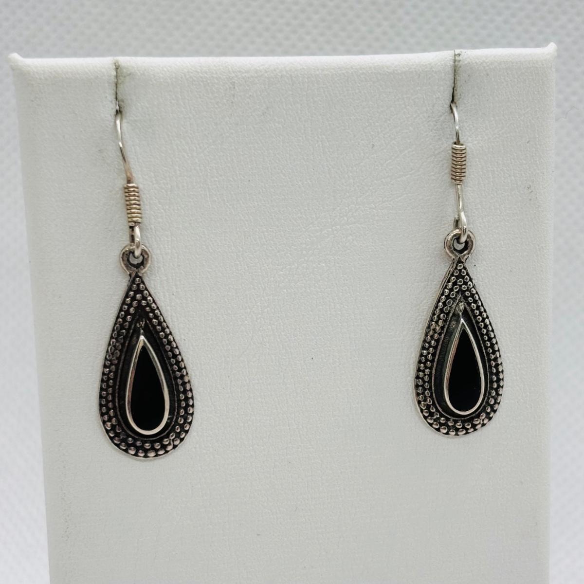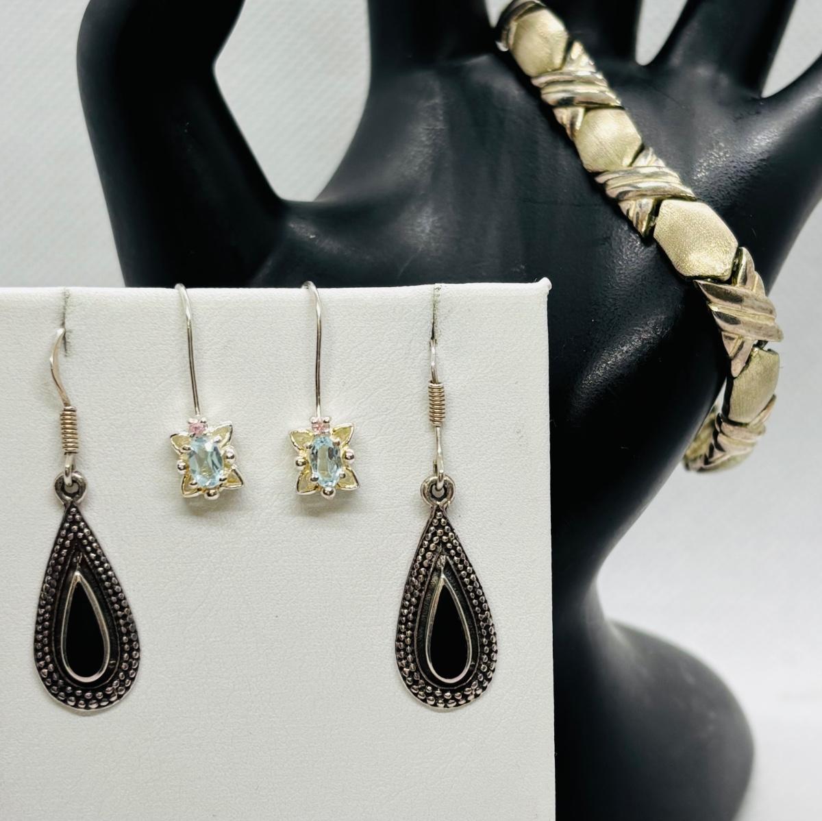 LOT 105: Sterling Silver Hugs & Kissing 7" Bracelet, Onyx Tear Drop Earrings & Avon 925 Blue Topaz Earrings