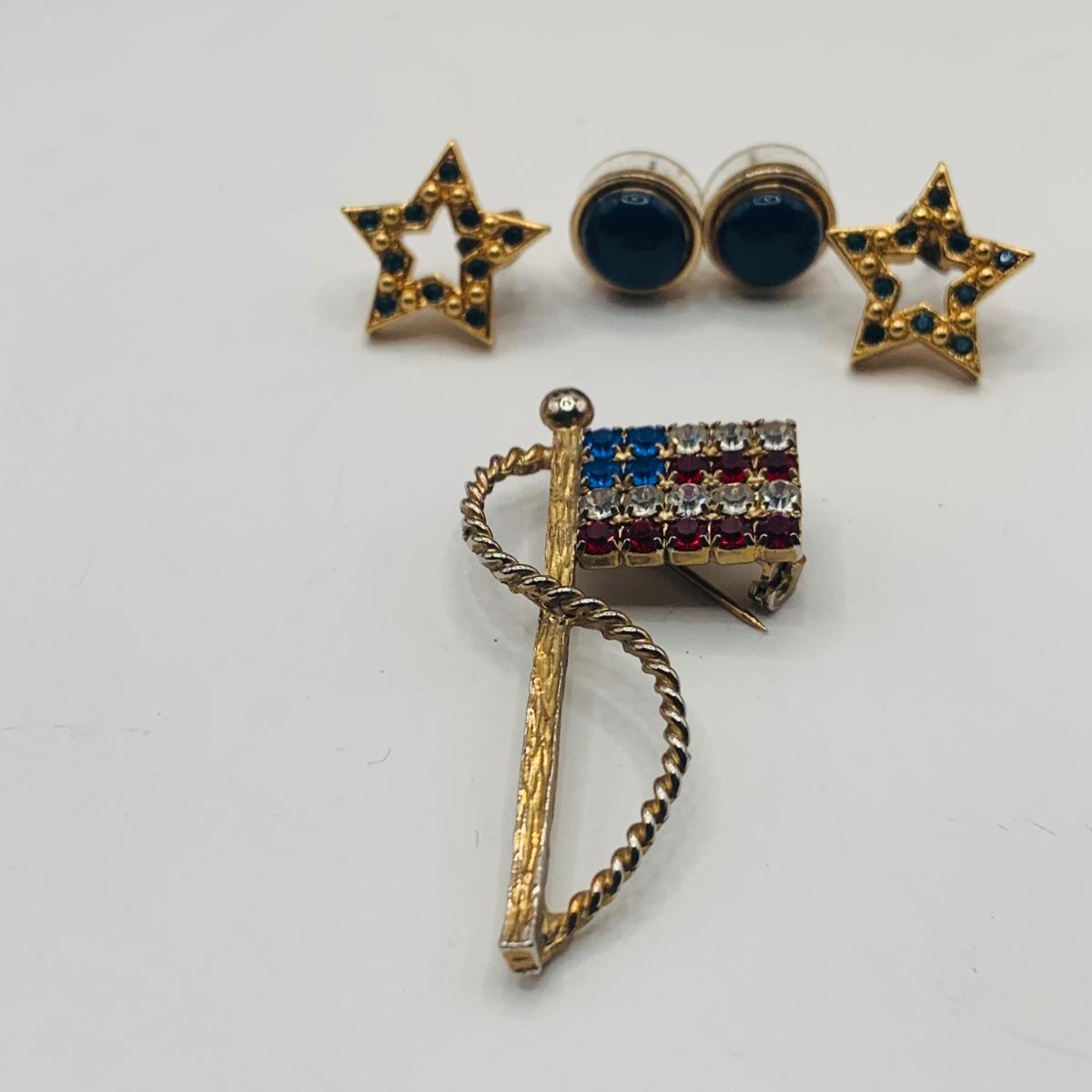 LOT 177: Patriotic Collection of Red, White and Blue Fashion Jewelry Featuring New Old Stock LObster Collar Pins From Bookbinders and Much More