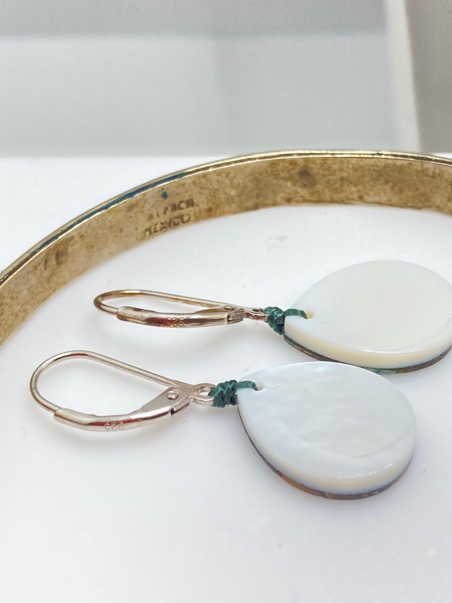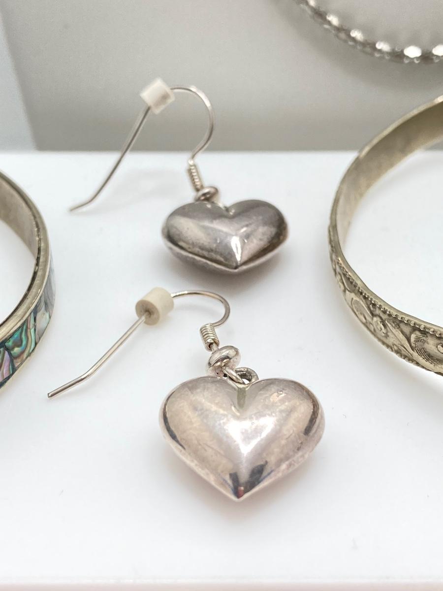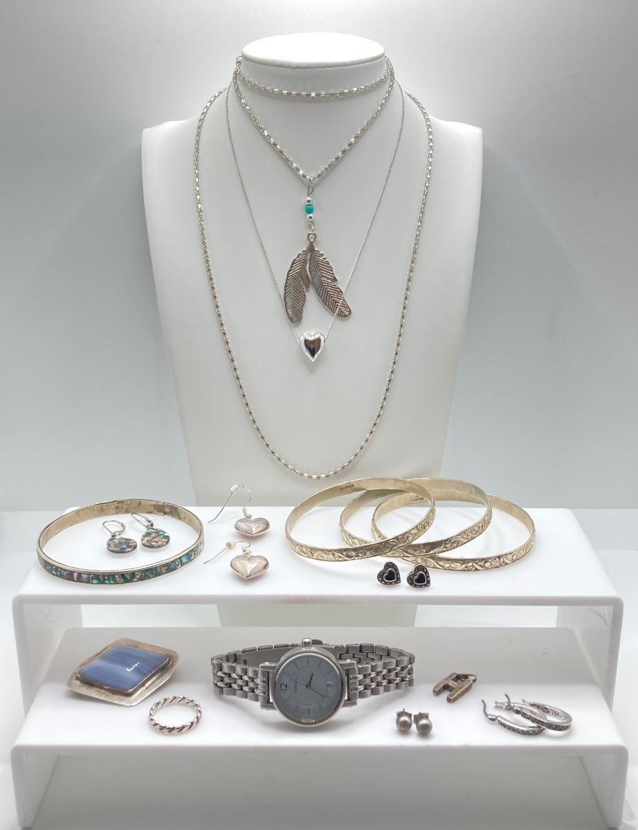 LOT 193J: Sterling / Silver Tone Jewelry Collection - Fossil Watch, Alpaca Mexico Bangle Bracelets, Earrings, Mother of Pearl Earrings and More