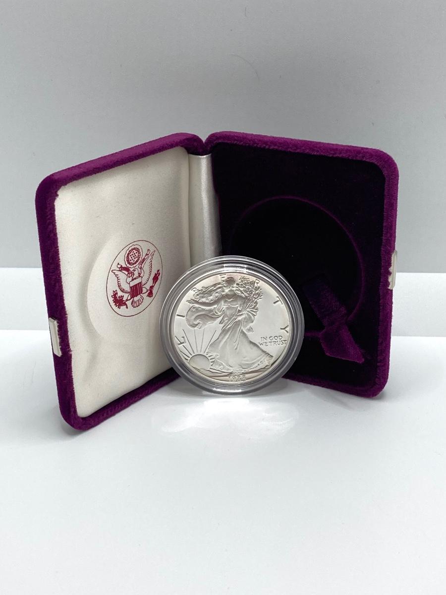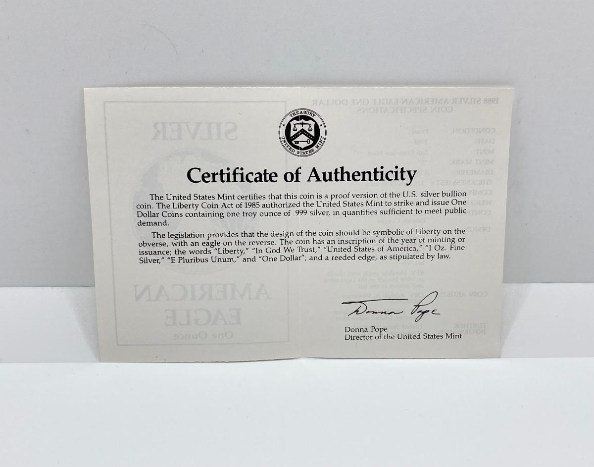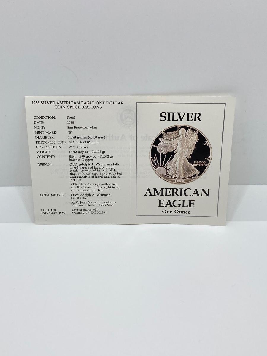 LOT 207J: 1988 American Eagle One Ounce One Dollar Silver Coin with Certificate of Authenticity in Original Presentation Box