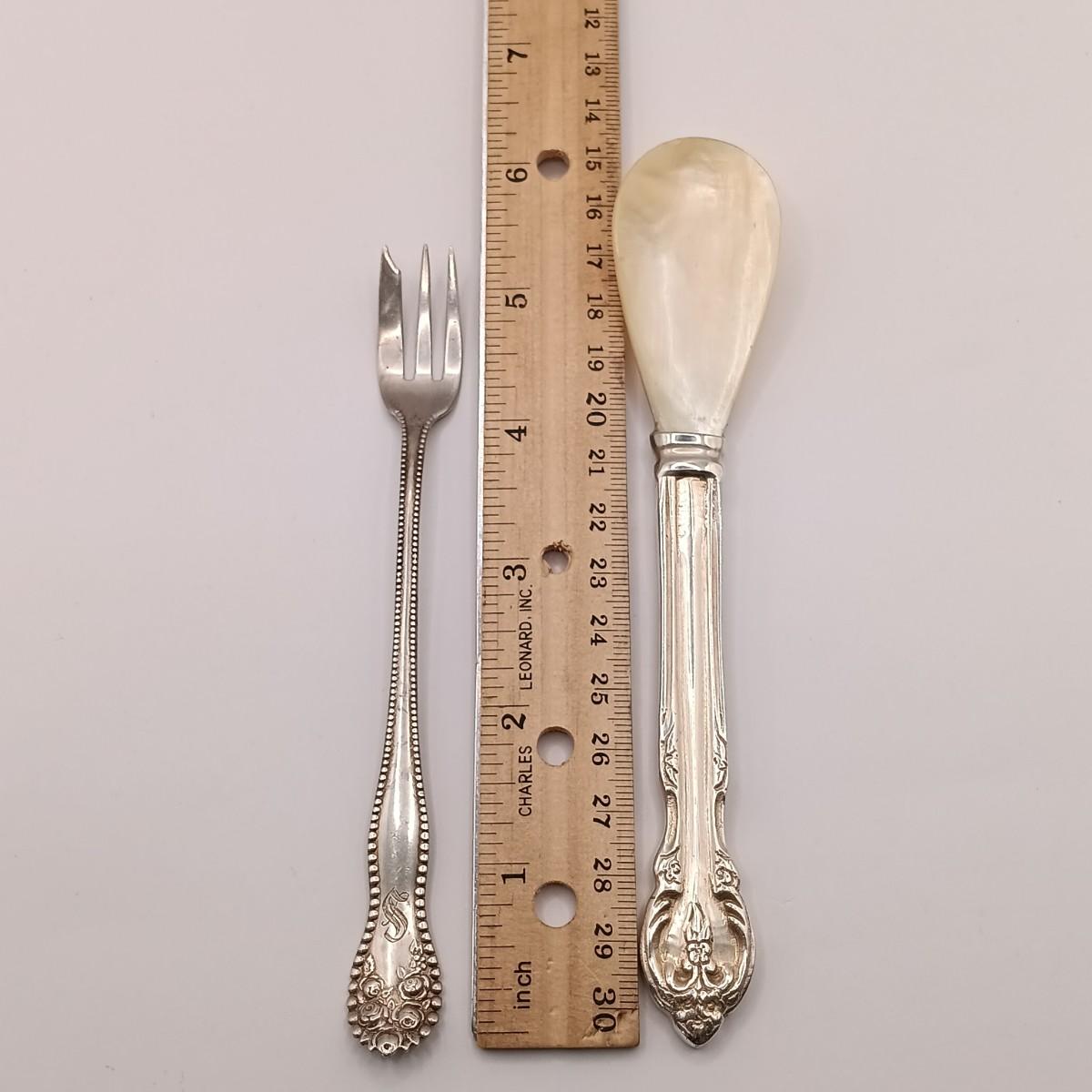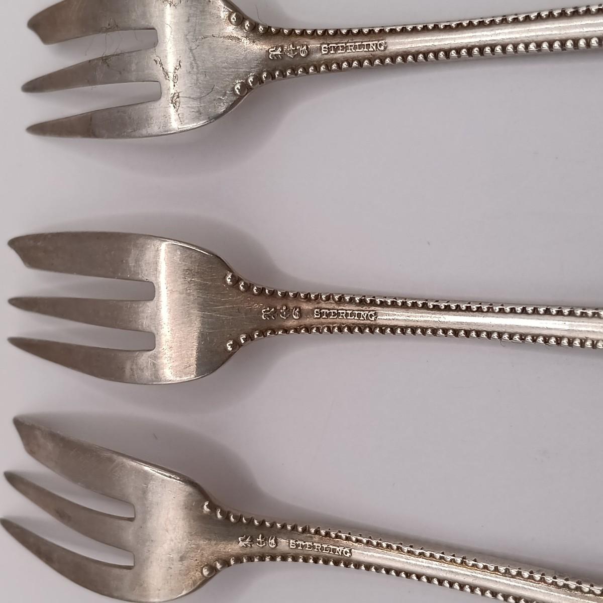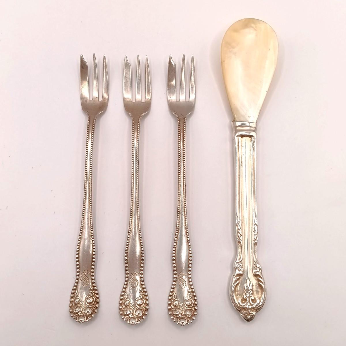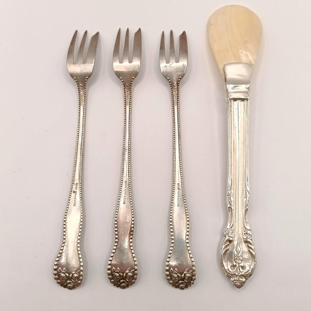 LOT 247: Set of 3 Sterling Silver Henry Kohn & Sons Cocktail Forks 40.32gtw with an Unmarked Silverplate and Shell Spoon