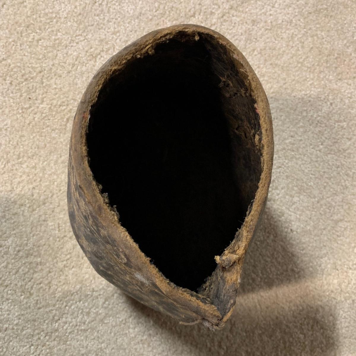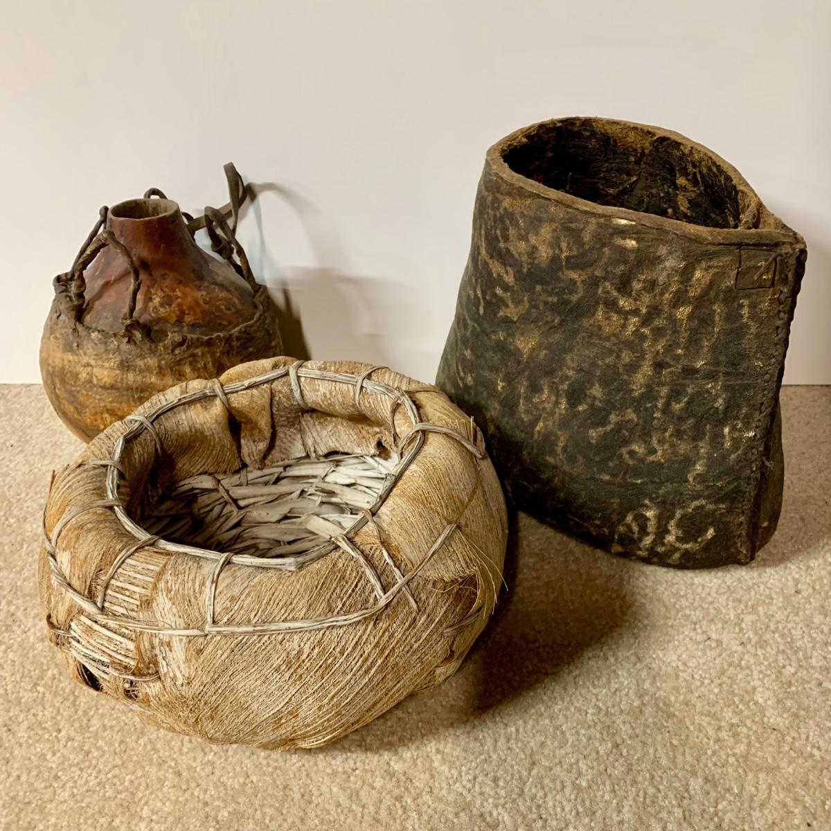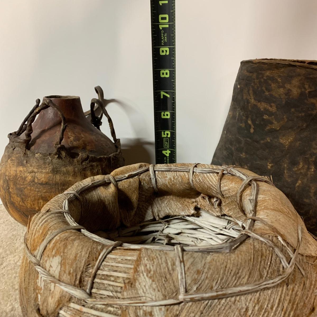 LOT 23 B: Vintage / Antique Gourd Drinking Jug, Woven Coconut Husk Basket, & Stitched Animal Skin Container