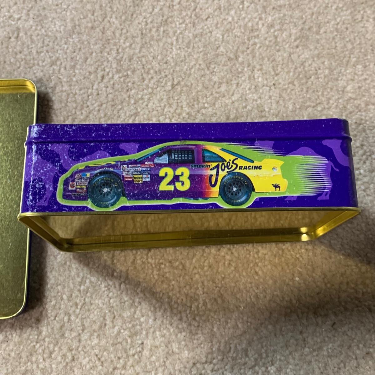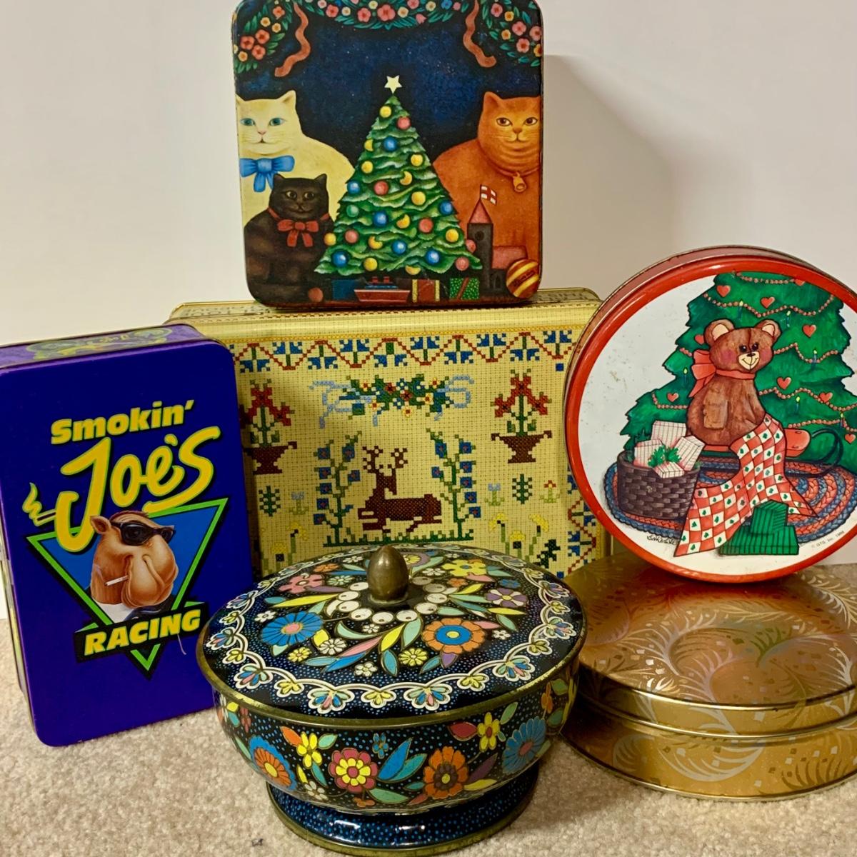 LOT 26 B: Collectible Tin Collection; Smokin' Joe's Racing, Enamel Footed Spinning Candy Tin, & More