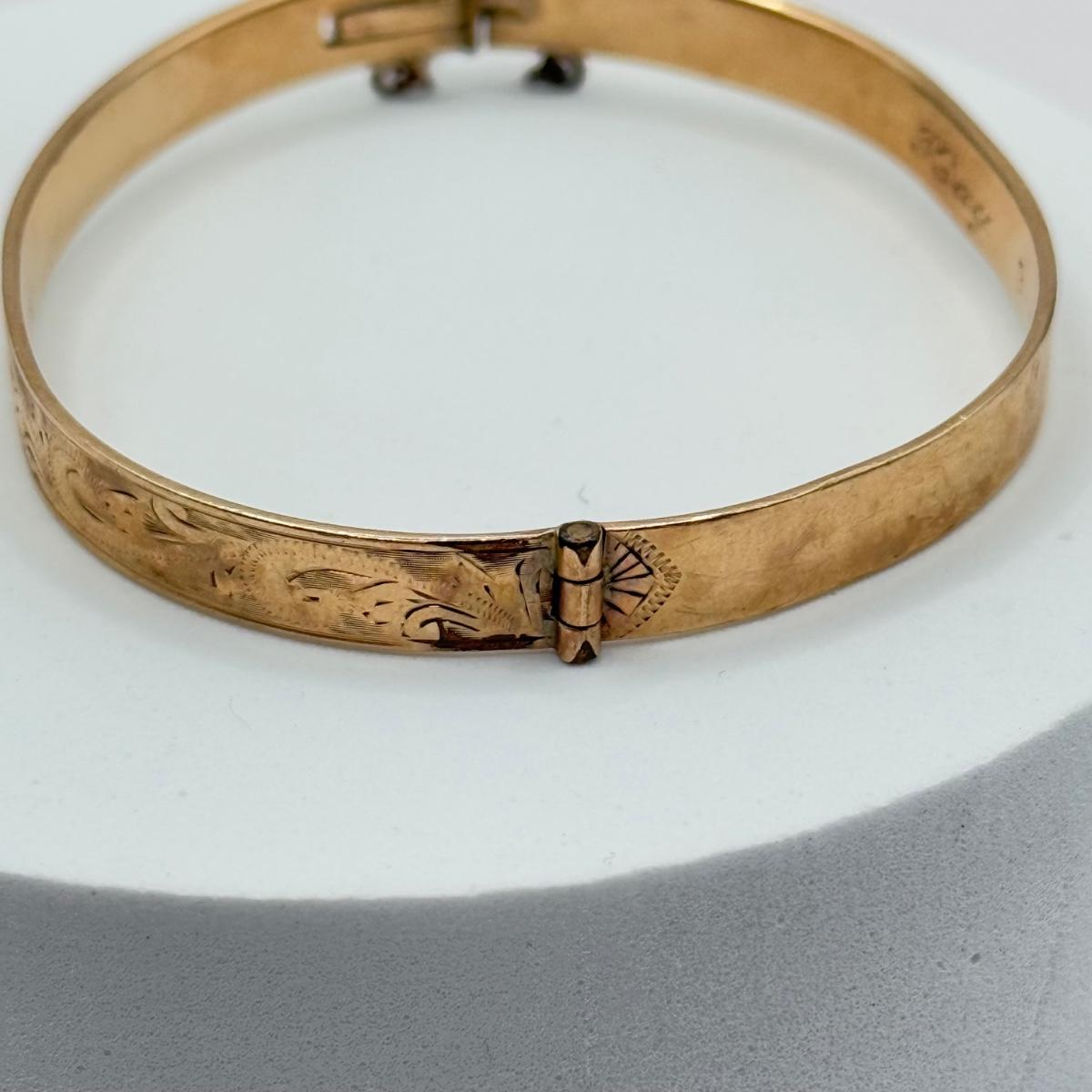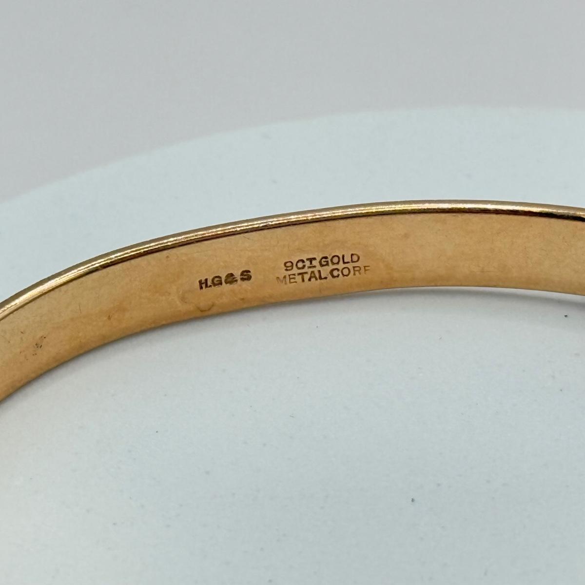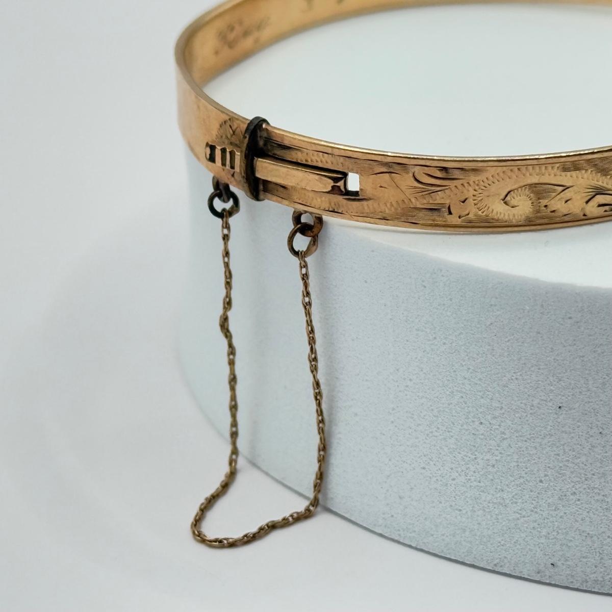 LOT 79J: Vintage 9ct Rolled Gold w/ Metal Core HG&S Hinged Bangle Bracelet w/ Safety Chain (12.9g)