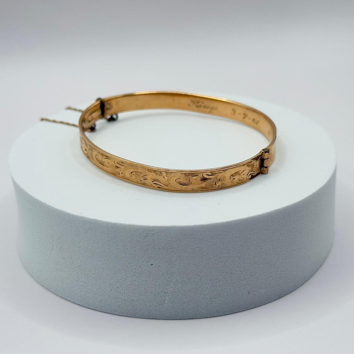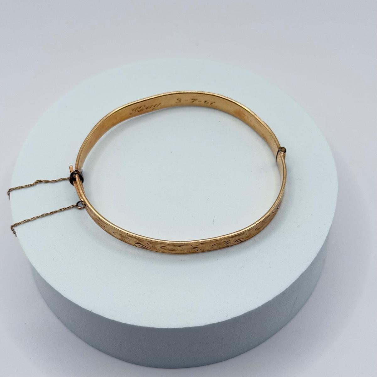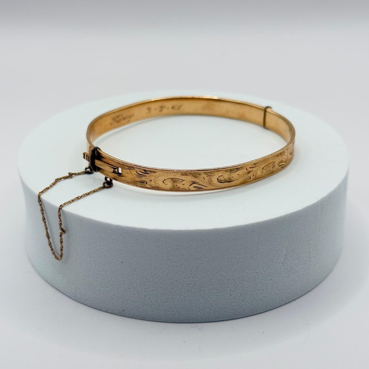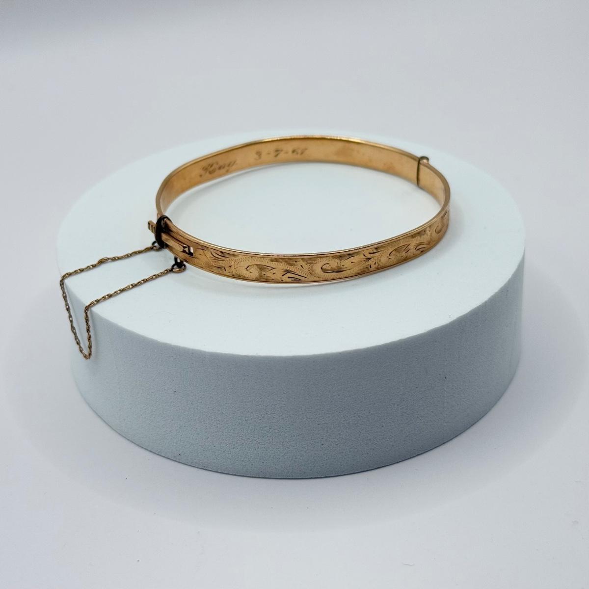 LOT 79J: Vintage 9ct Rolled Gold w/ Metal Core HG&S Hinged Bangle Bracelet w/ Safety Chain (12.9g)