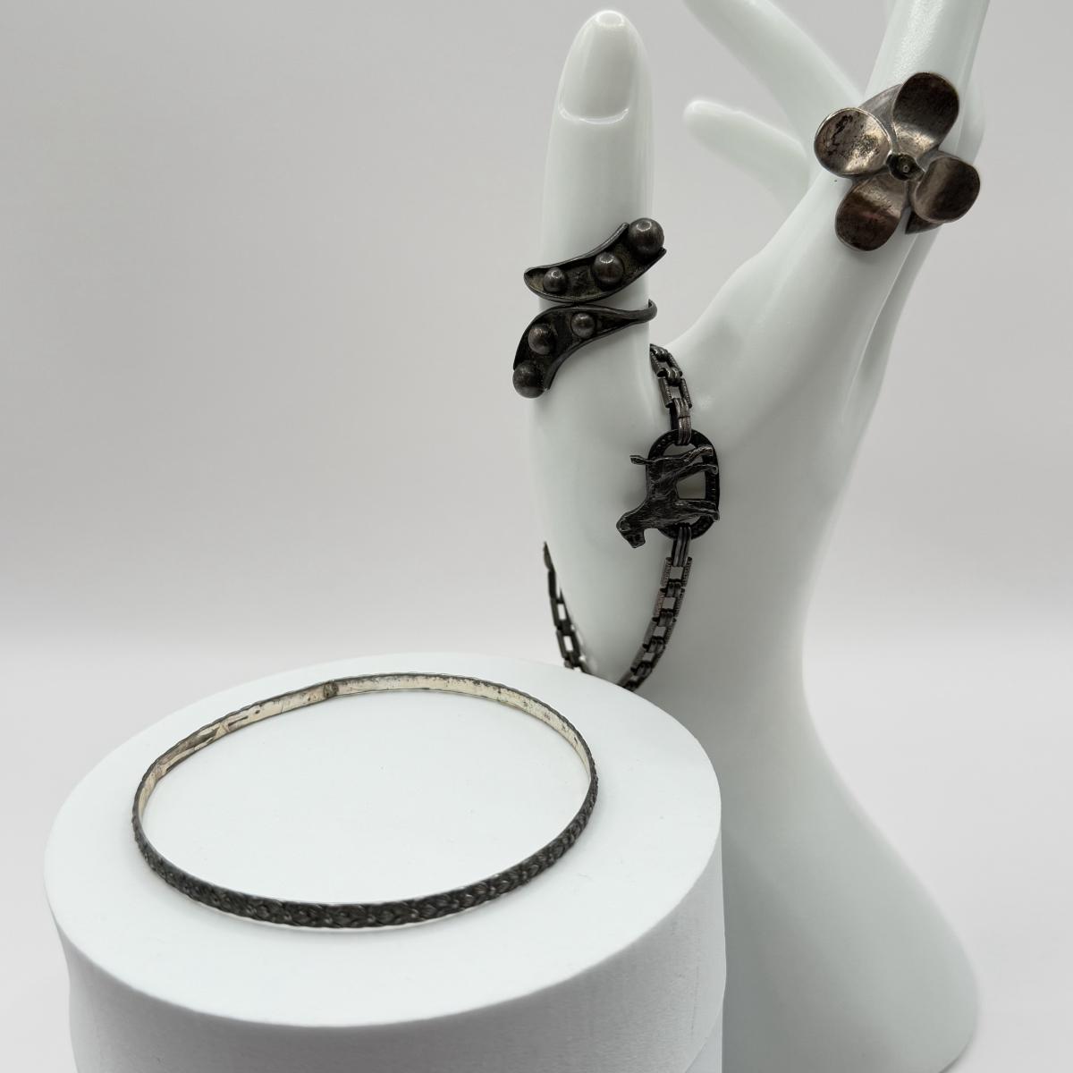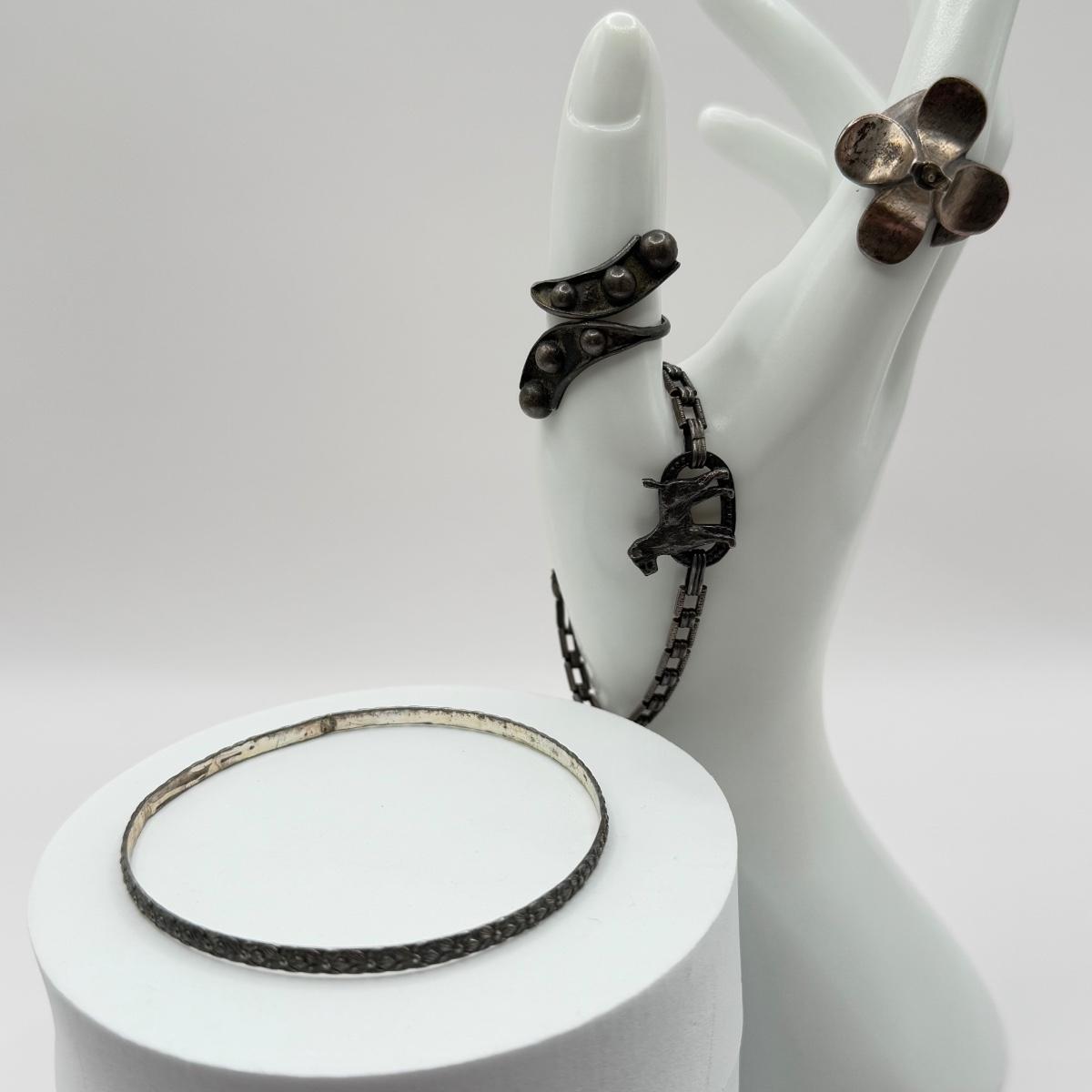 LOT 80J: Vintage Sterling Silver Jewelry - 6” Terrier Bracelet, Bangle & 2 Rings (29.0g)