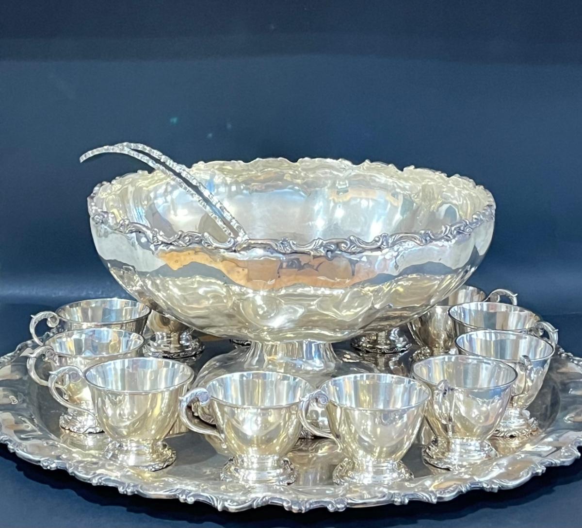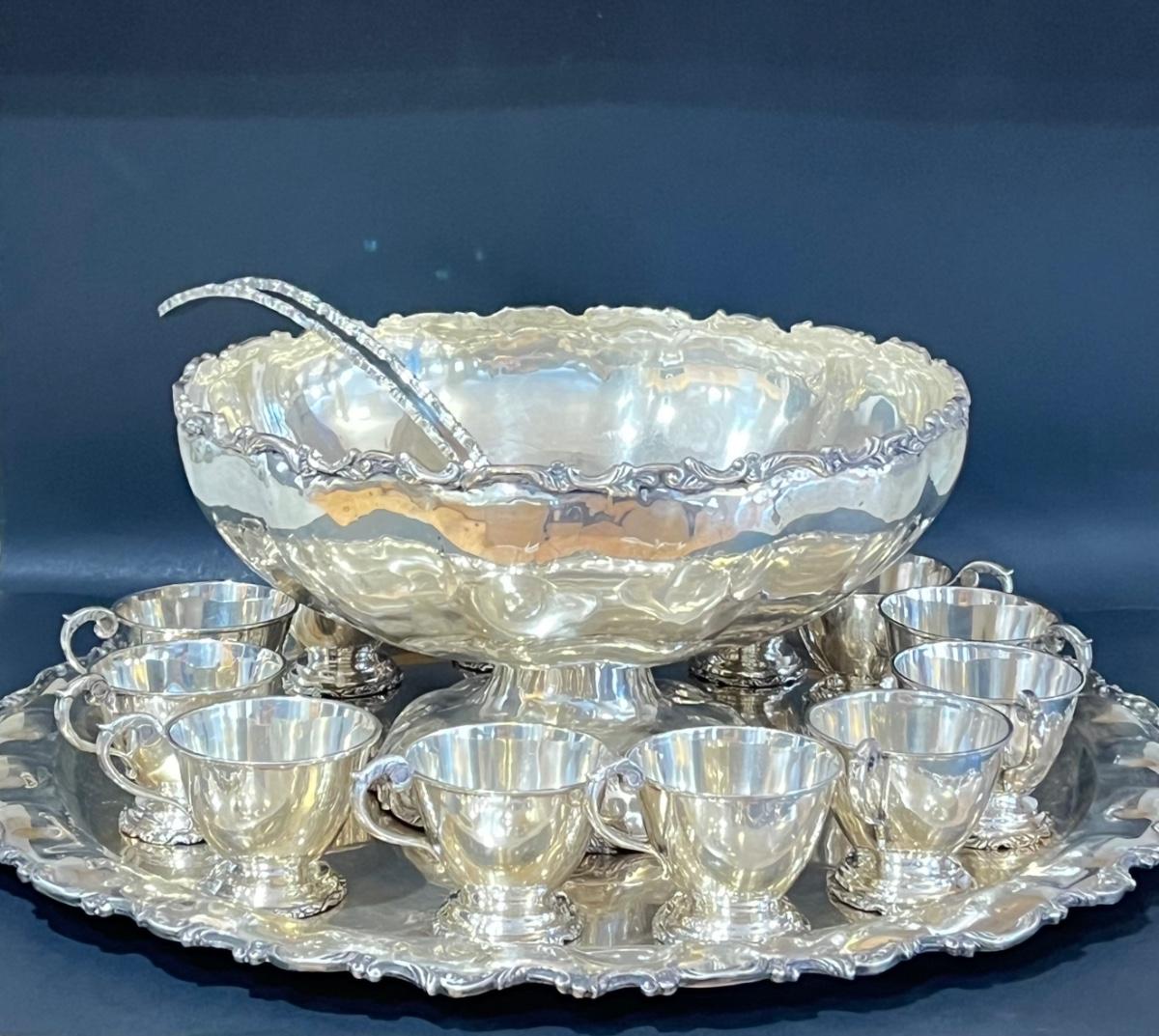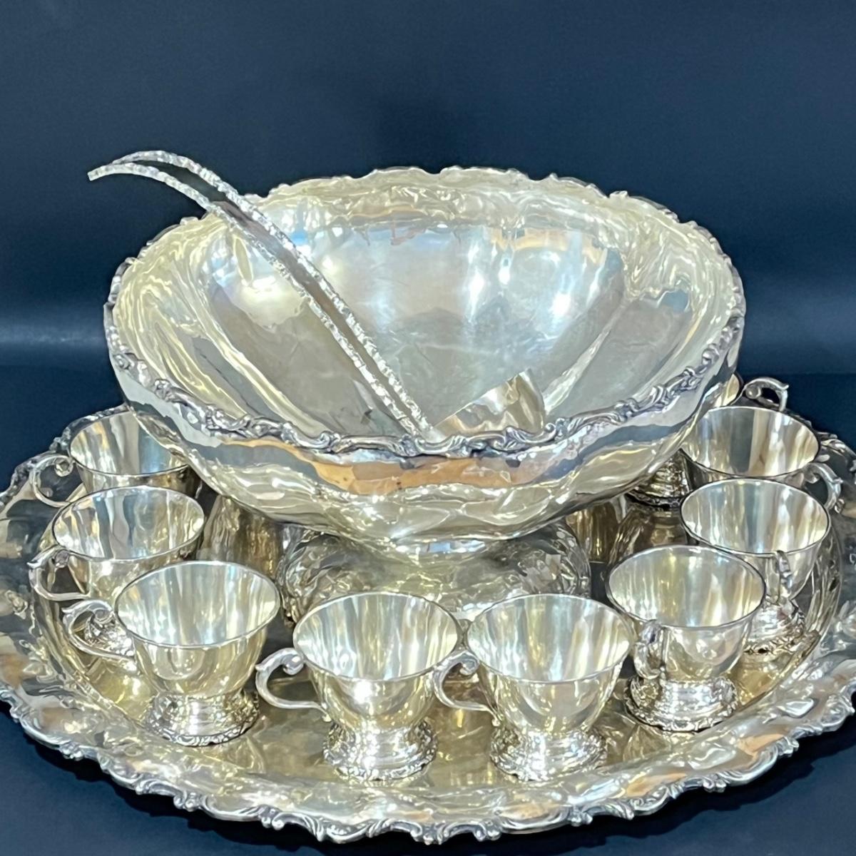 This set includes a large punch bowl and platter, along with a ladle and 12 cups and is a combined total of 7,794 grams of sterling silver.