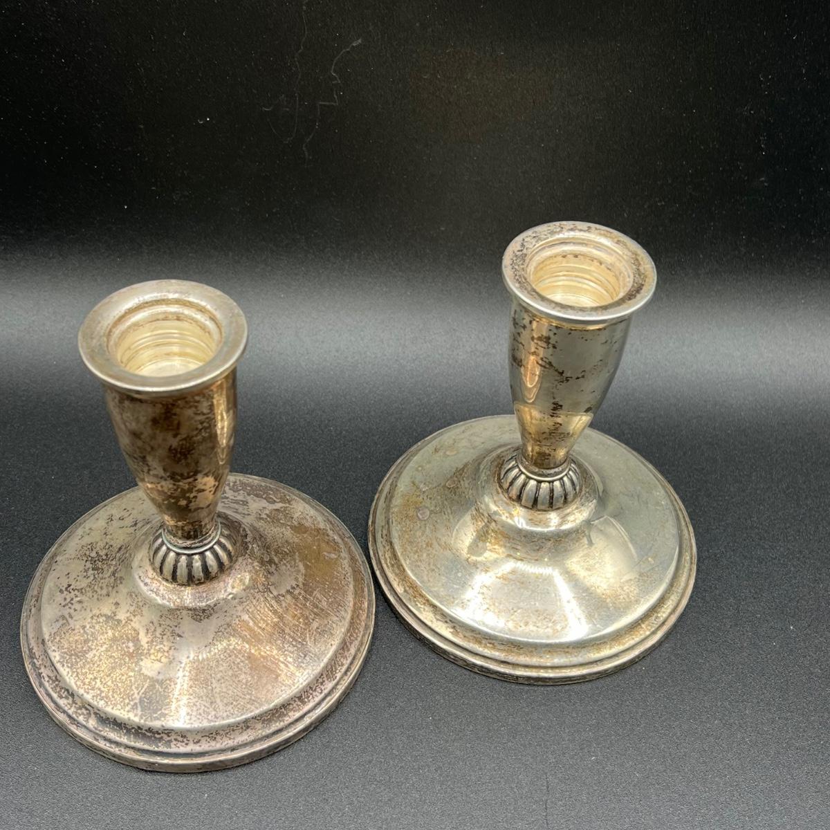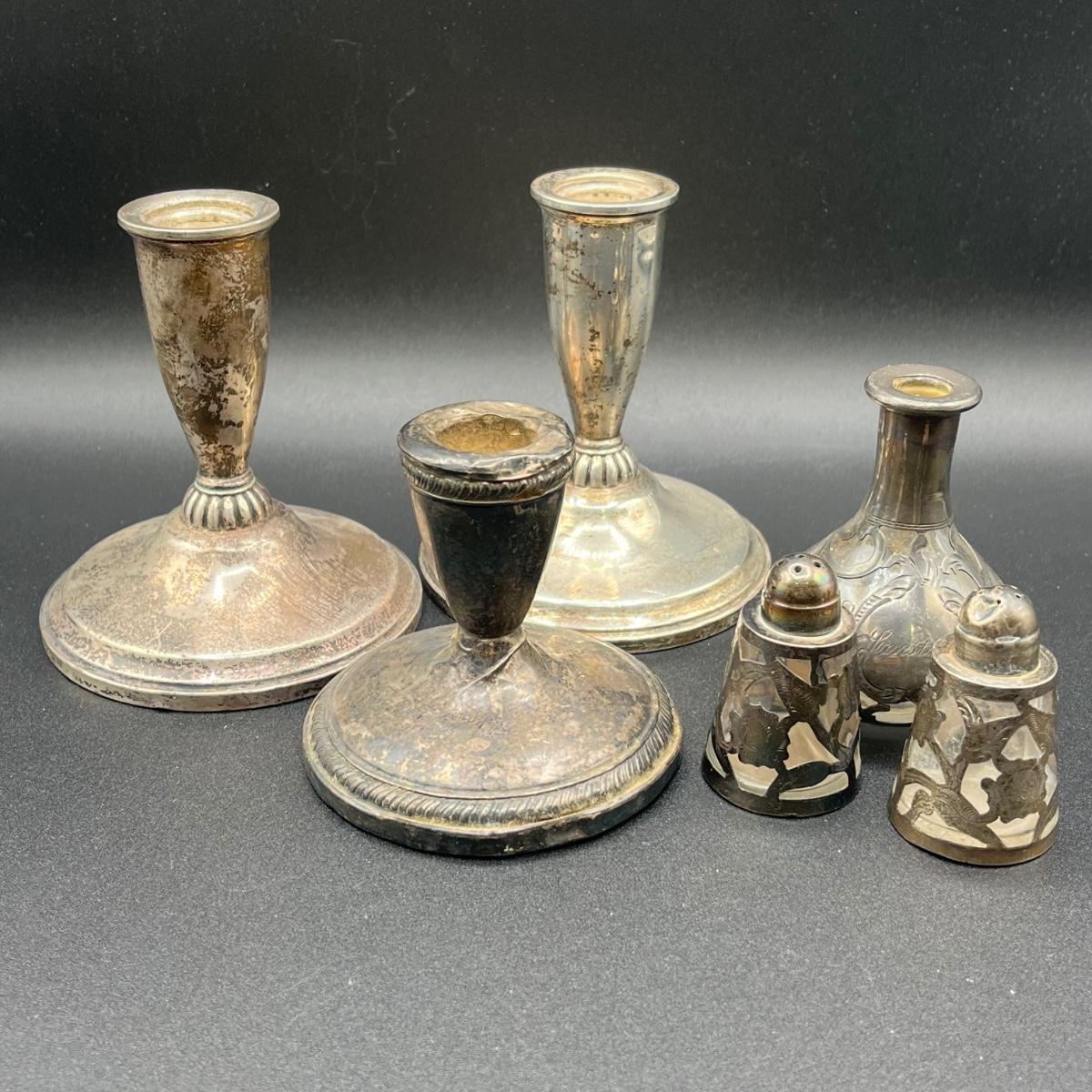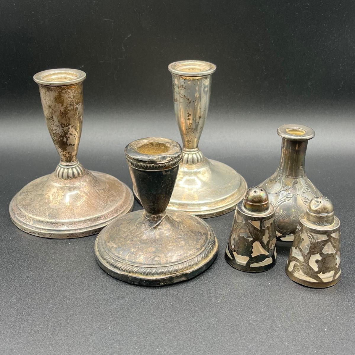 LOT 125K: Weighted Sterling Silver Candlesticks and Sterling Over Glass Bottle and Salt and Pepper Shakers
