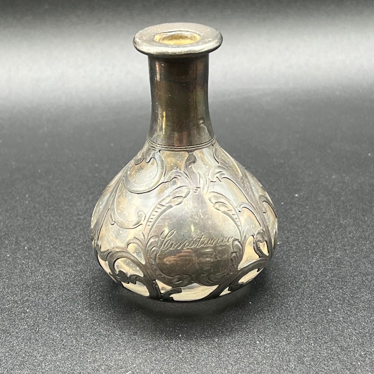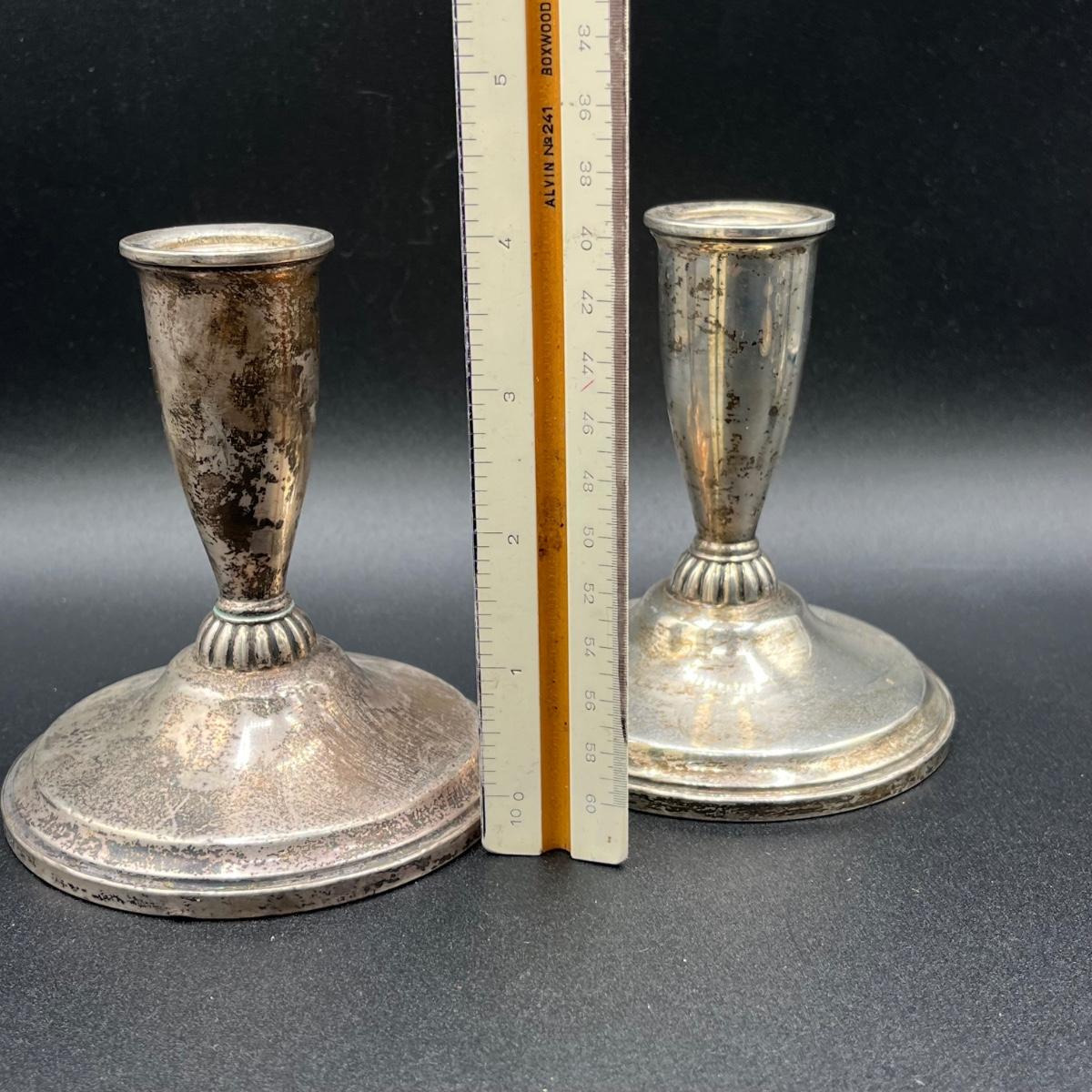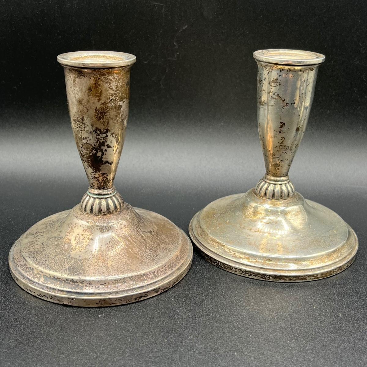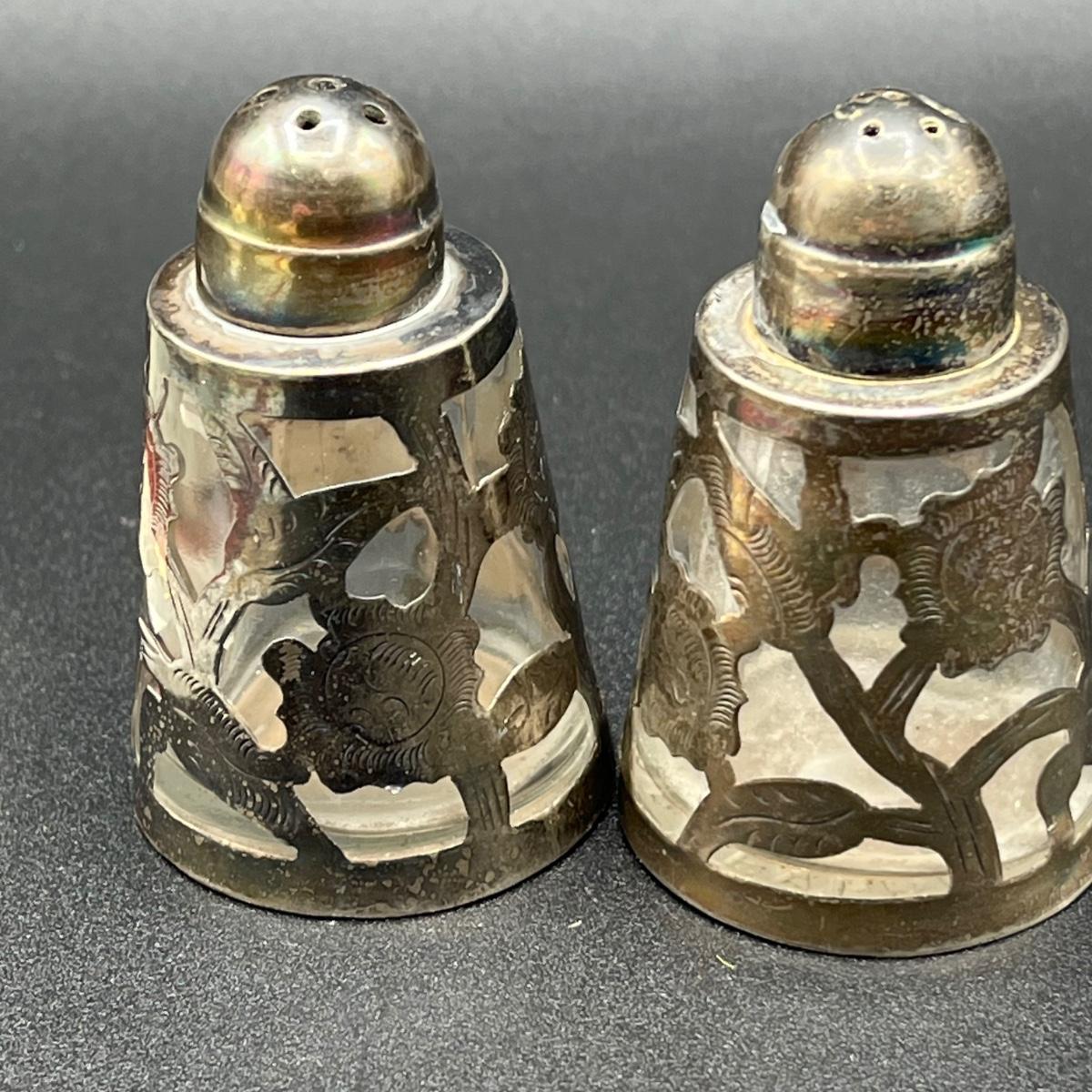 LOT 125K: Weighted Sterling Silver Candlesticks and Sterling Over Glass Bottle and Salt and Pepper Shakers