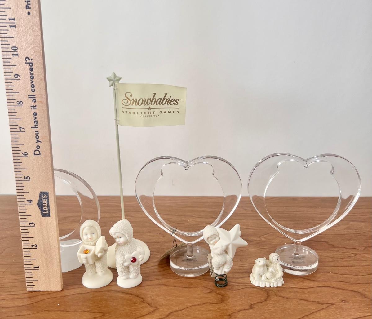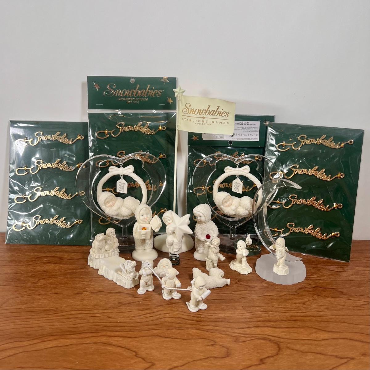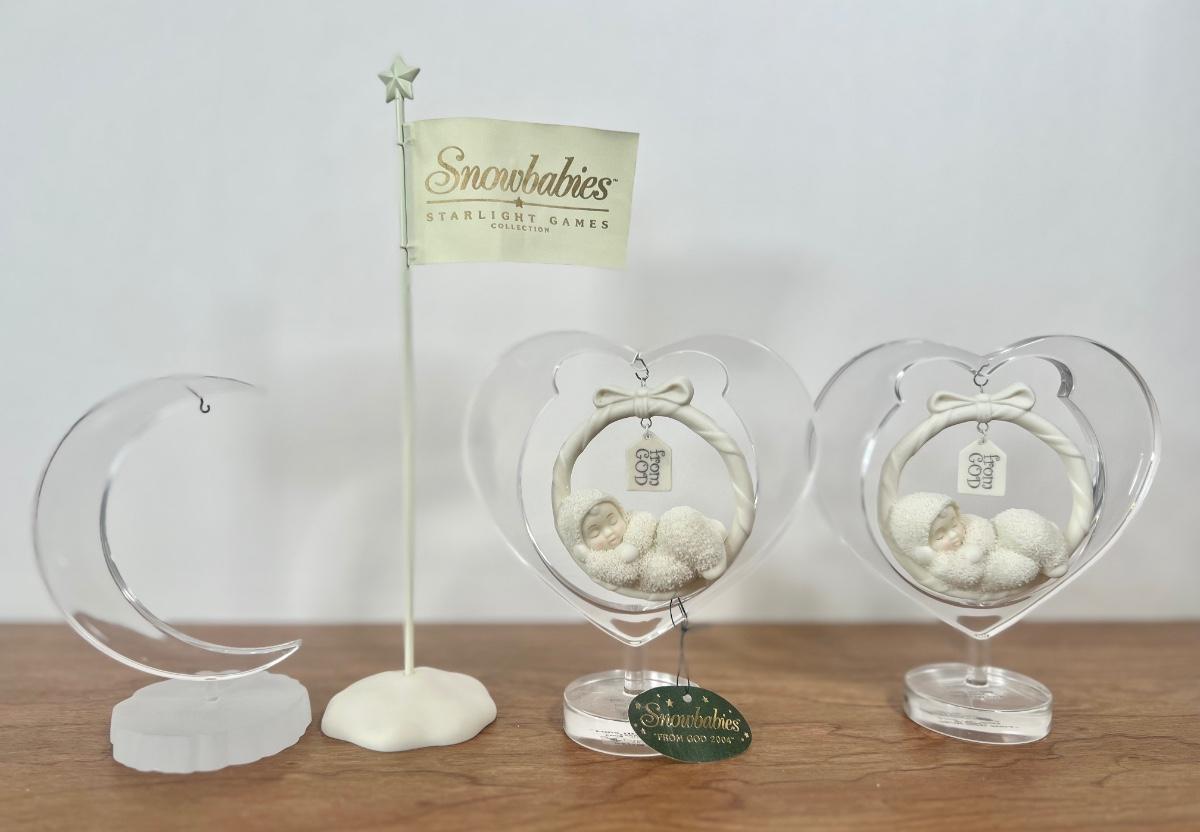 LOT 28B: Department 56 Snowbabies & Accessories - Starlight Games Flag, Miniature Figurines, Birthstone Figures, Pins, NIP Ornament Hangers & More