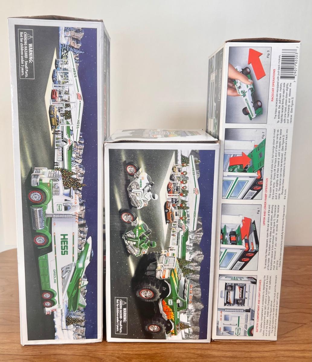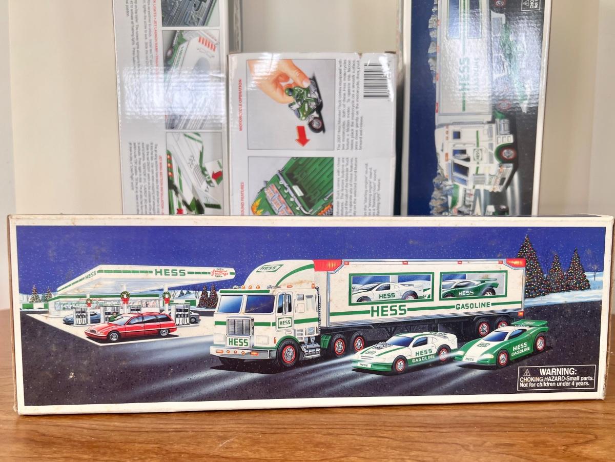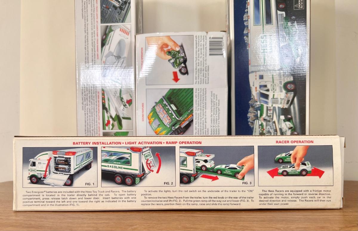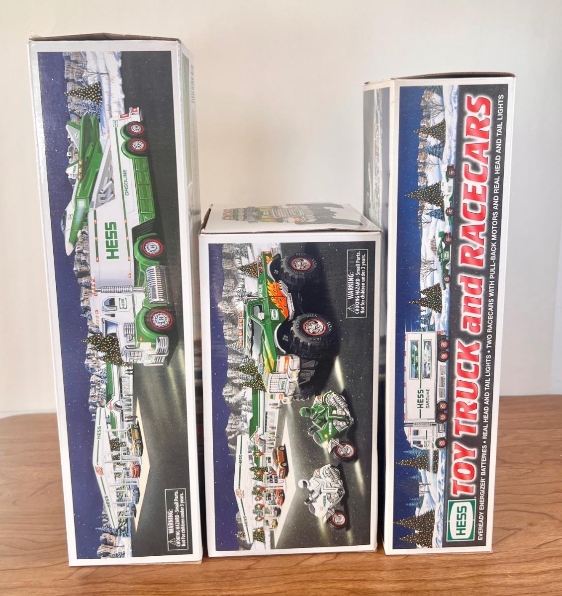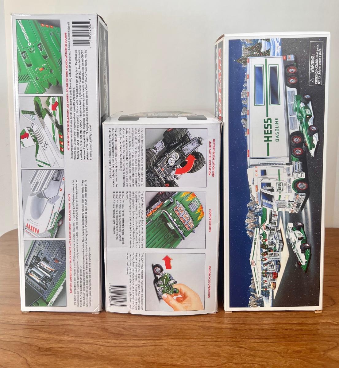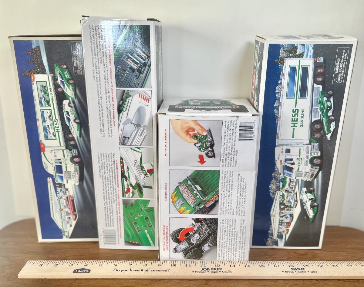 LOT 30B: Hess Trucks w/ Boxes - Monster Truck w/ Motorcycles, Toy Truck and Jet & Toy Truck and Racecars