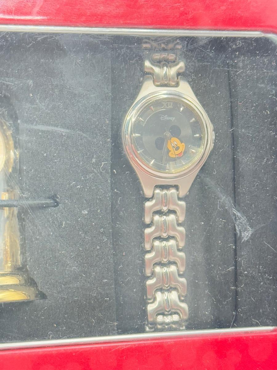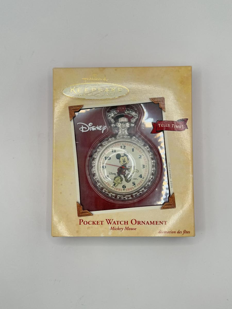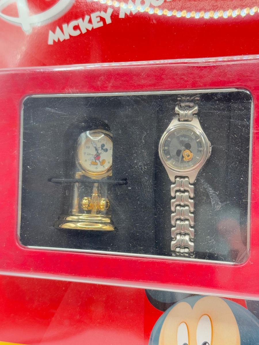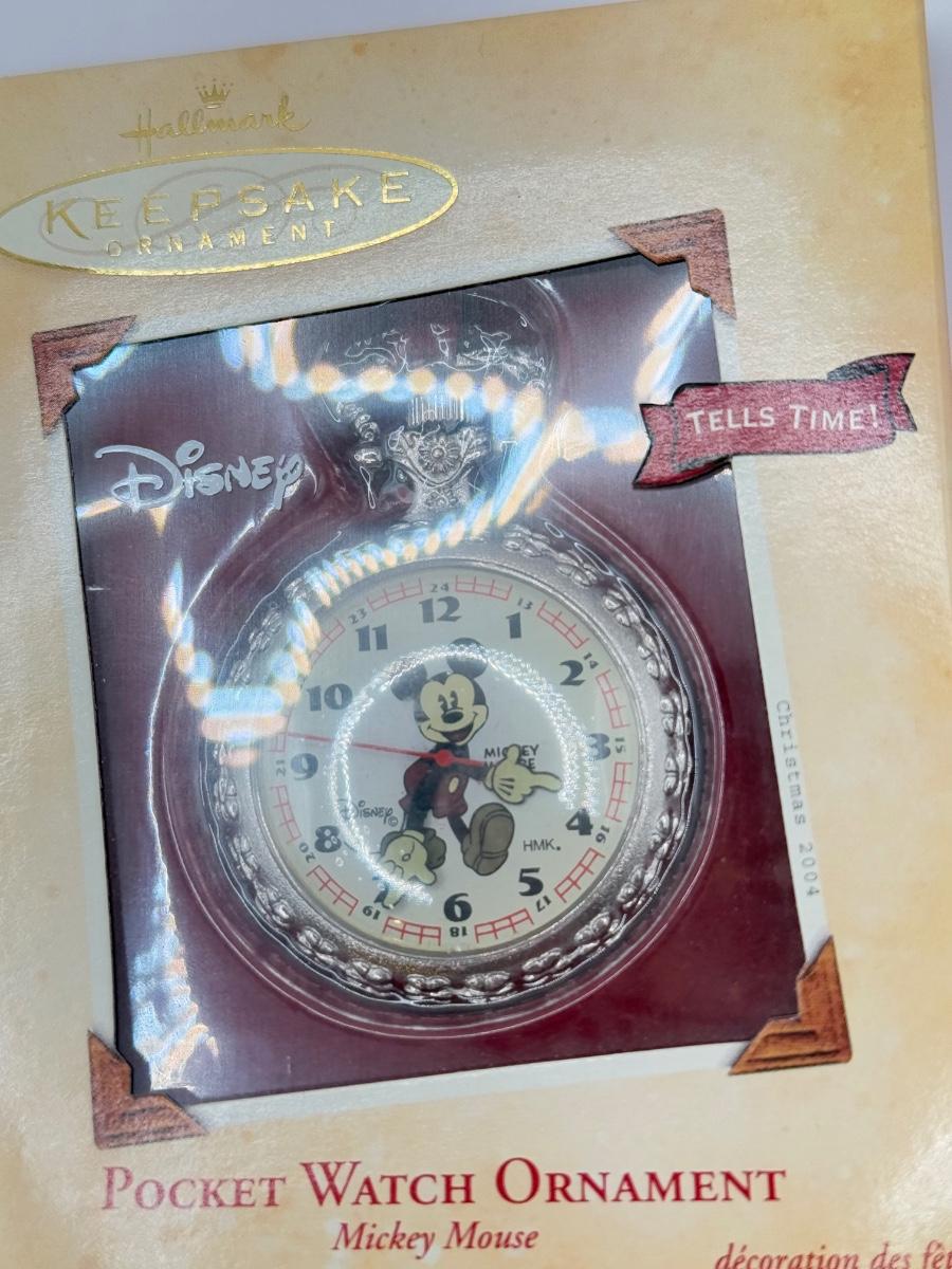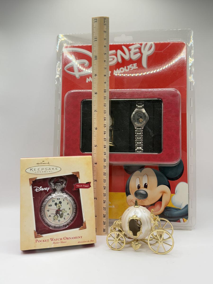 LOT 81B: NIP Disney Hallmark Keepsake Mickey Mouse Pocket Watch, NIP Mickey Watch & Mantle Clock Set & Cinderella's Coach