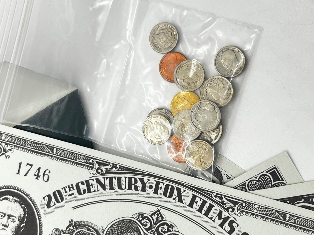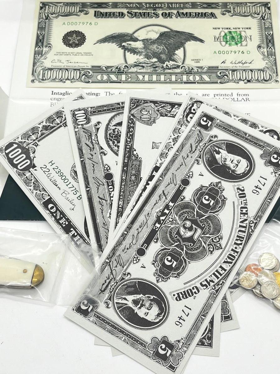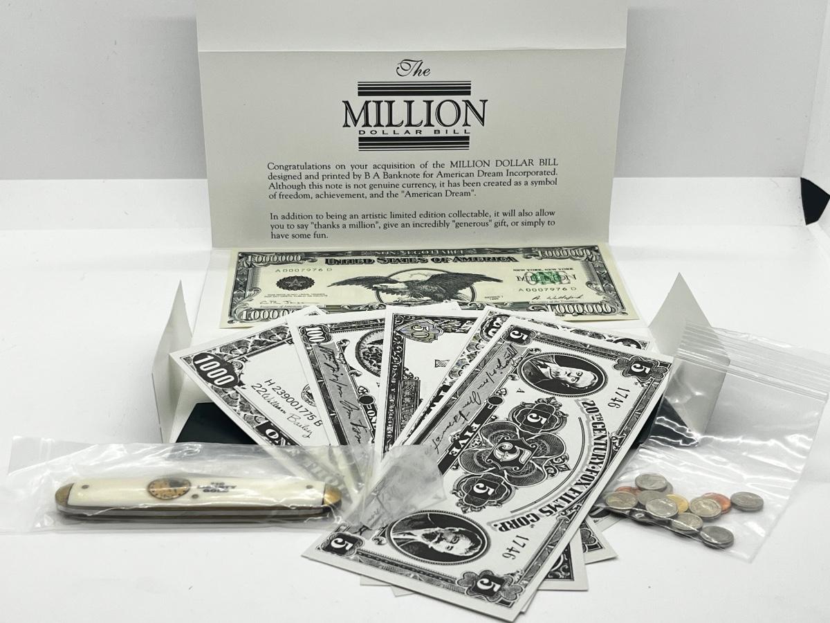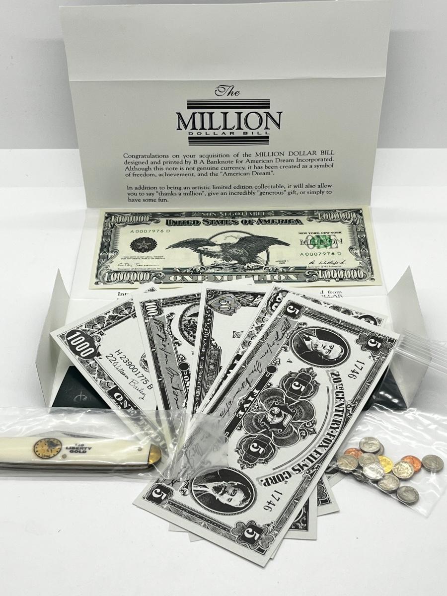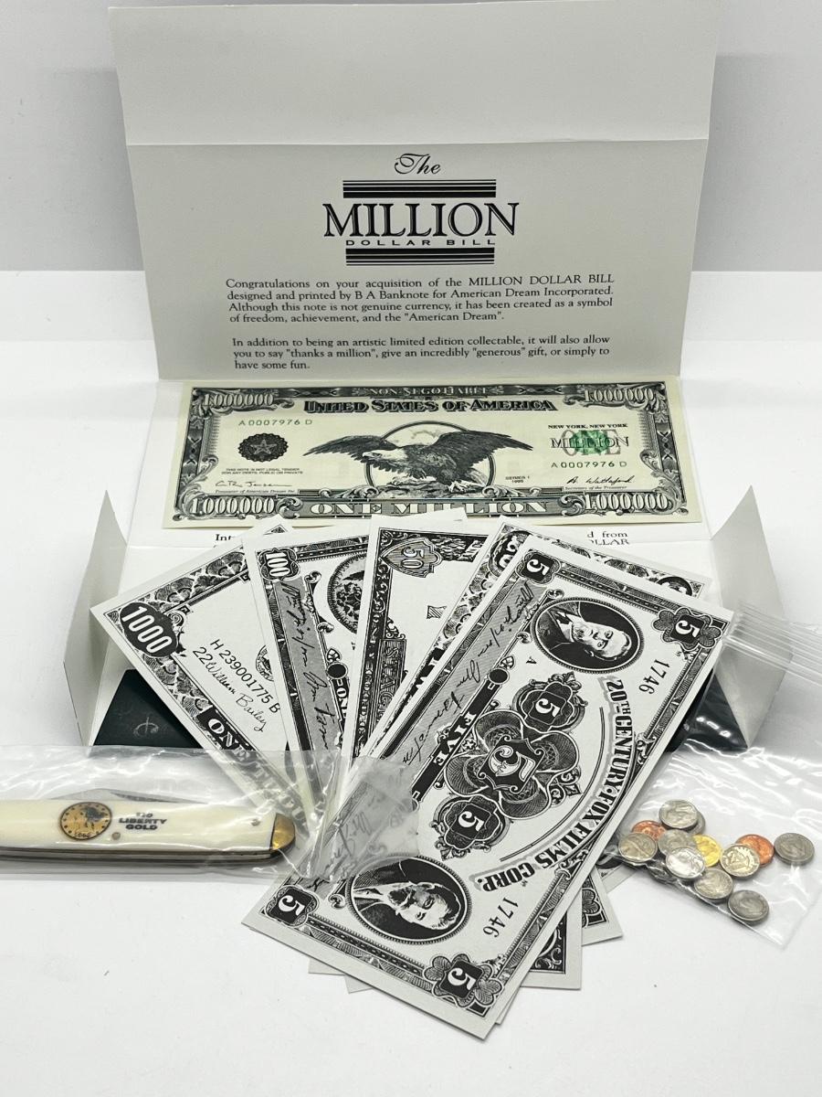 LOT 190J: Currency Collector Lot: Million Dollar Bill, Movie Money, Mini Coins and Pocket Knife