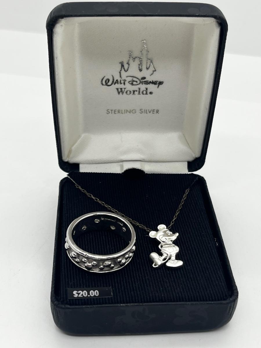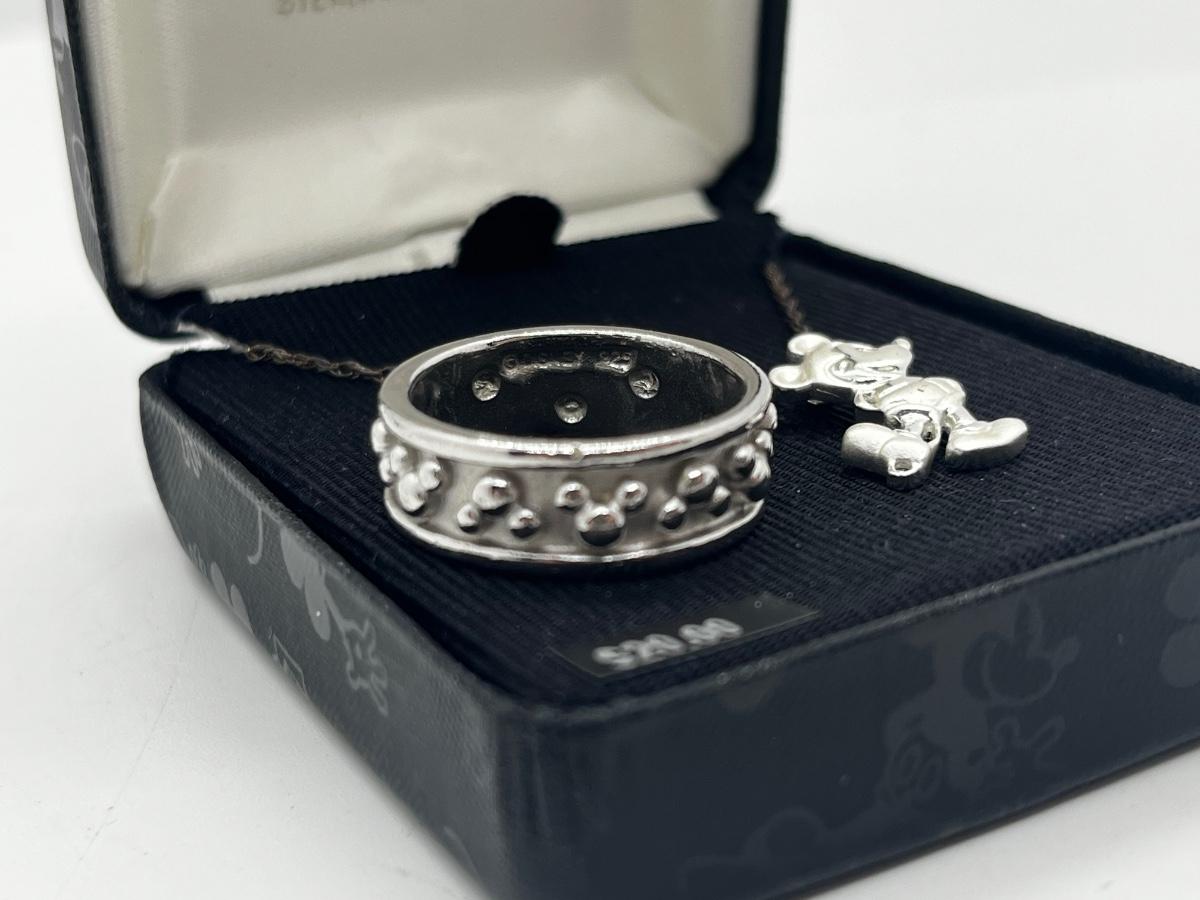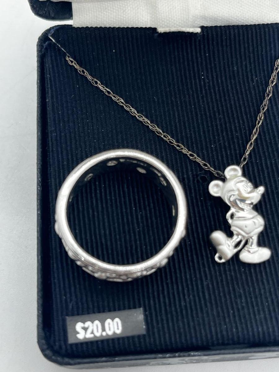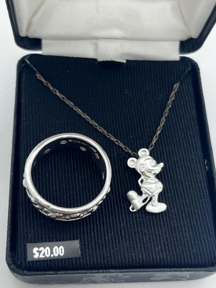 LOT 209J: Sterling Mickey Mouse Size 8.5 Ring and Sterling 18" Chain with Mickey Mouse Charm-7.93 Grams