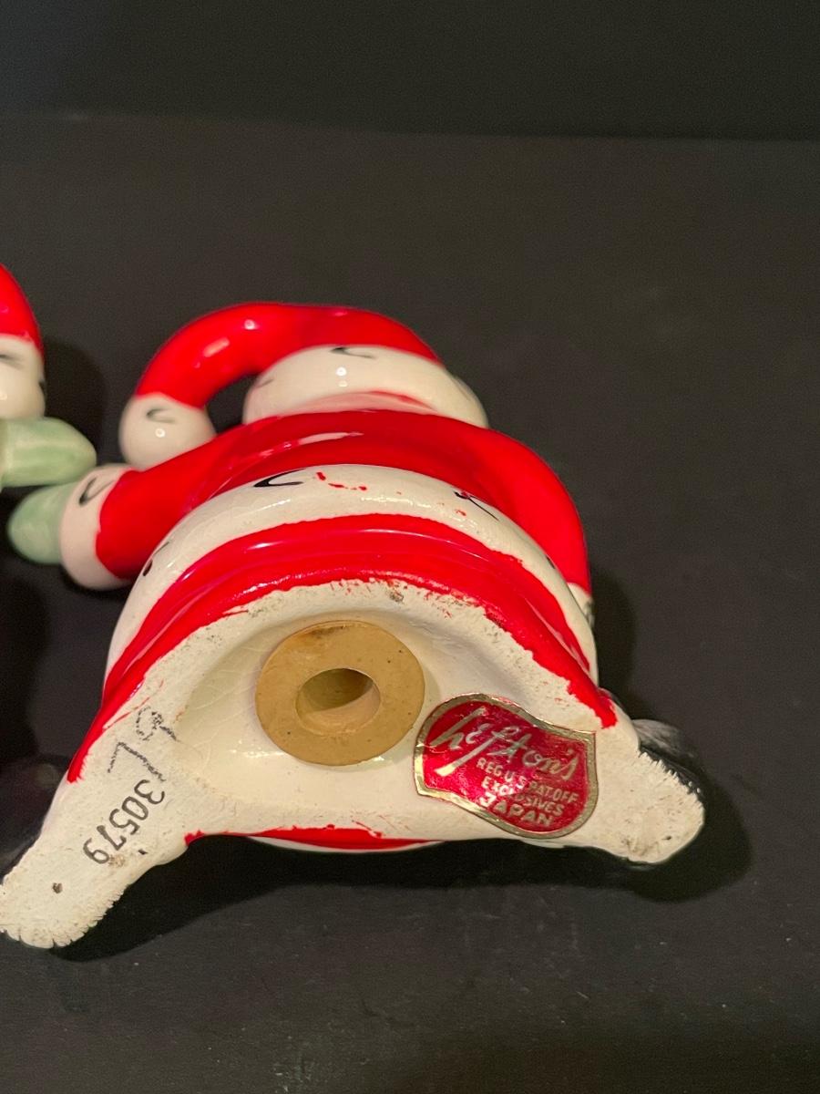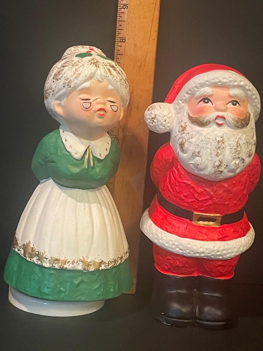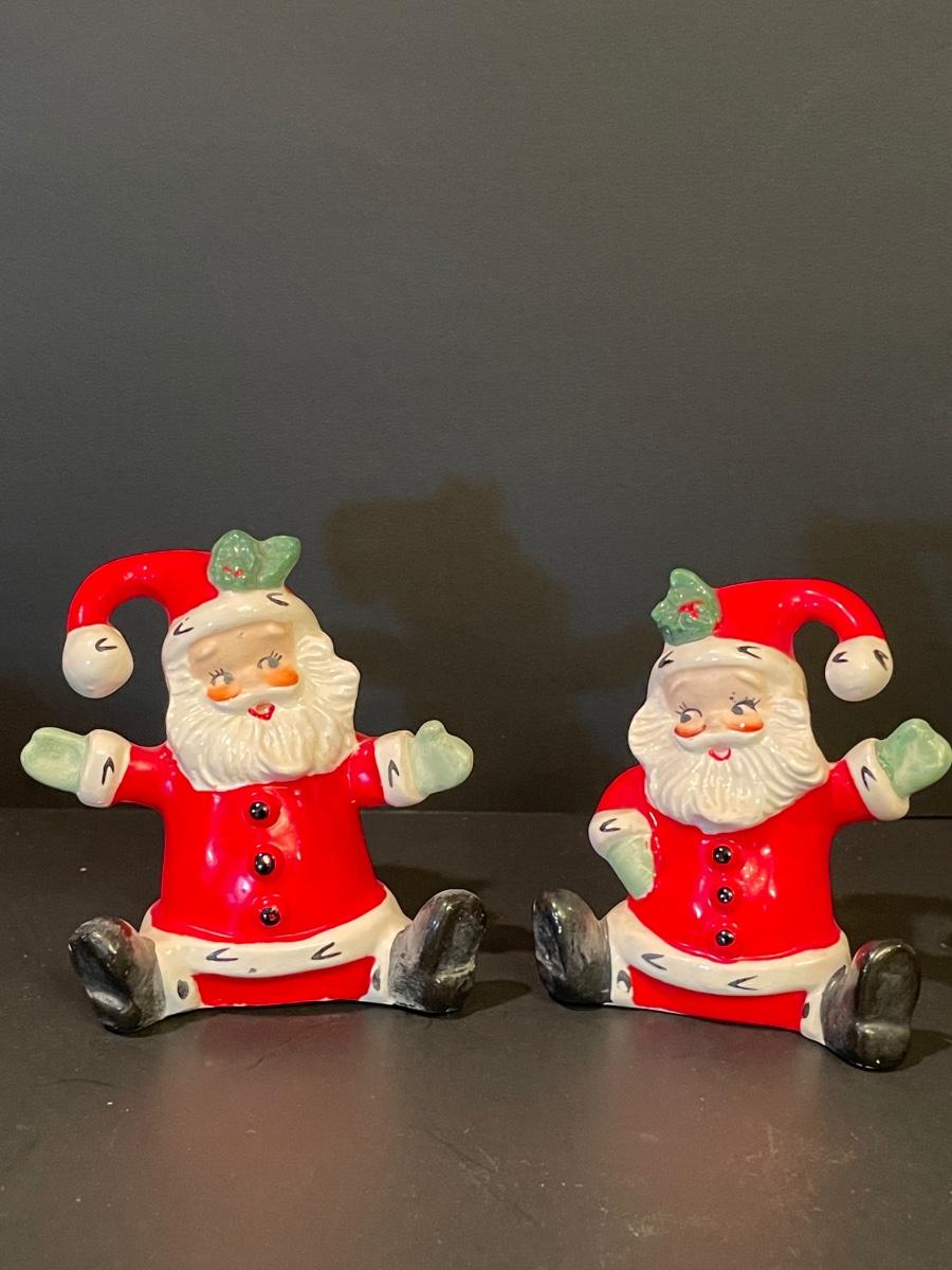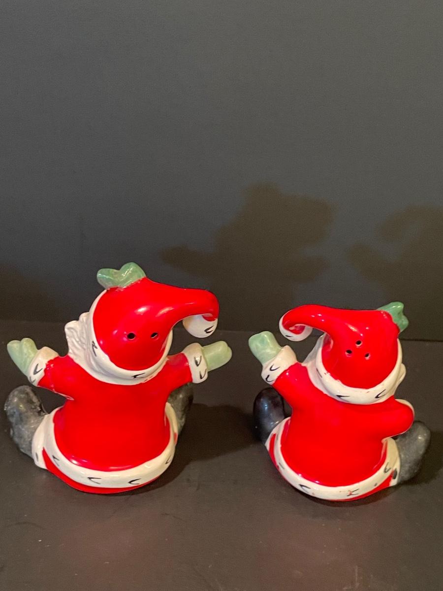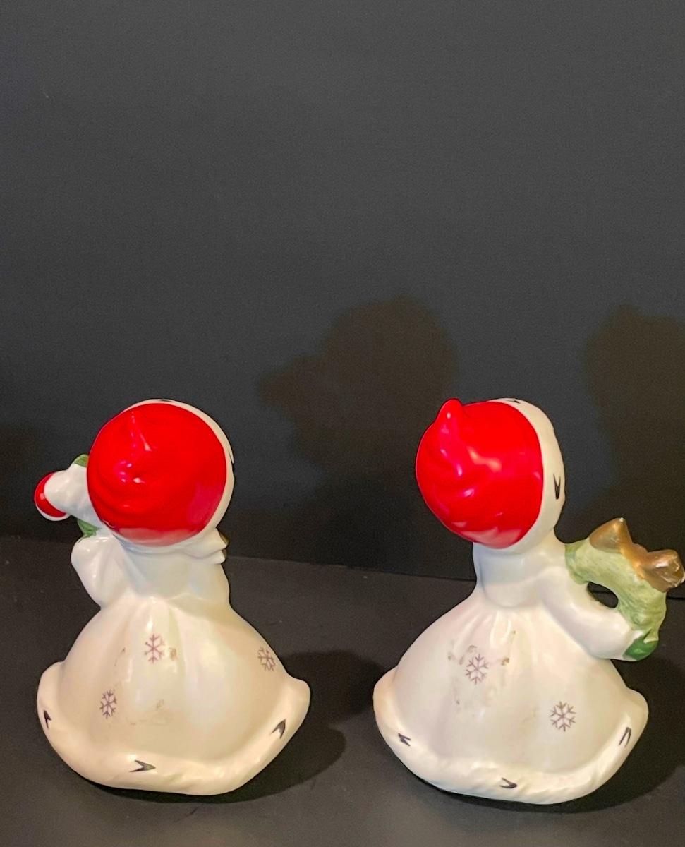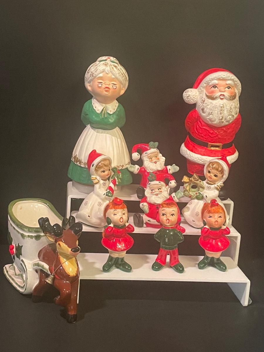 LOT::3 Christmas Figurines Santa and Mrs. Claus, Napco Ceramic Reindeer and Sleigh, Christmas Baby Figurines by Napcoware, Salt & Pepper Shakers, and Christmas Caroler fig