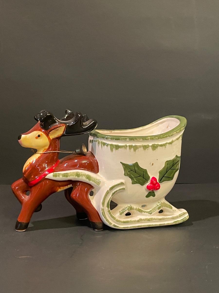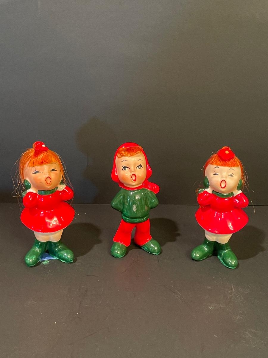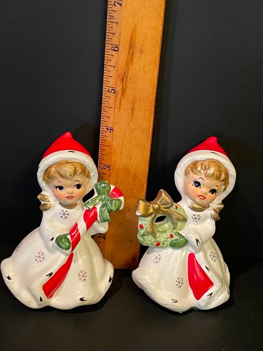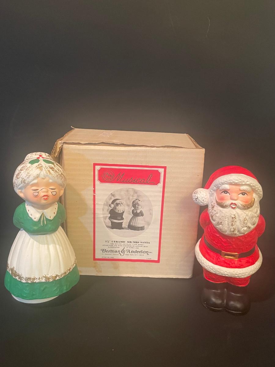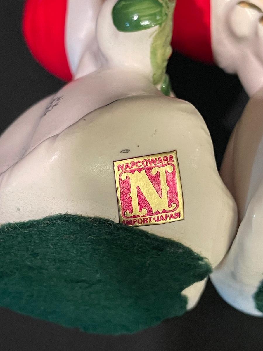 LOT::3 Christmas Figurines Santa and Mrs. Claus, Napco Ceramic Reindeer and Sleigh, Christmas Baby Figurines by Napcoware, Salt & Pepper Shakers, and Christmas Caroler fig