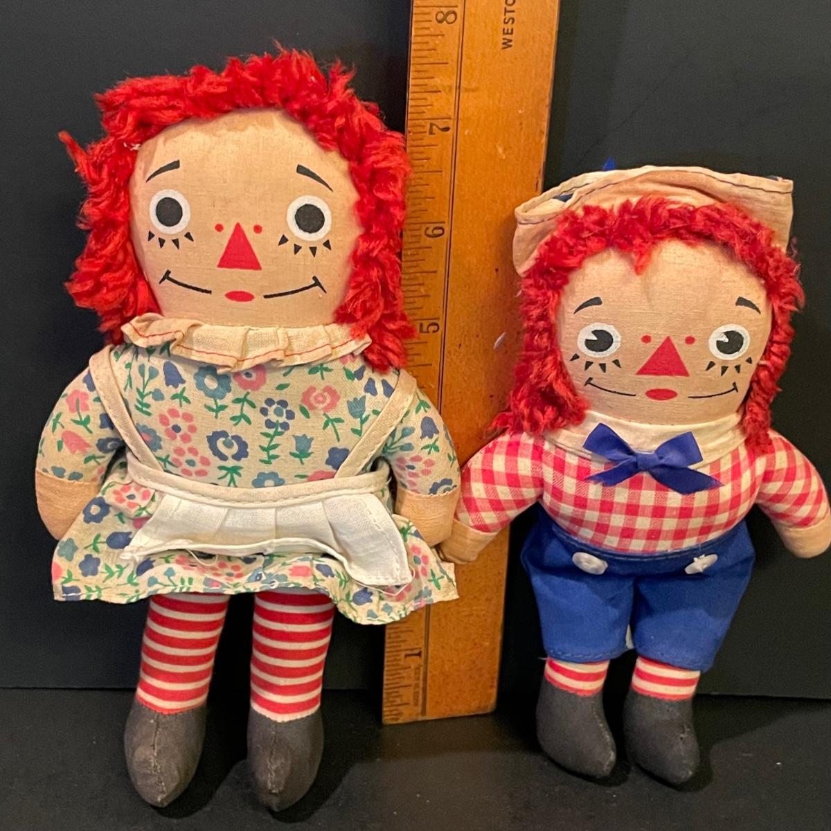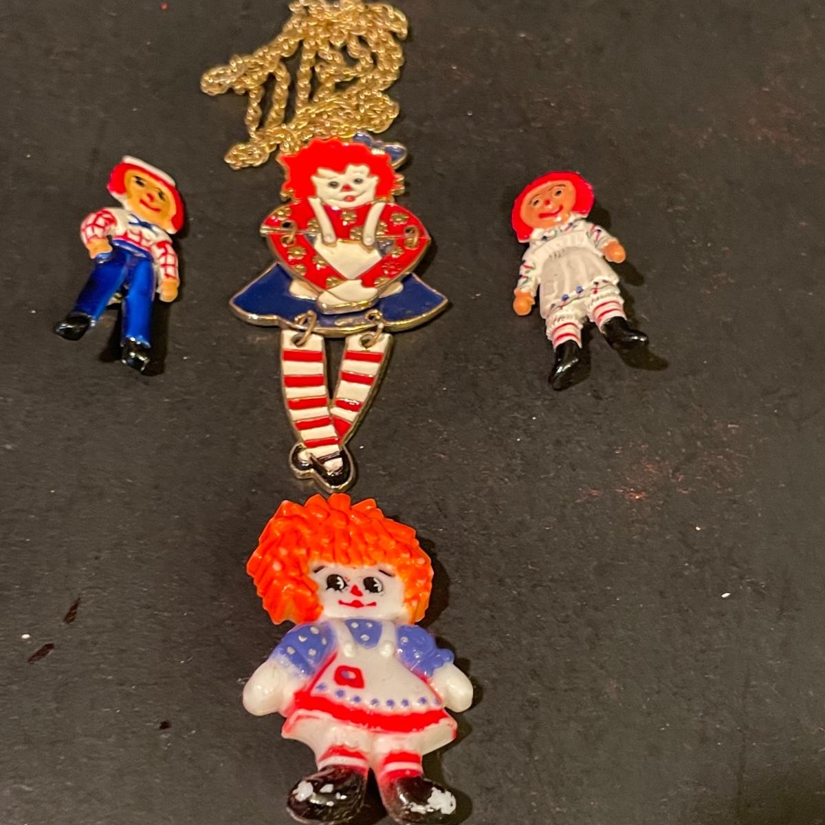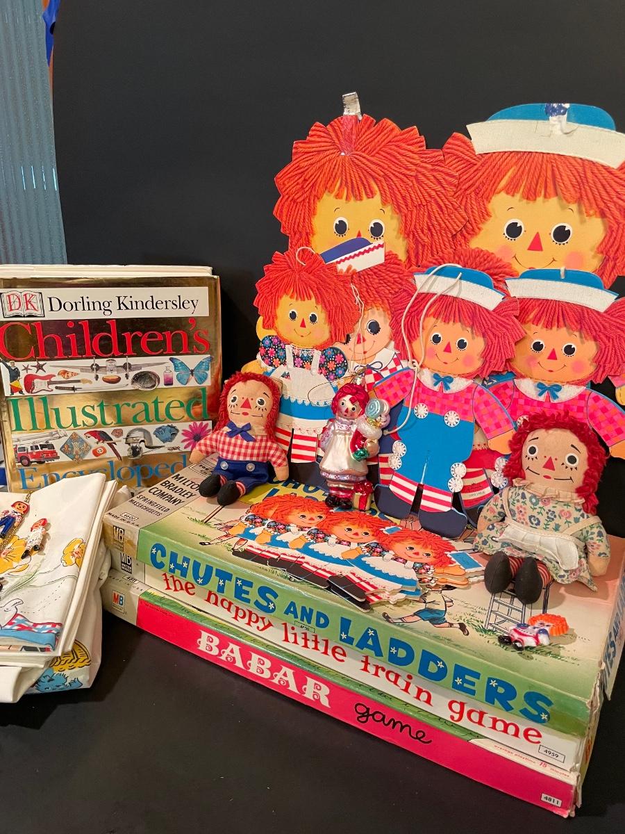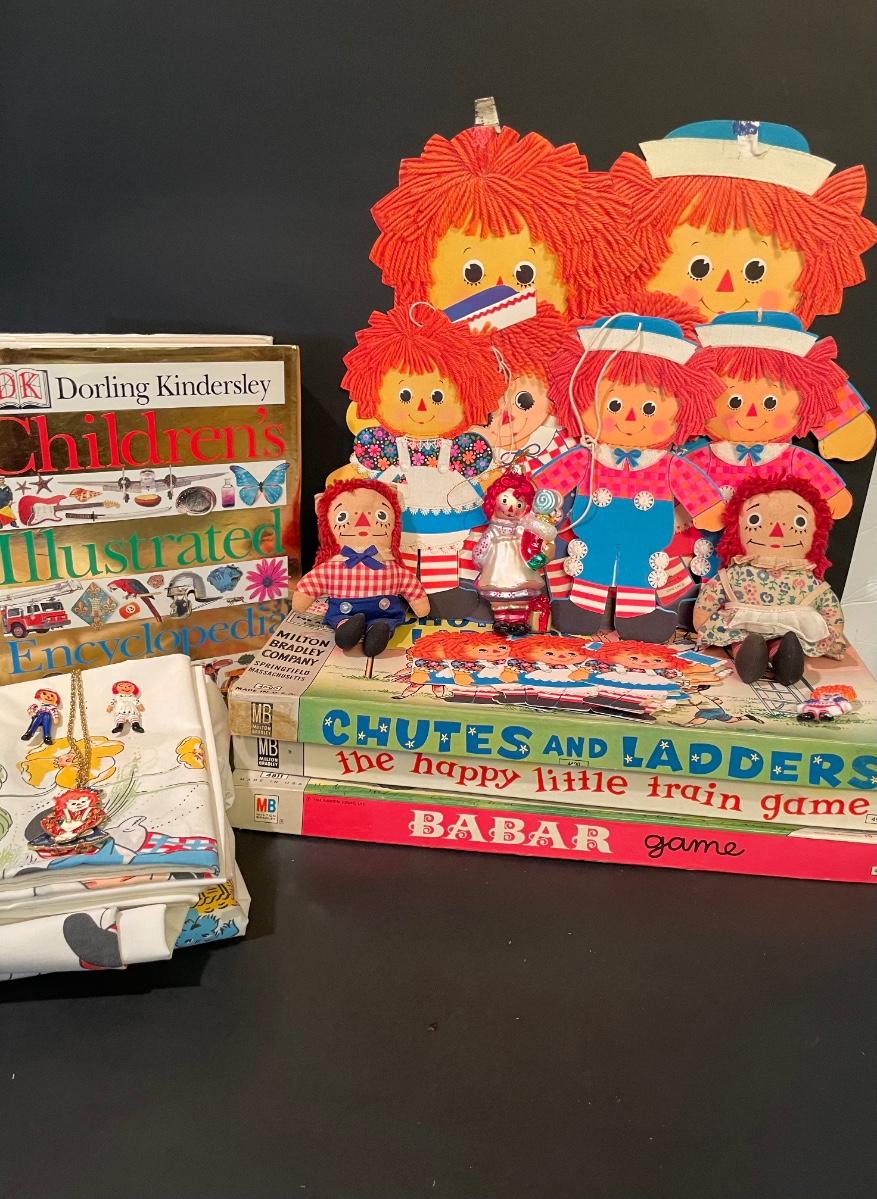 LOT::19 Adorable Array of Raggedy Ann and Andy Mementos Including Party Decorations and Invitations, Commemorative Jewelry, Bed Linens, Retro Board Games and a Children’s Encyclopedia