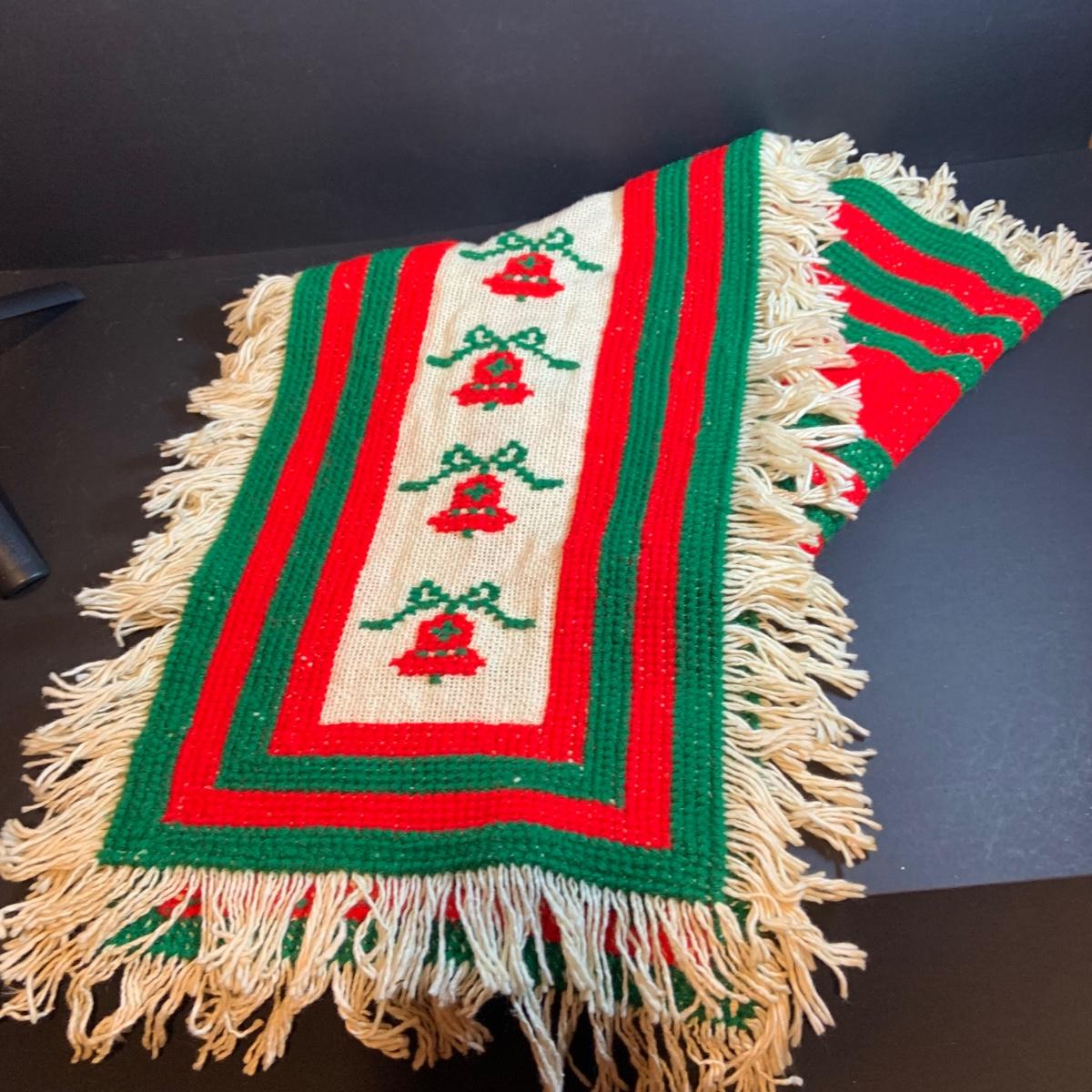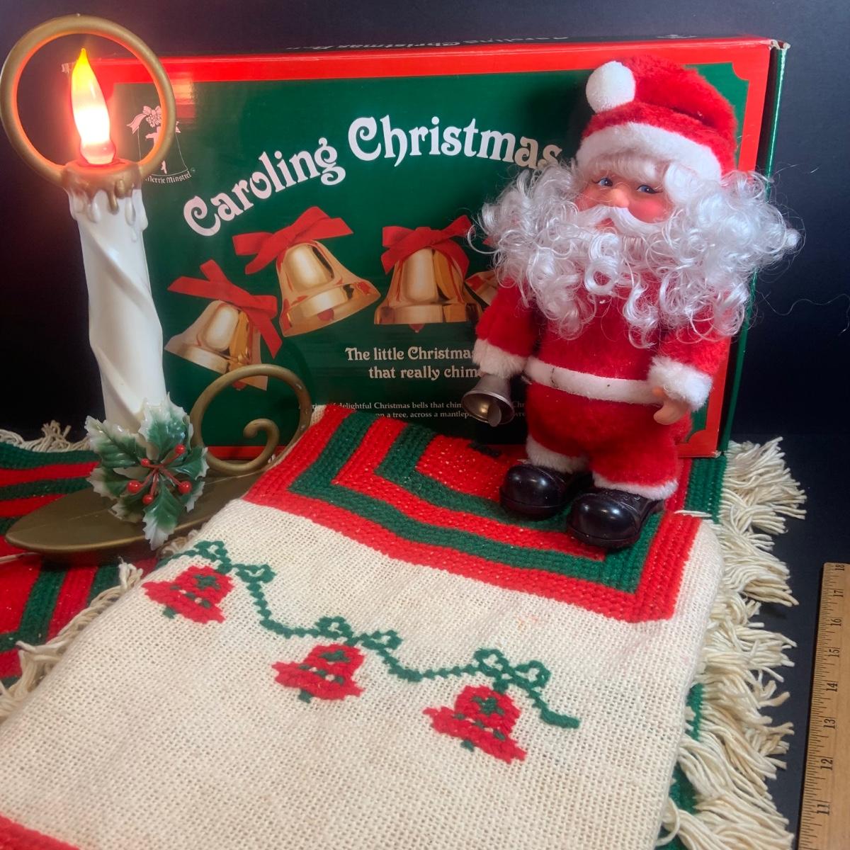 LOT 54: Old Time Christmas Decor Including Caroling Christmas Bells, Plastic Light-up Candle, Santa with Bell and Holiday Table Runners and Placemats