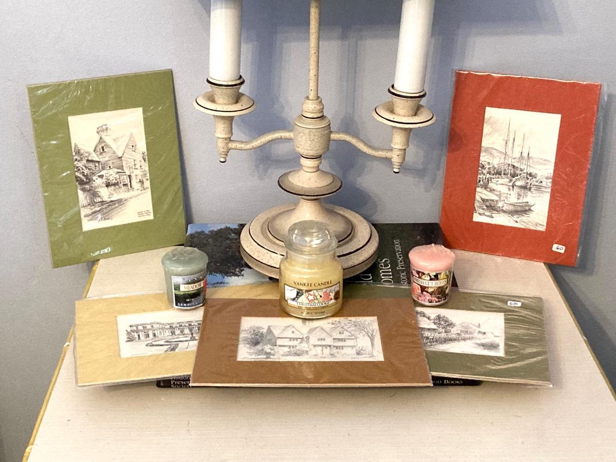 LOT 70: Vintage Underwriter's Laboratories, Inc. Portable Lamp, Haddonfield Homes Book, Collection of Litho Sketch Art Work and Yankee Candles