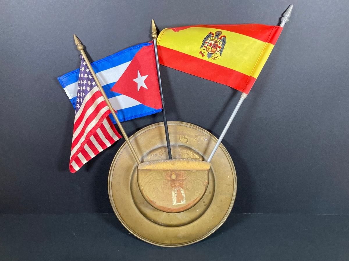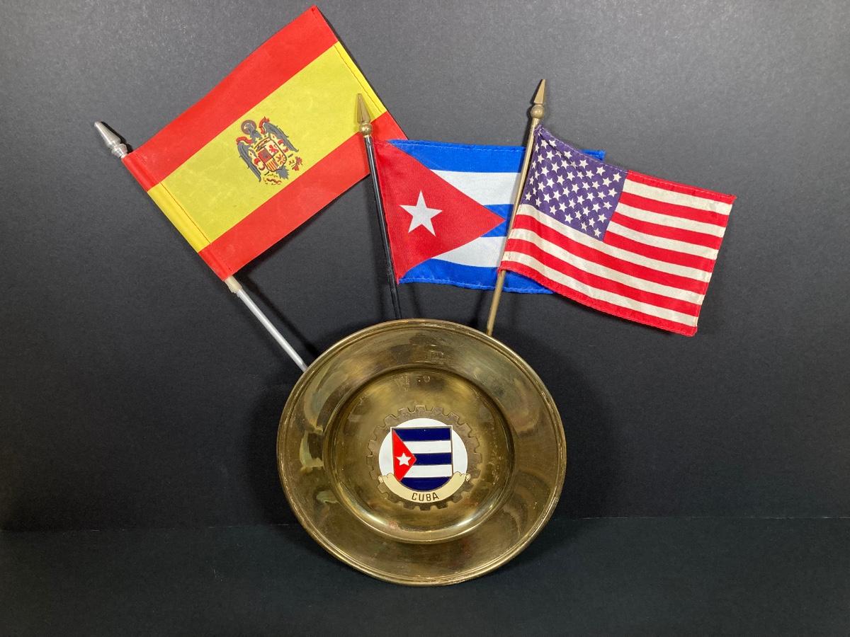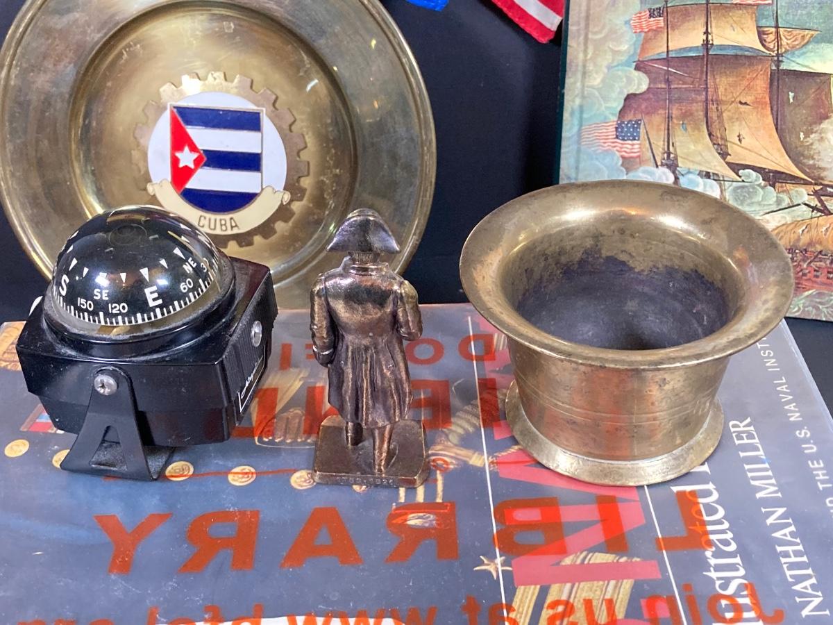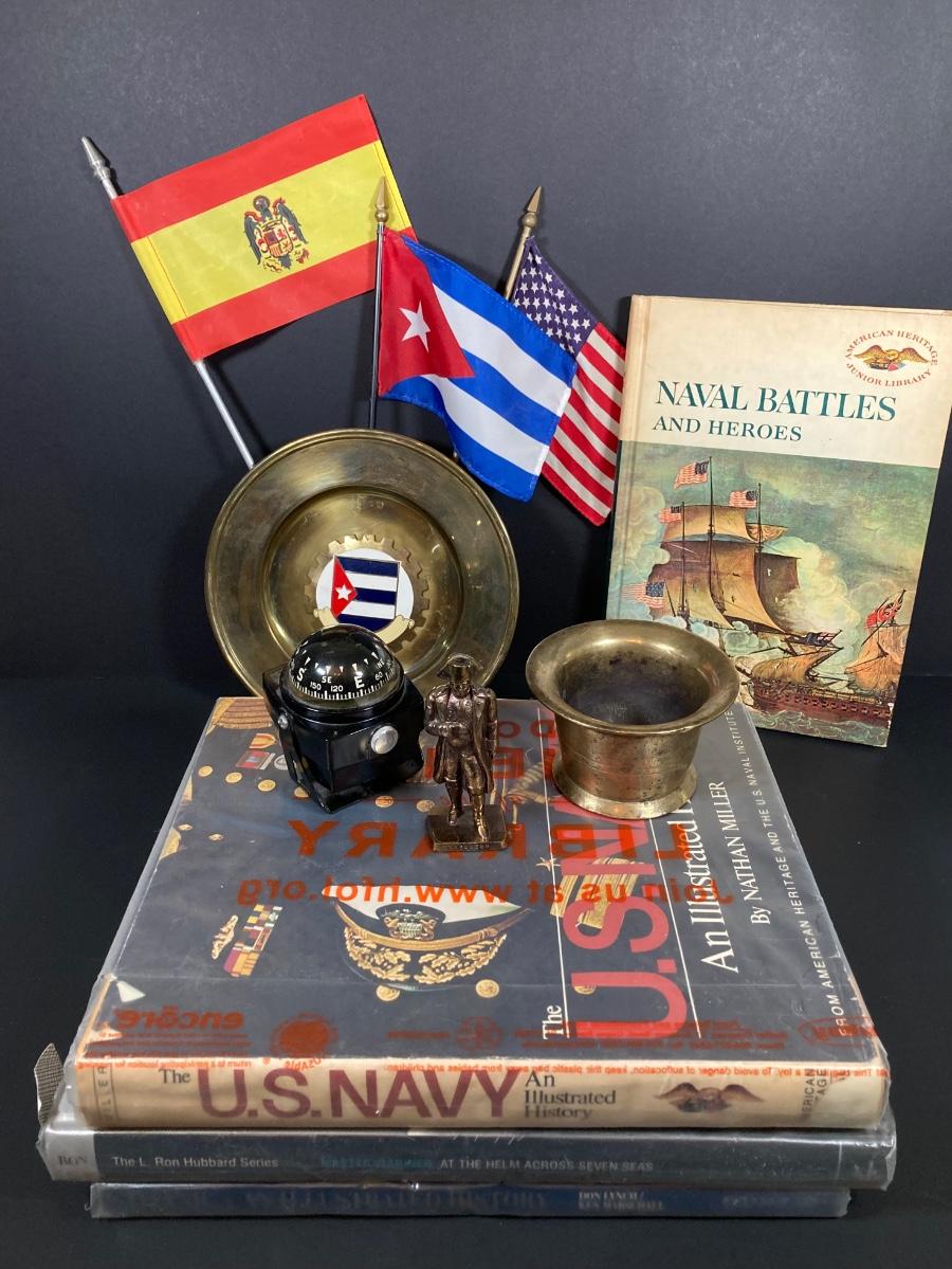 LOT 75: Nautical Books, Flags (Spain, Cuba and USA), Brass Plate and Mini Spittoon, Napolean Figurine and More