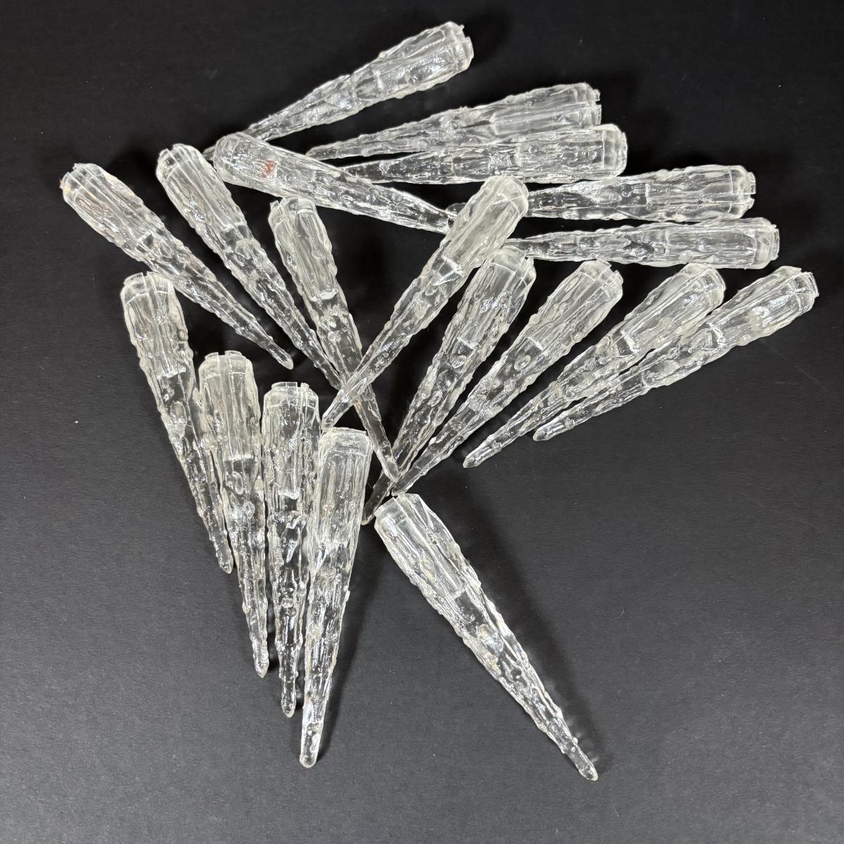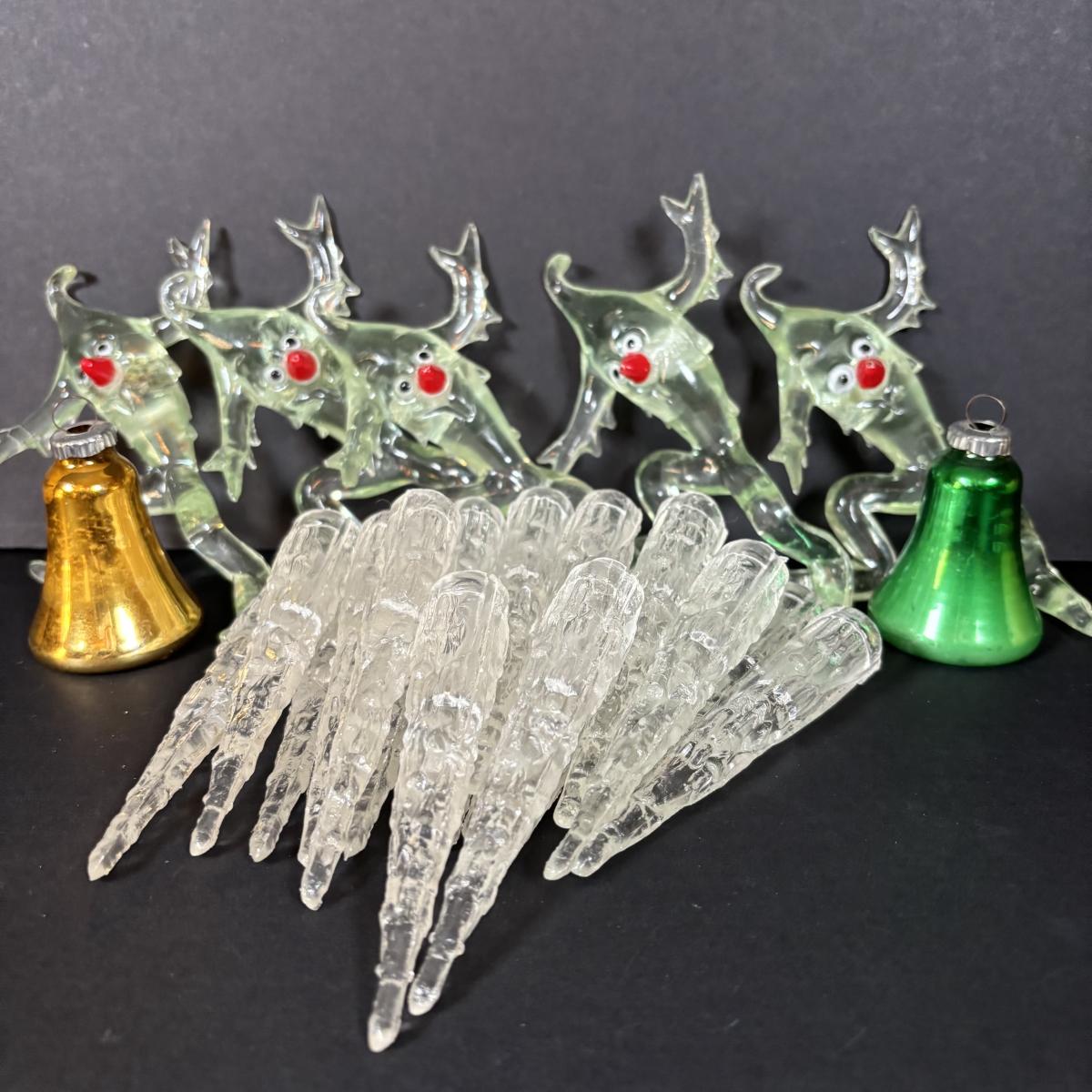 LOT 88: Set of 5 MCM Icy the Icicle Man Lucite/Acrylic Ornament Designed by George Fusek, a Group Icicle Light Covers and Bell Shaped Glass Ornaments