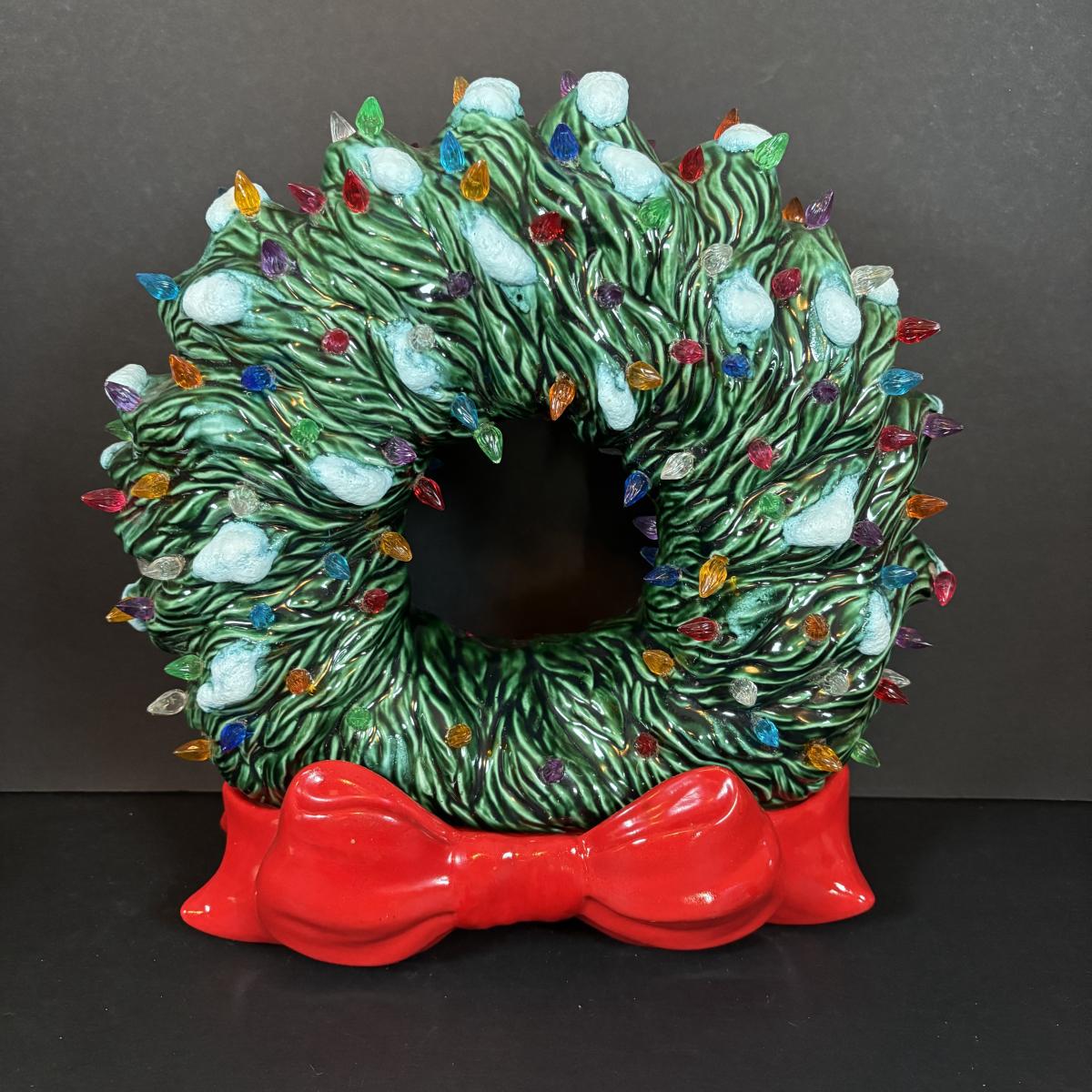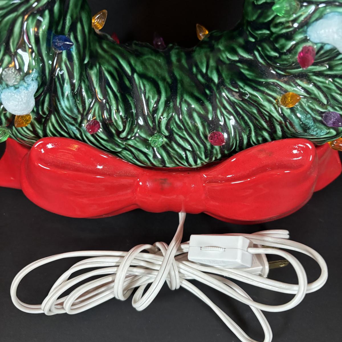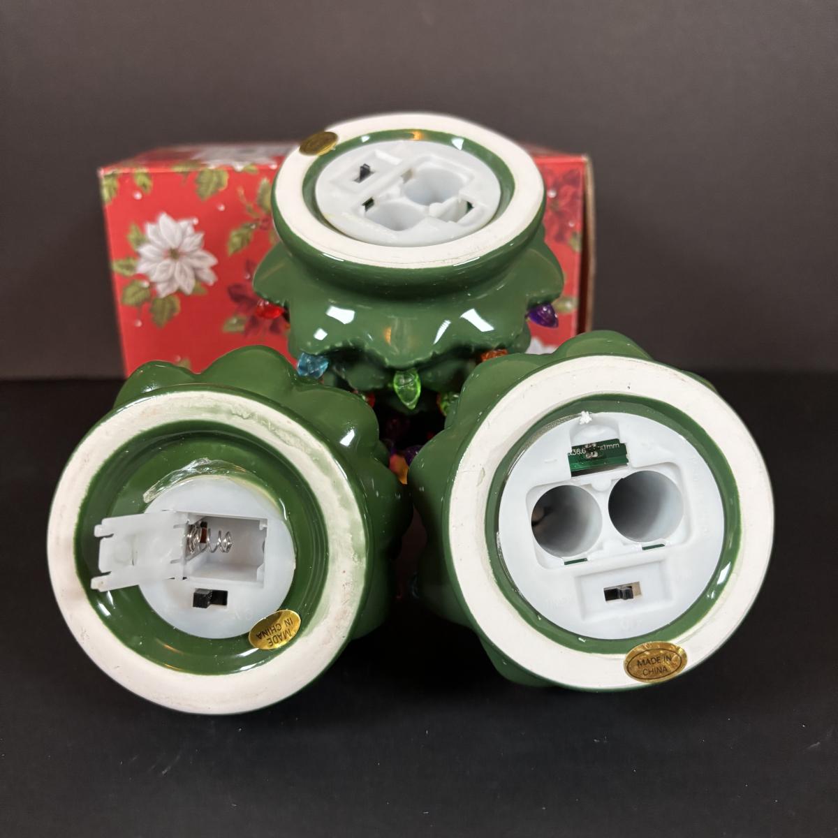 LOT 96: Collection of Ceramic Lighted Mini Christmas Trees, Ceramic Christmas Wreath and Holy Leaf Dish