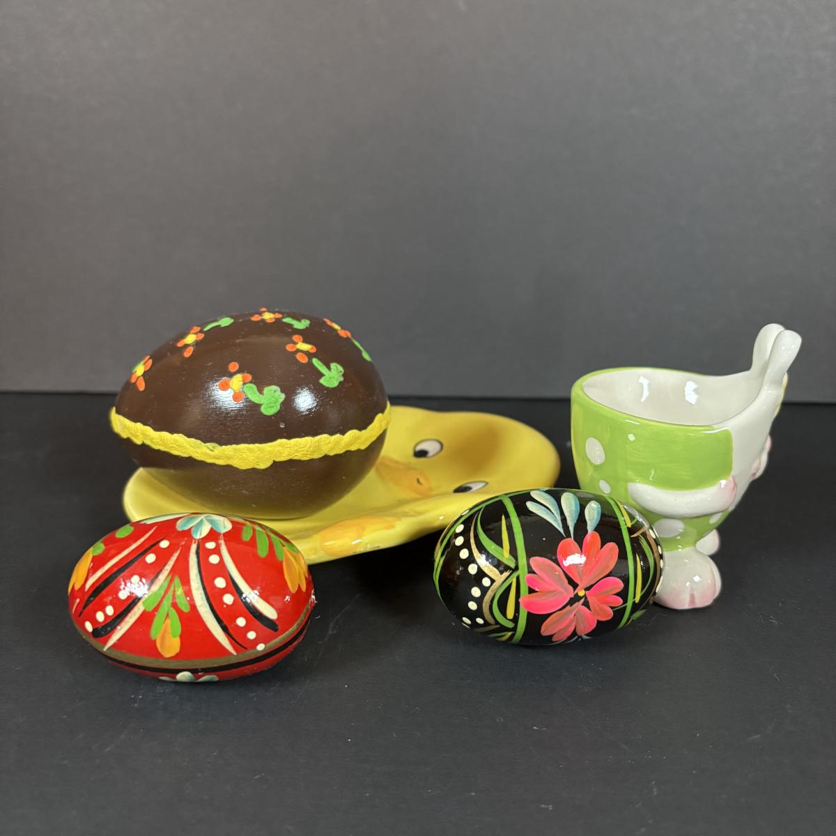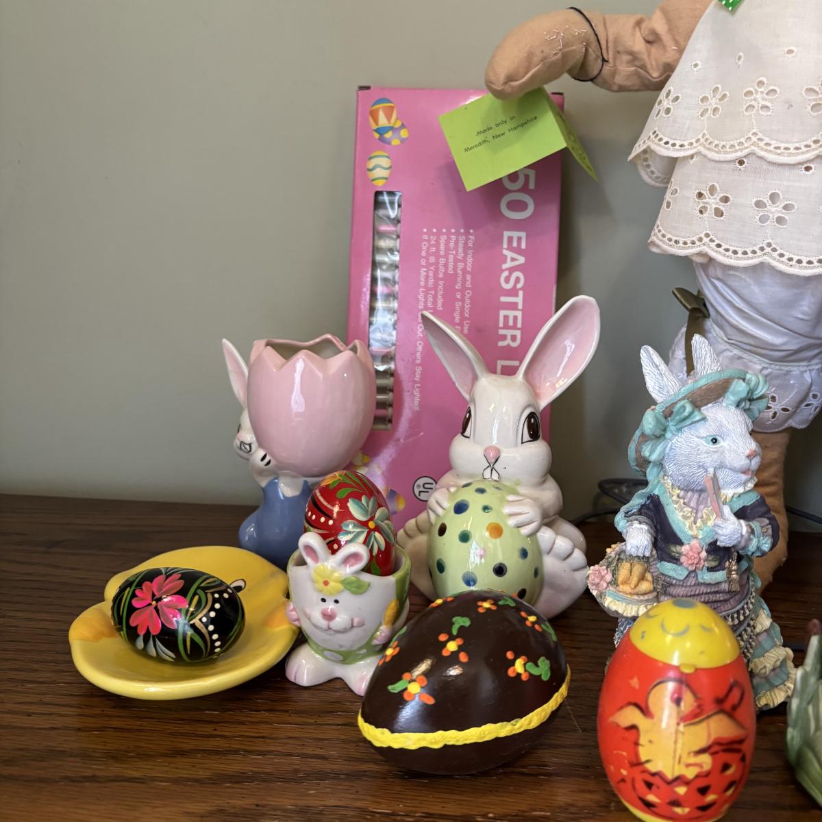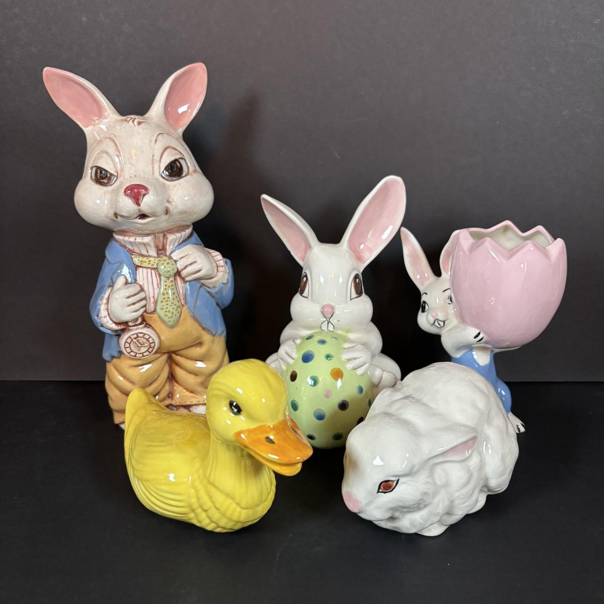 LOT 97: Sping is in the Air Collection of Easter Decor Featuring a Large Annalee Easter Bunny, Ceramic Bunnies and Duck, Eggs, and Franklin Mint Woodland Suprises Duck and More