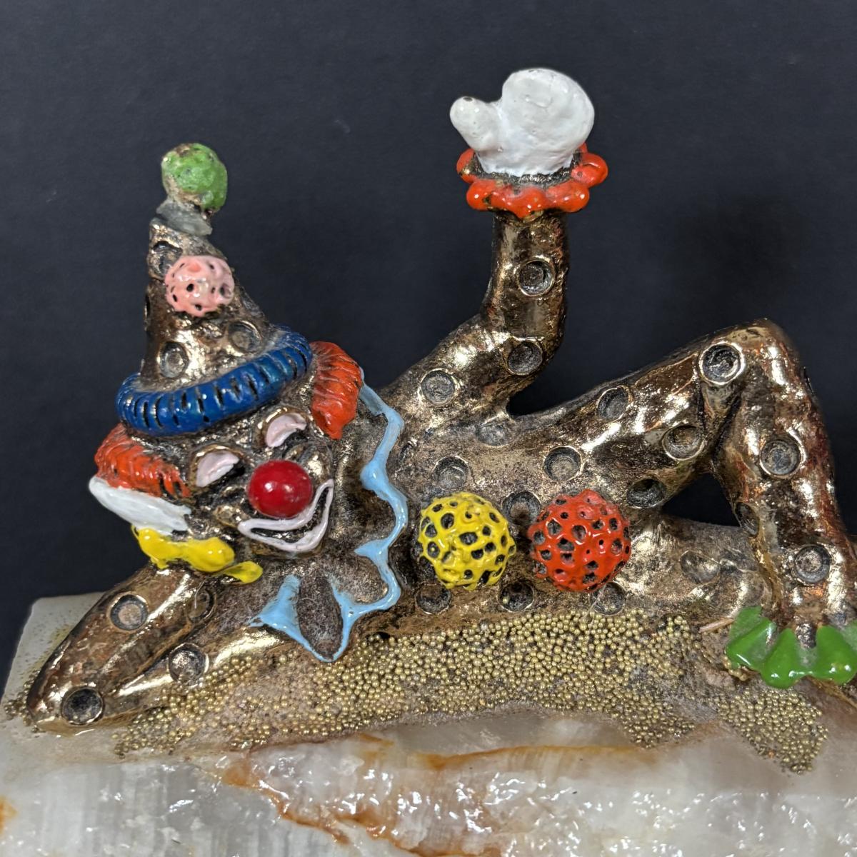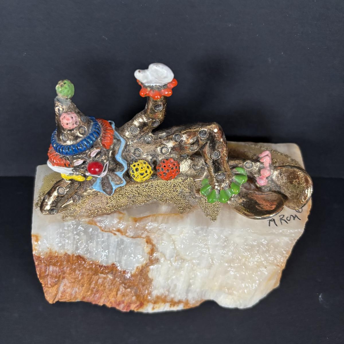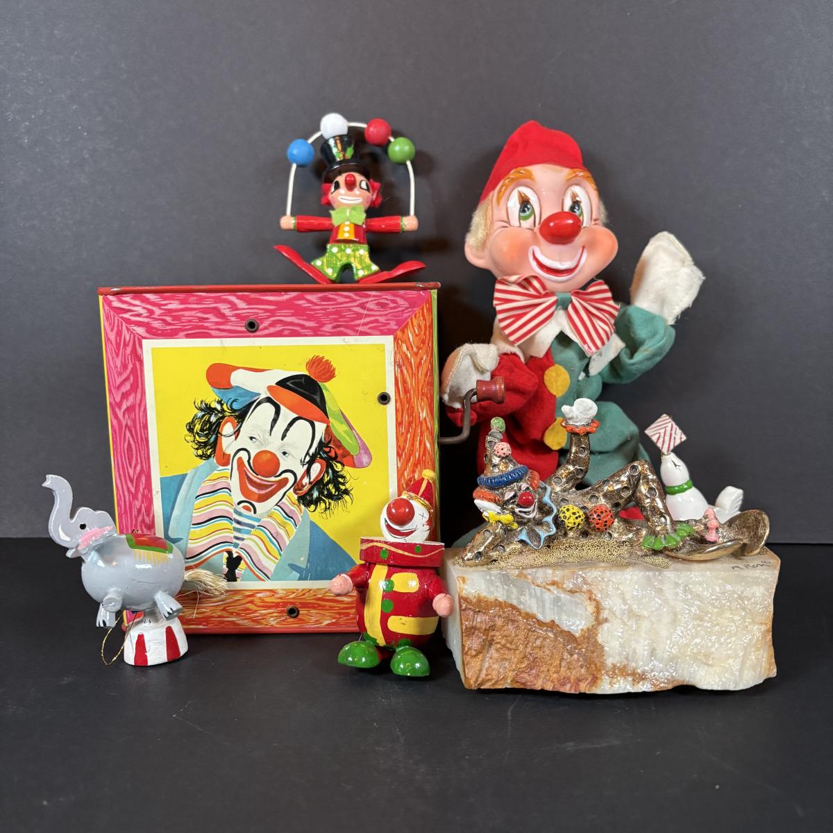 LOT:100: Keep Them Laughing Clown Collection Including Mattel Jack In the Box, Kmar Clown Doll, Wood Circus Figures and a Signed Ron Lee Clown Sculpture "Pinky Lying Down"