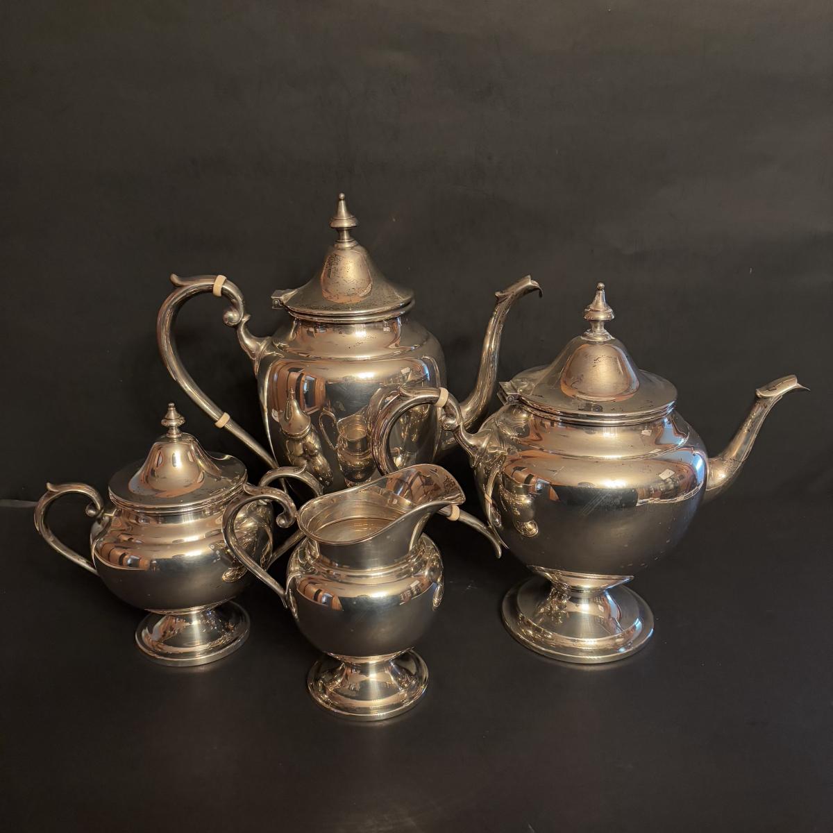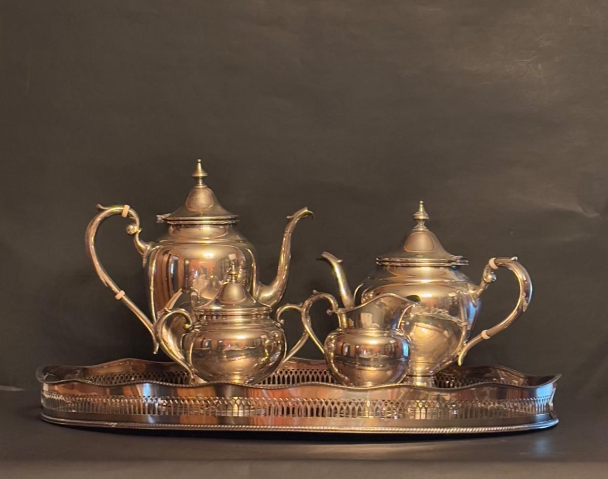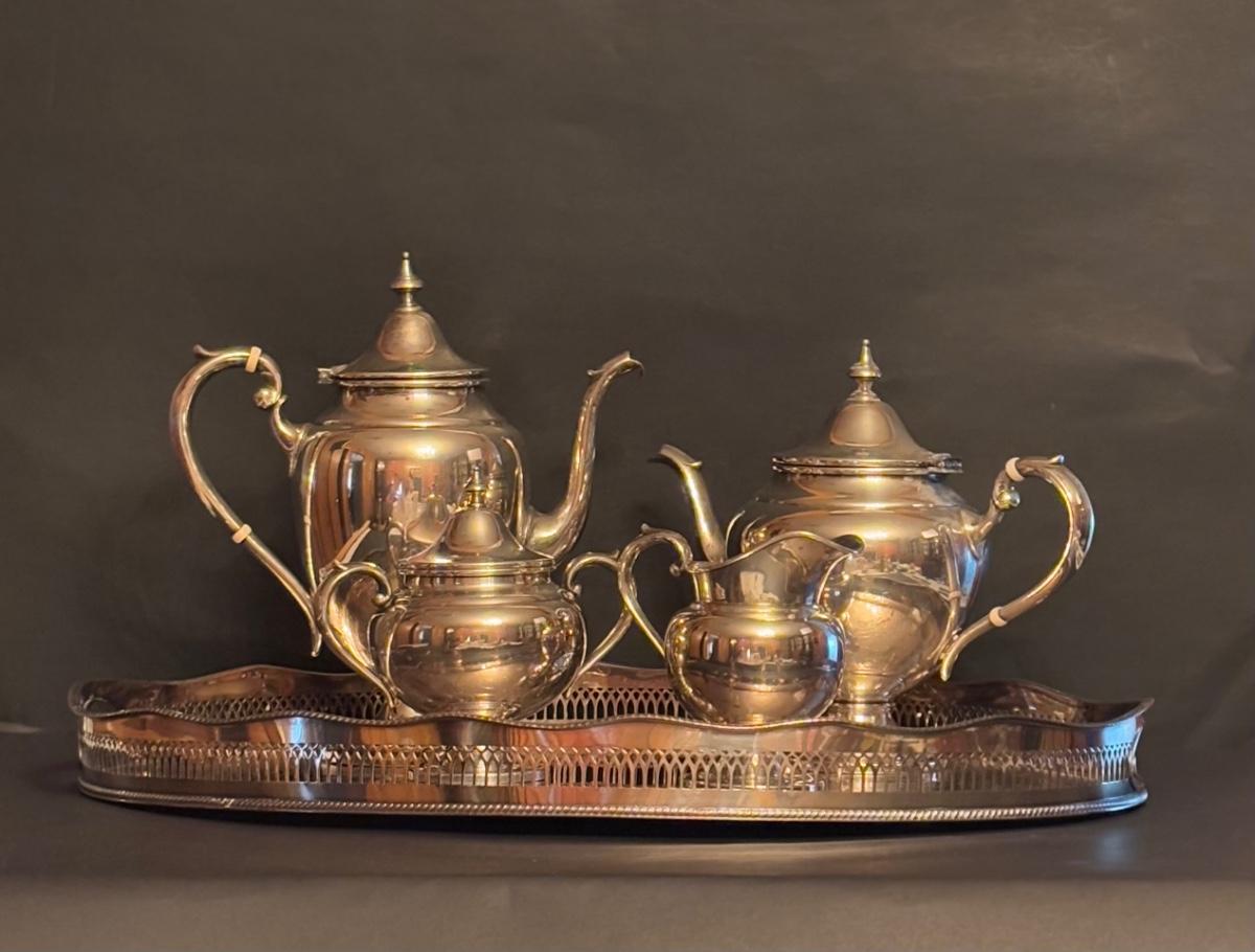 LOT 105: Gorham Sterling Silver Tea Service Set with Oval Silverplate Serving Tray Tw. 1,790g