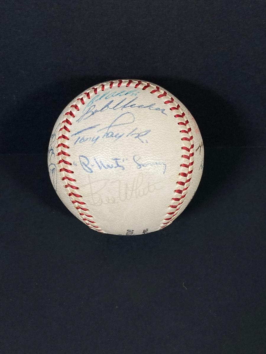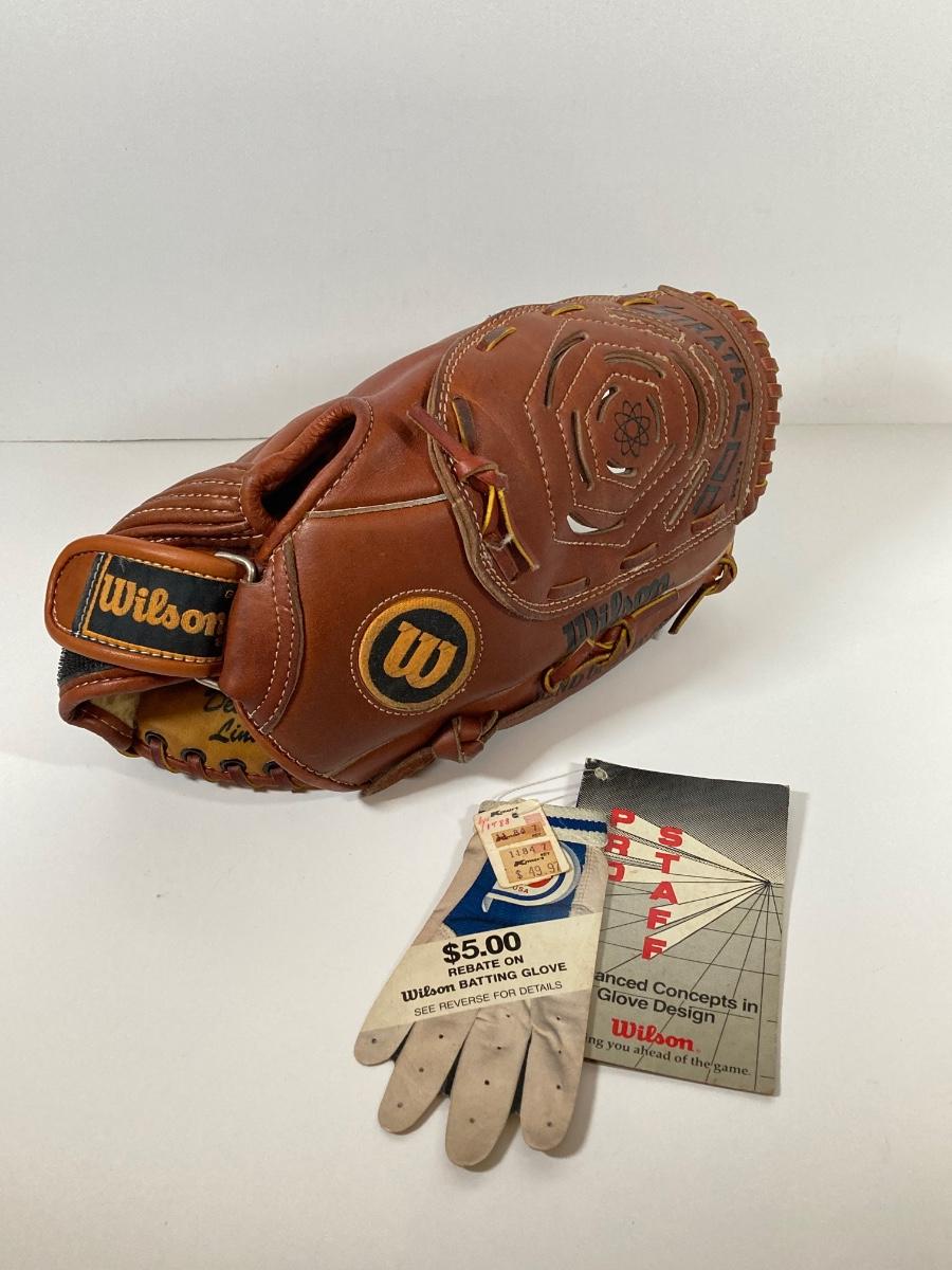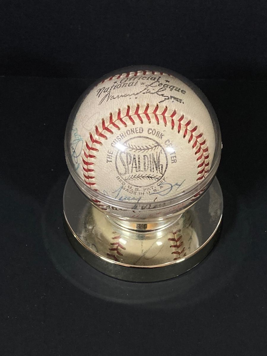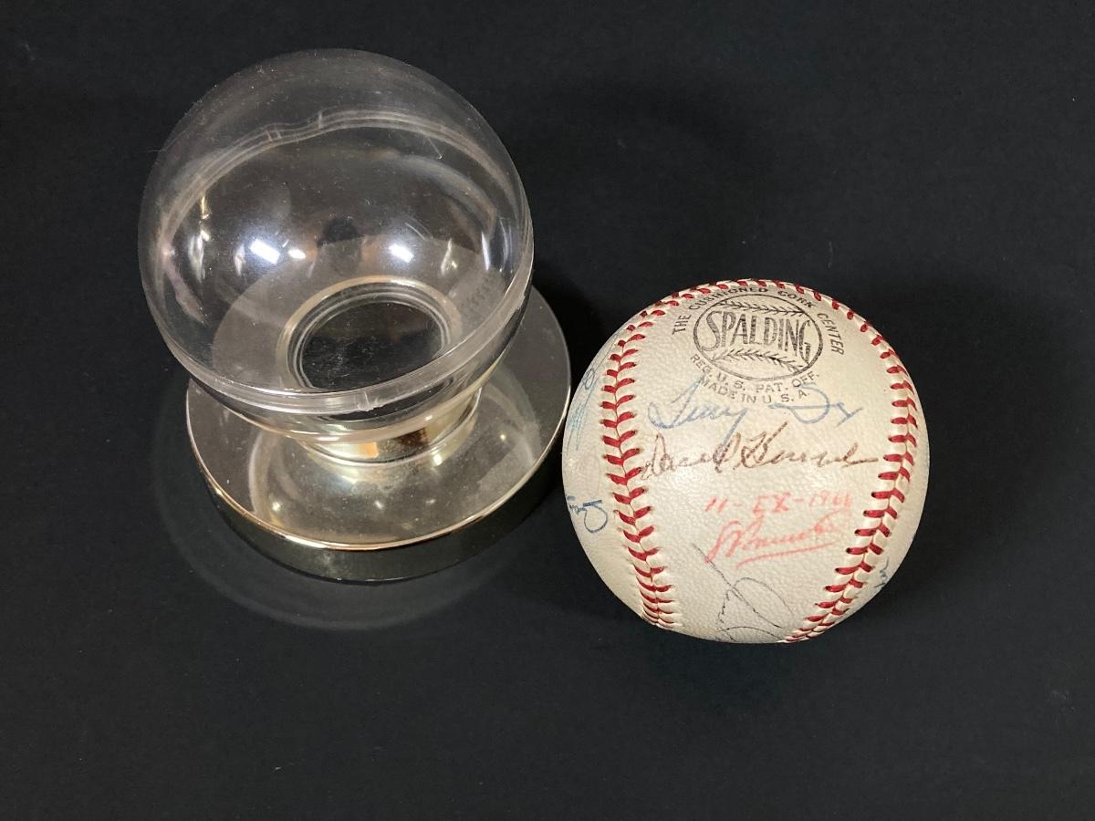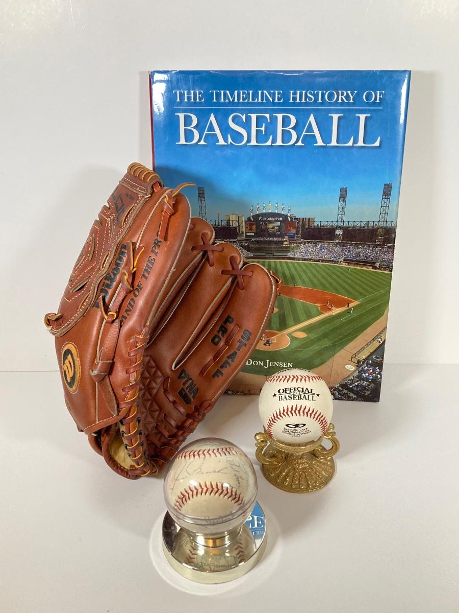 LOT 163: Baseball Collection - Autographed Baseball in Protective Stand (Bob Uecker), Wilson Pro Staff Glove, Worth Tennessee Thumper Wood Bat Model WSBC 3, Baseball History Book and More