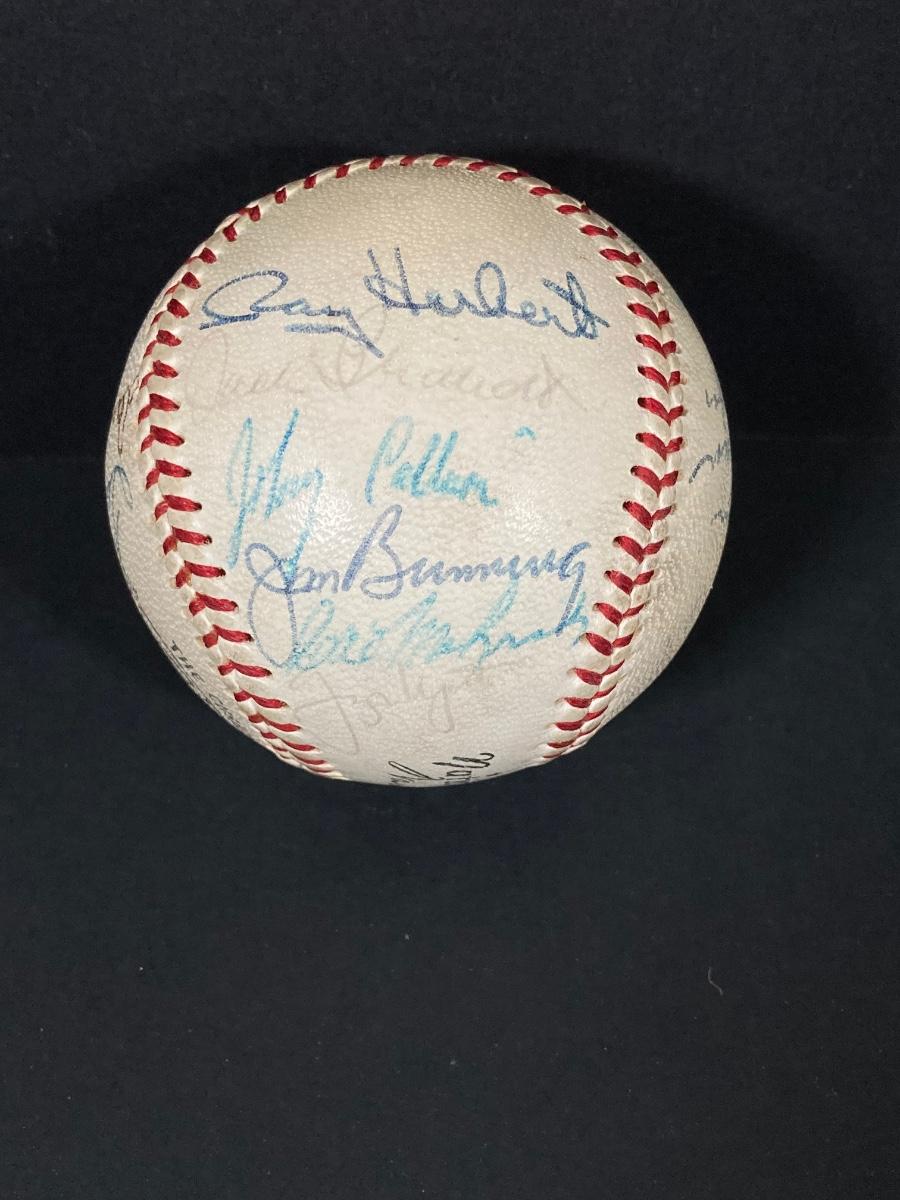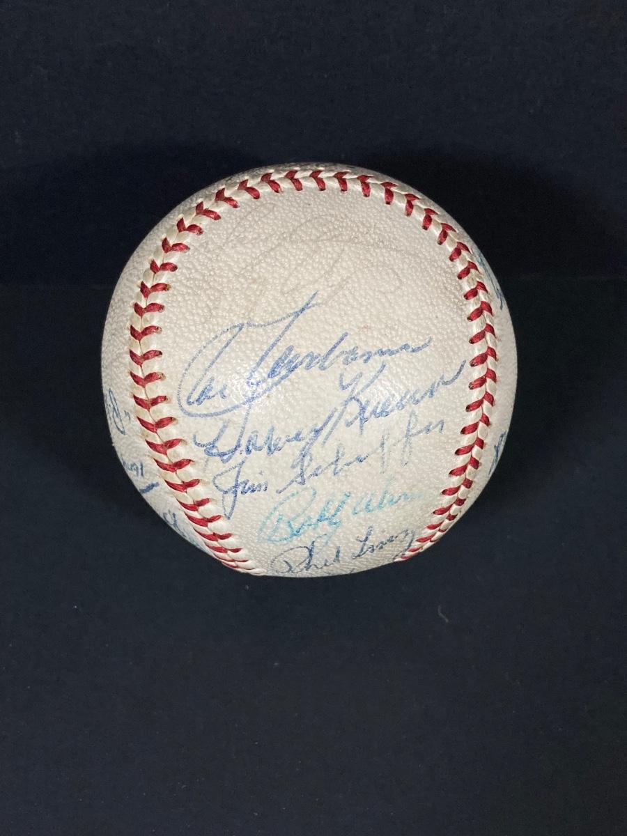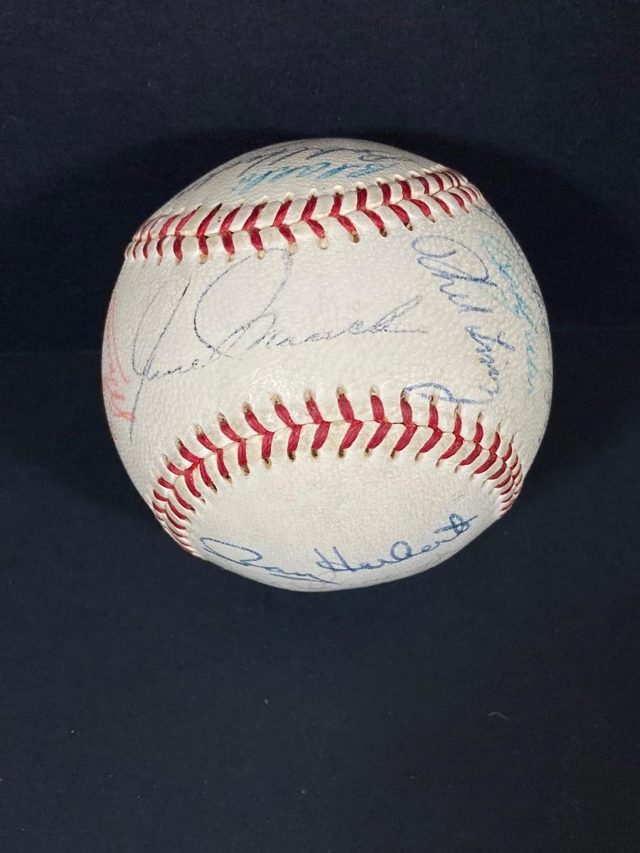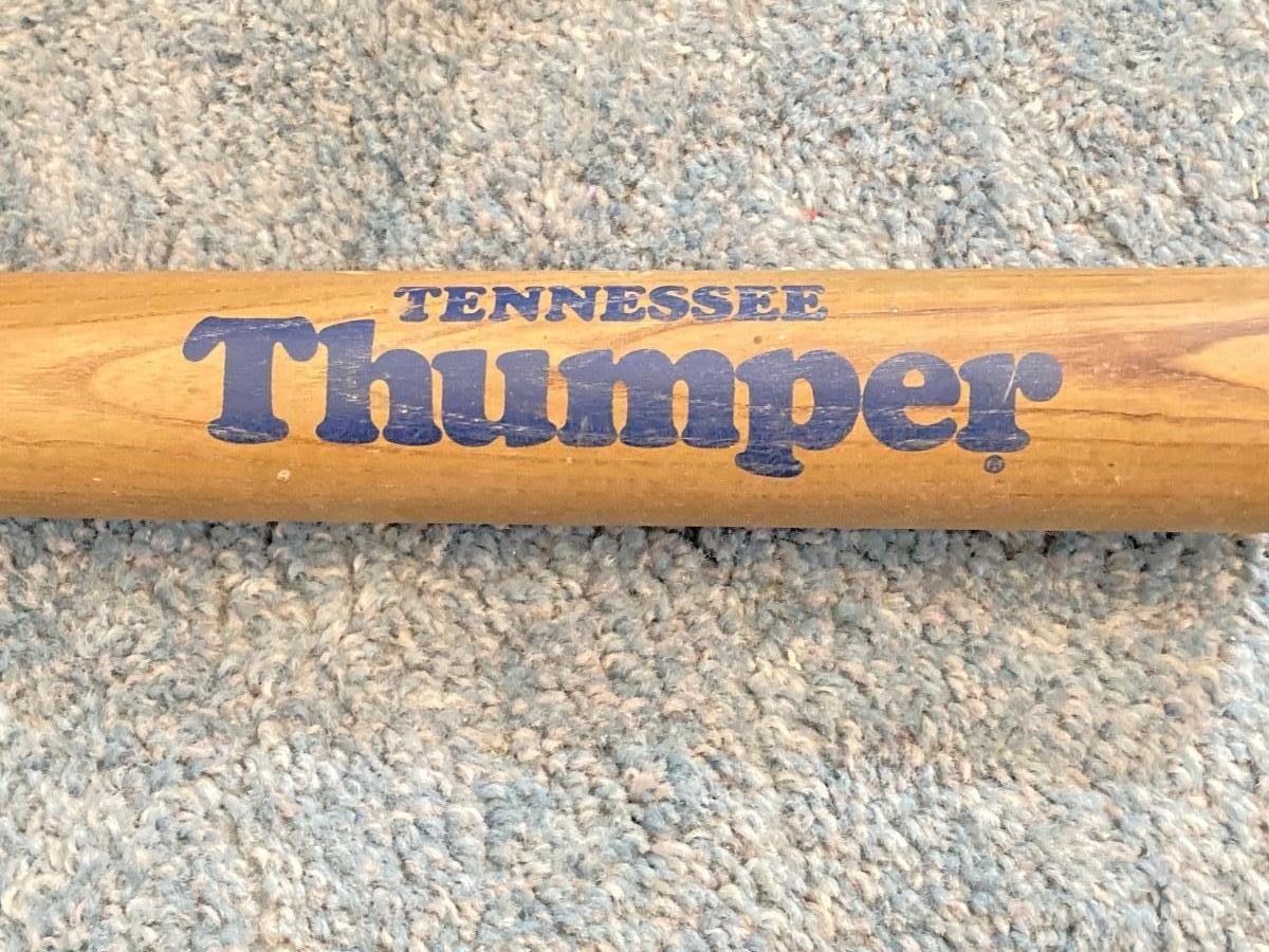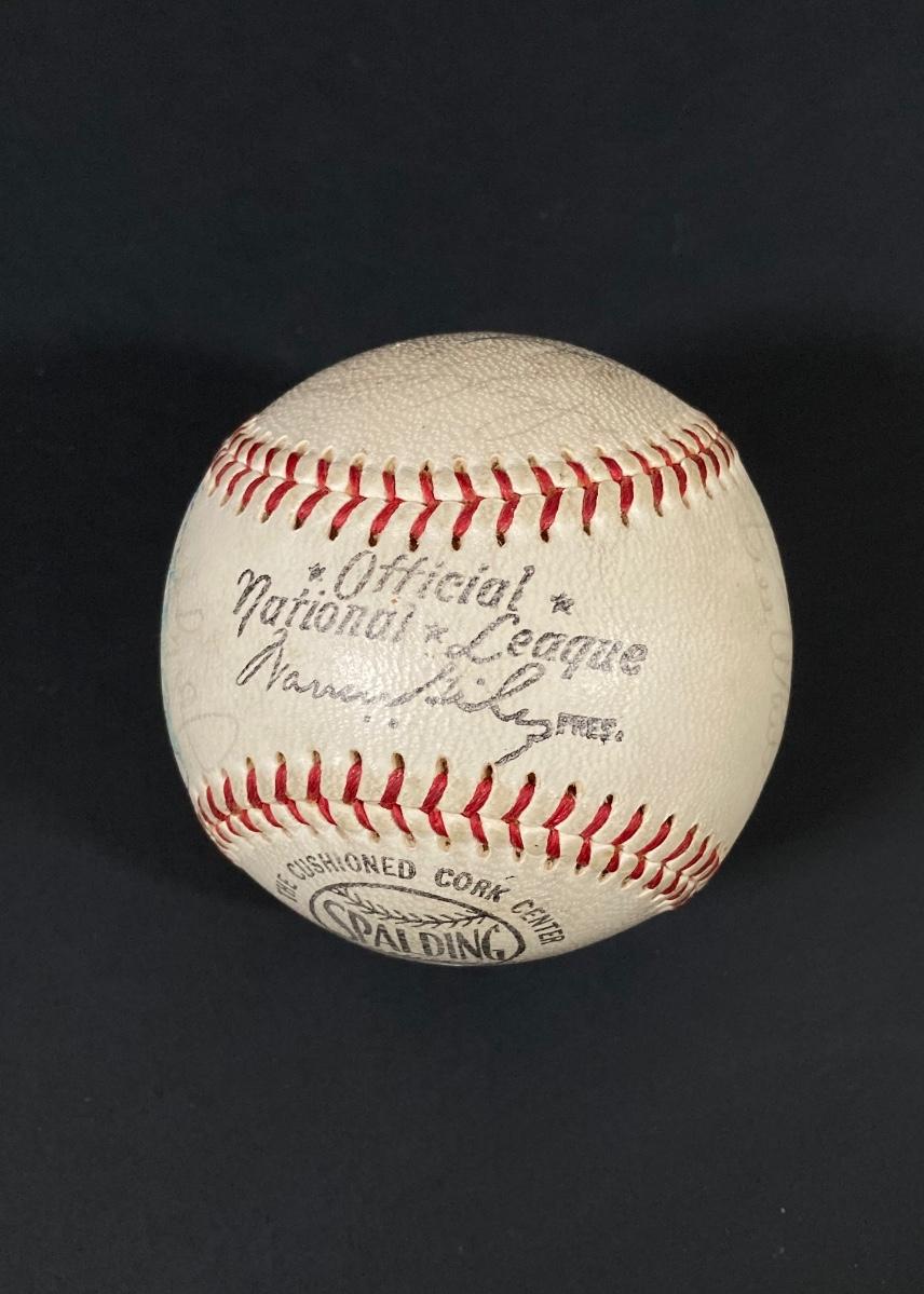 LOT 163: Baseball Collection - Autographed Baseball in Protective Stand (Bob Uecker), Wilson Pro Staff Glove, Worth Tennessee Thumper Wood Bat Model WSBC 3, Baseball History Book and More