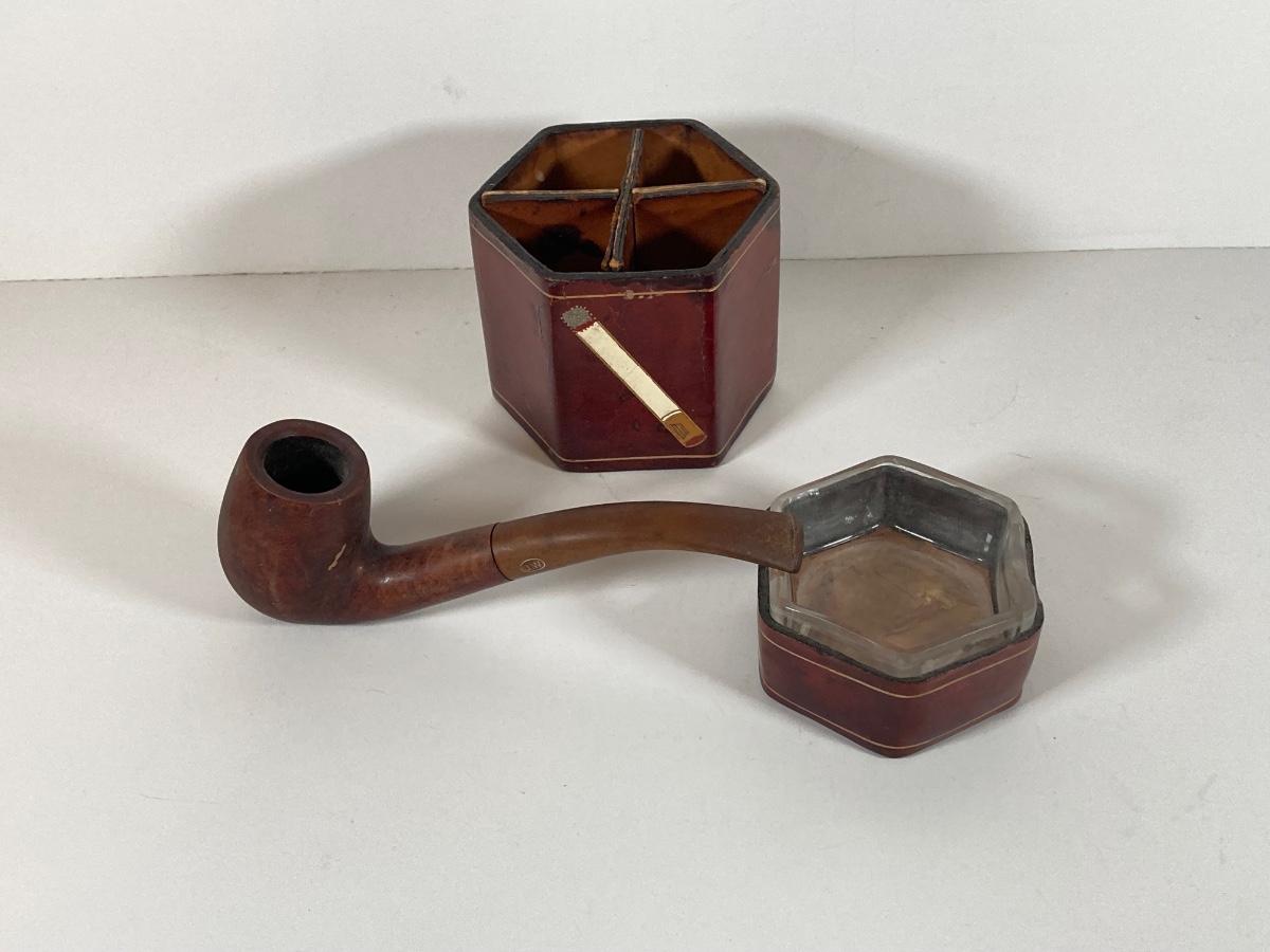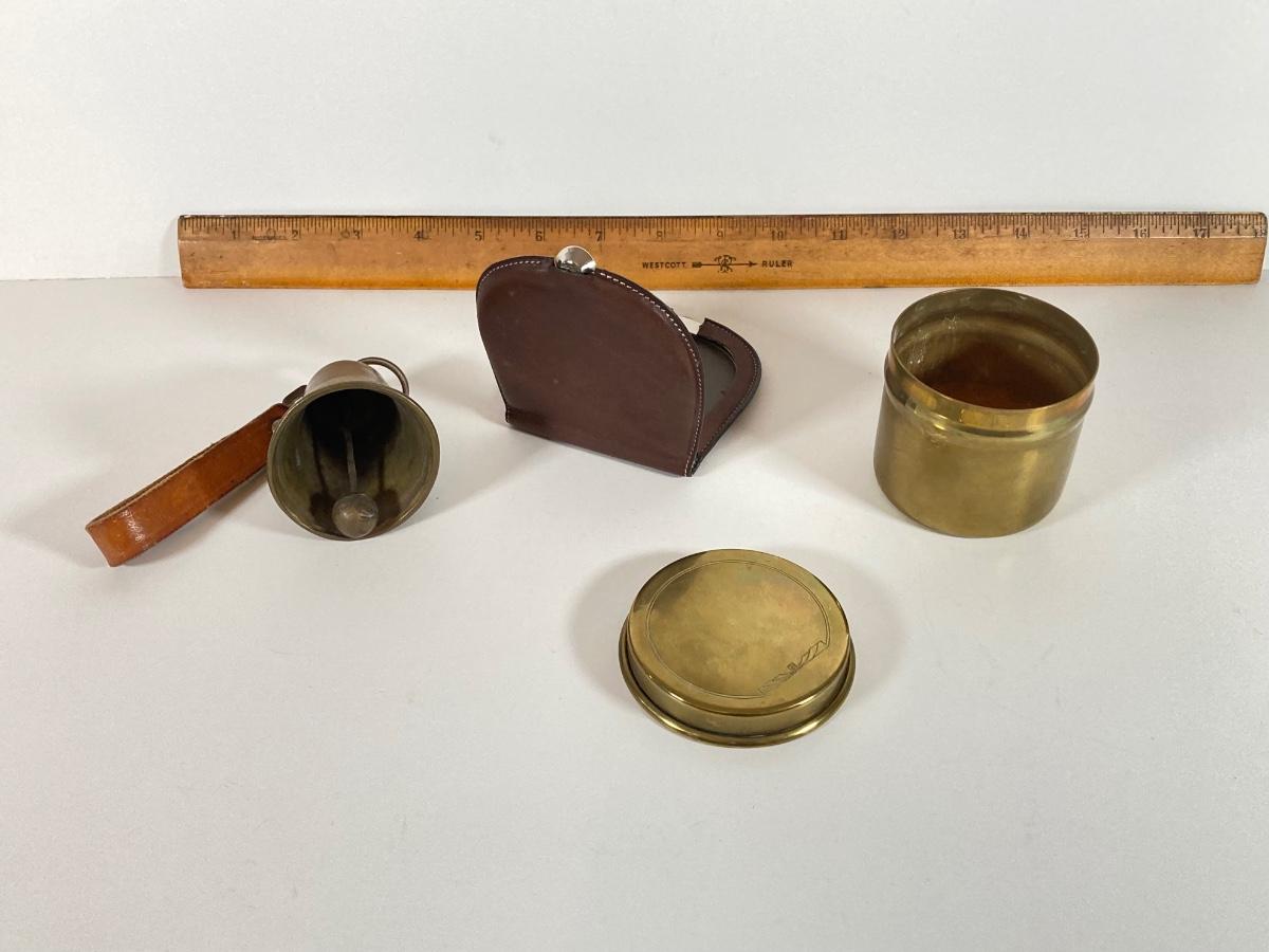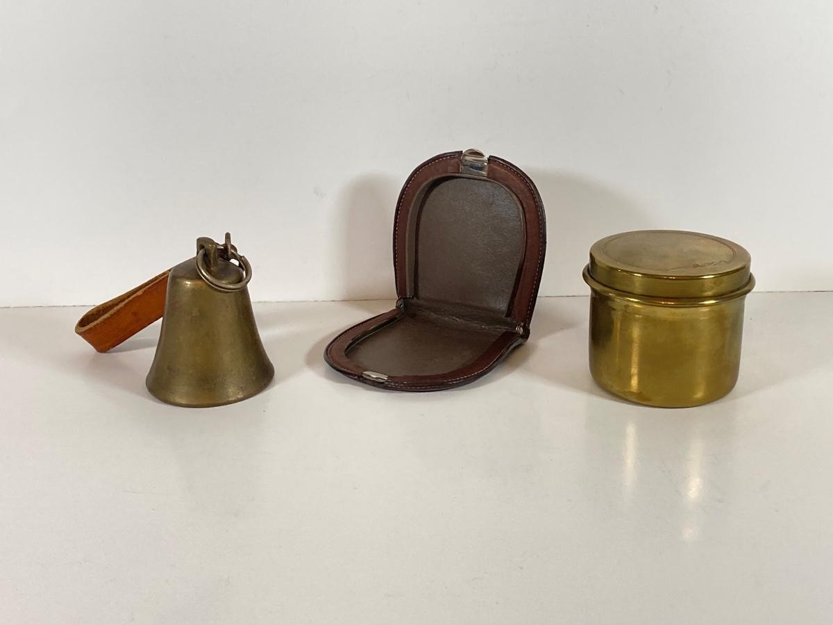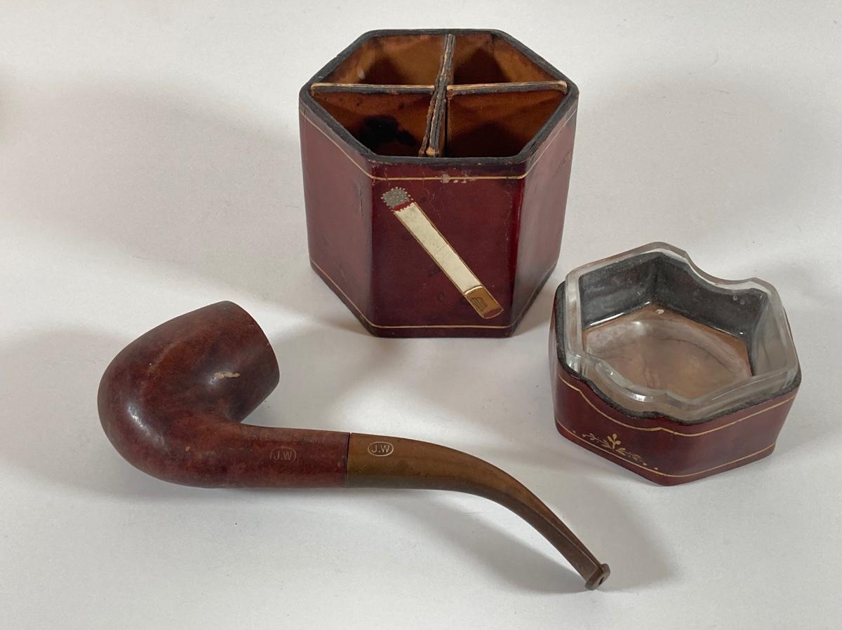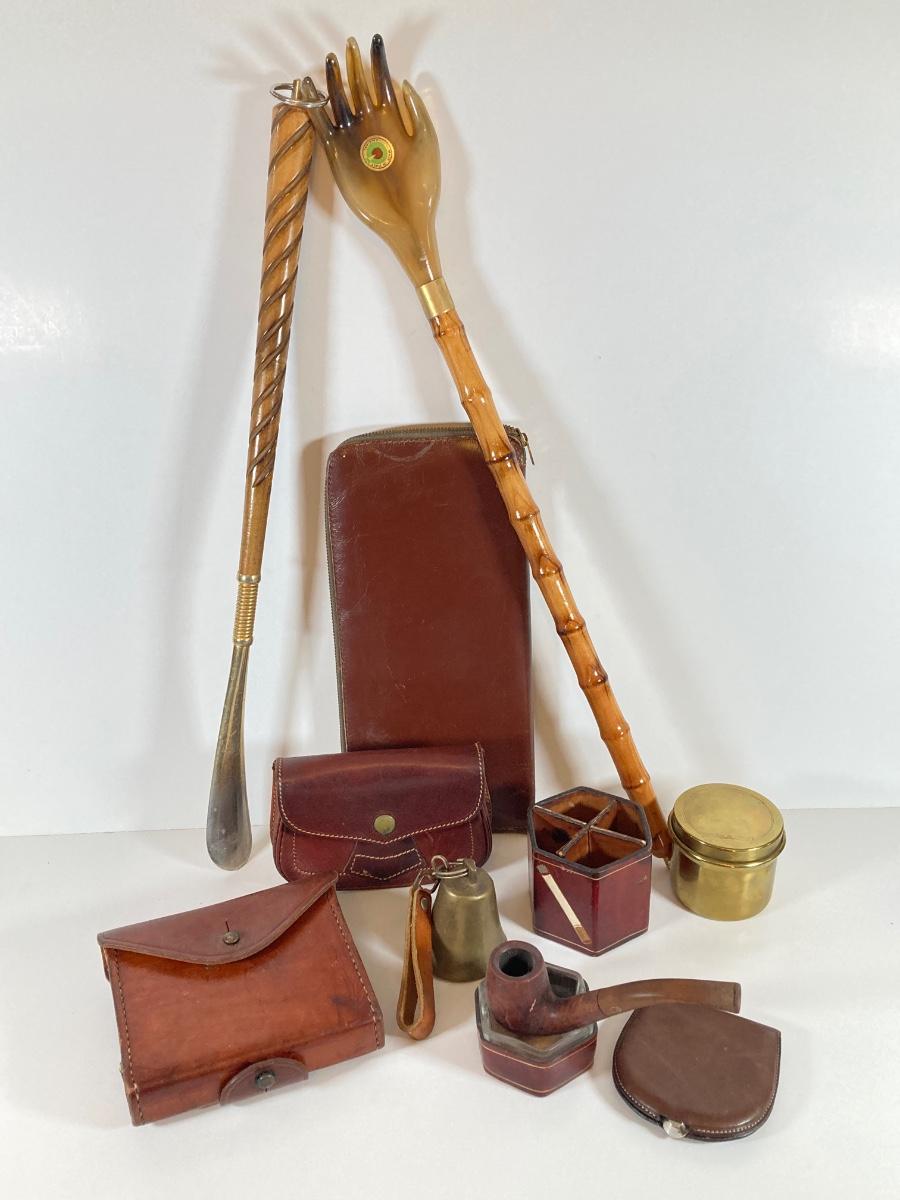 LOT 169: Vintage Collection - J.W Pipe, Cigarette Holder, Ashtray, Back Scratcher (Italy), Shoe Horn, Leather Holders, Brass Bell and Container