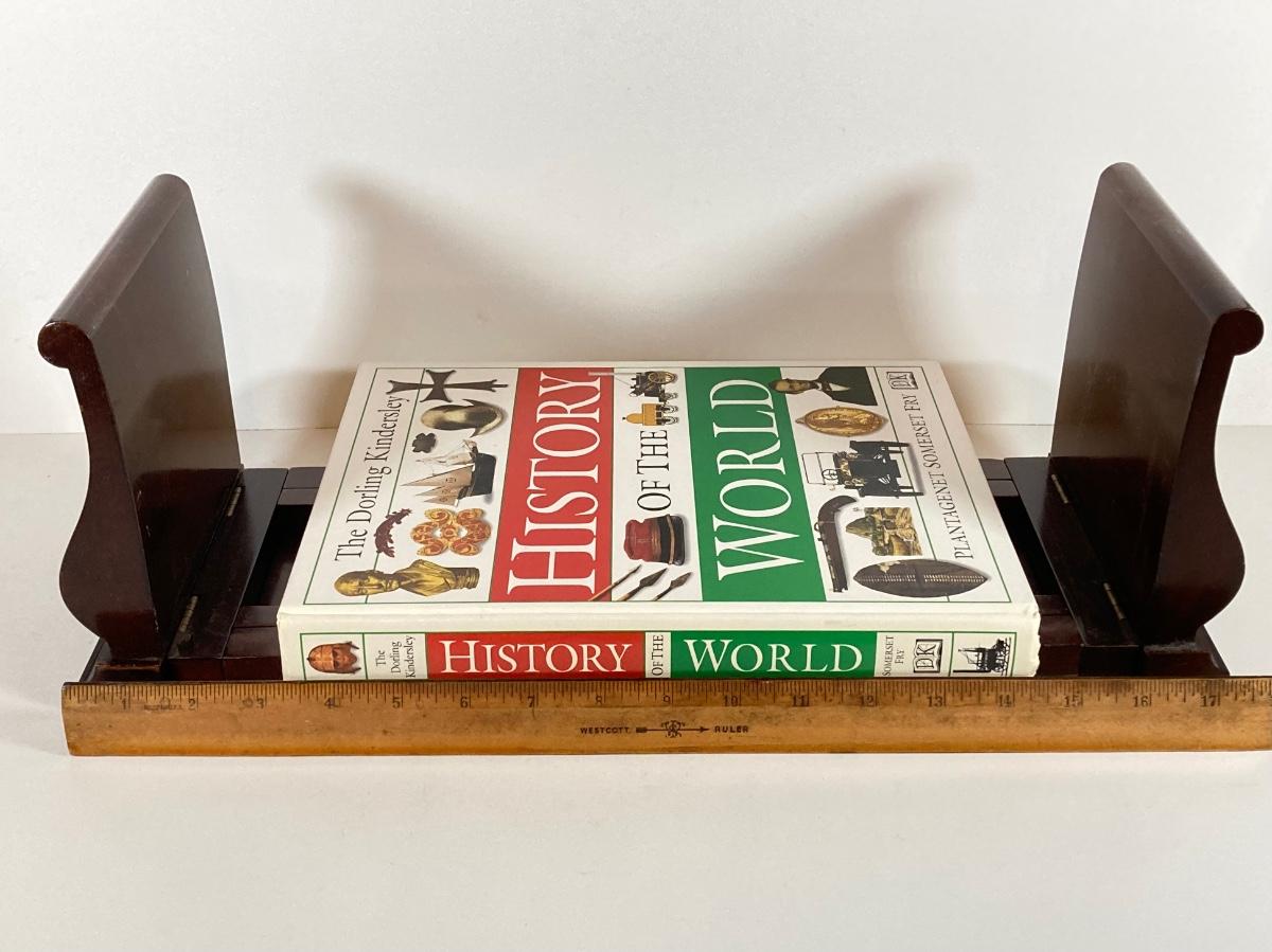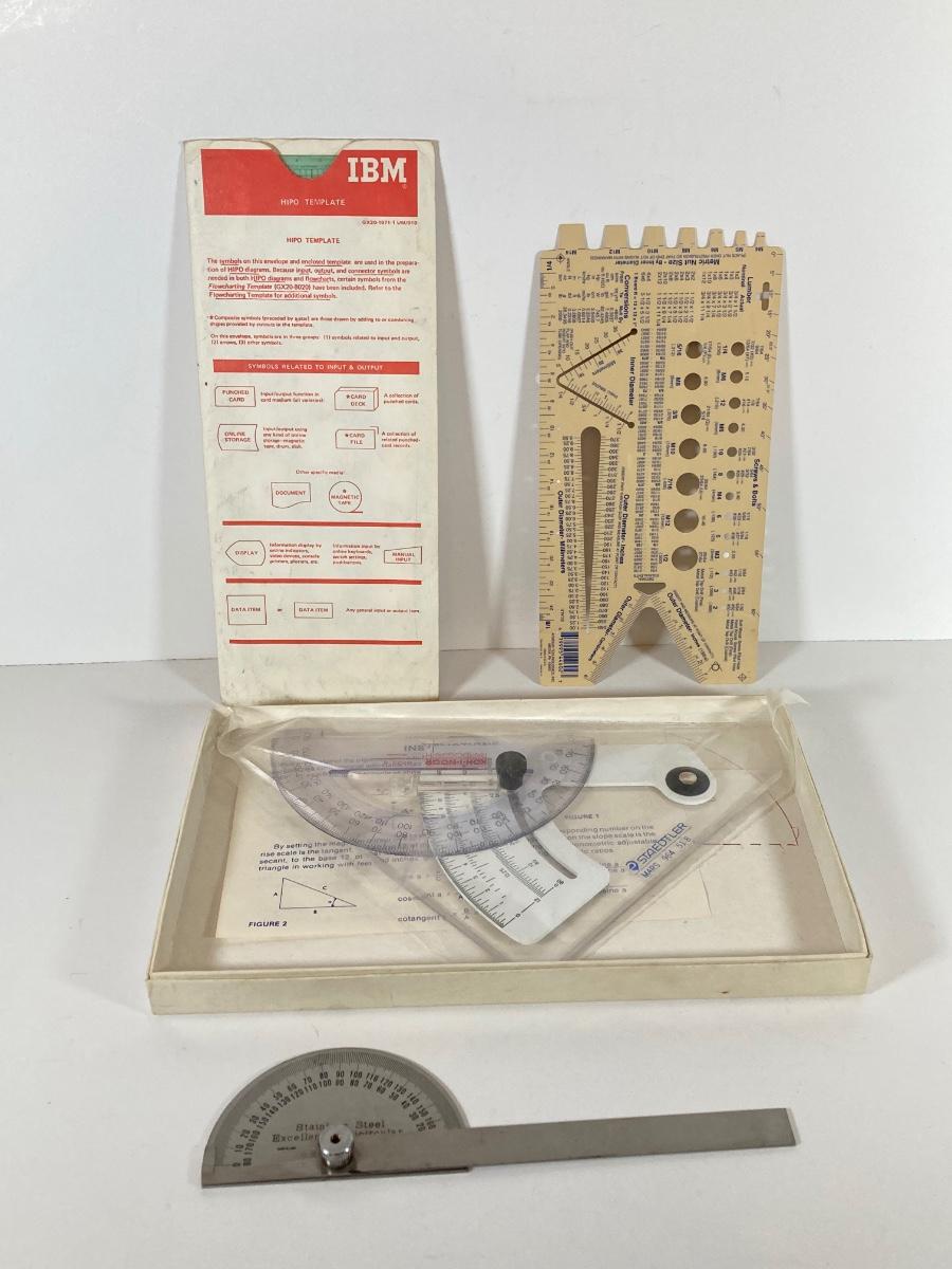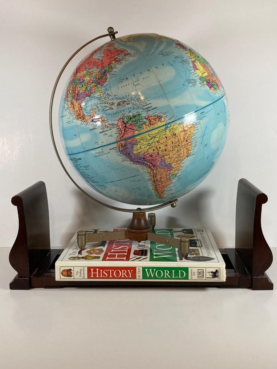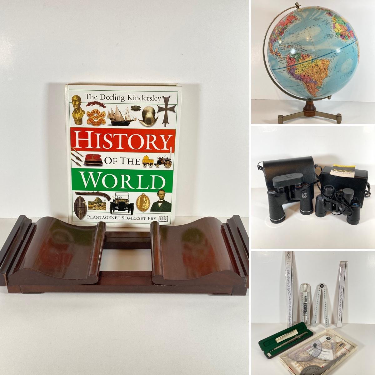 LOT: Bombay Adjustable Wooden Book Ends, Replogle Globe, Binoculars, Vintage Drawing / Measuring Tools and More