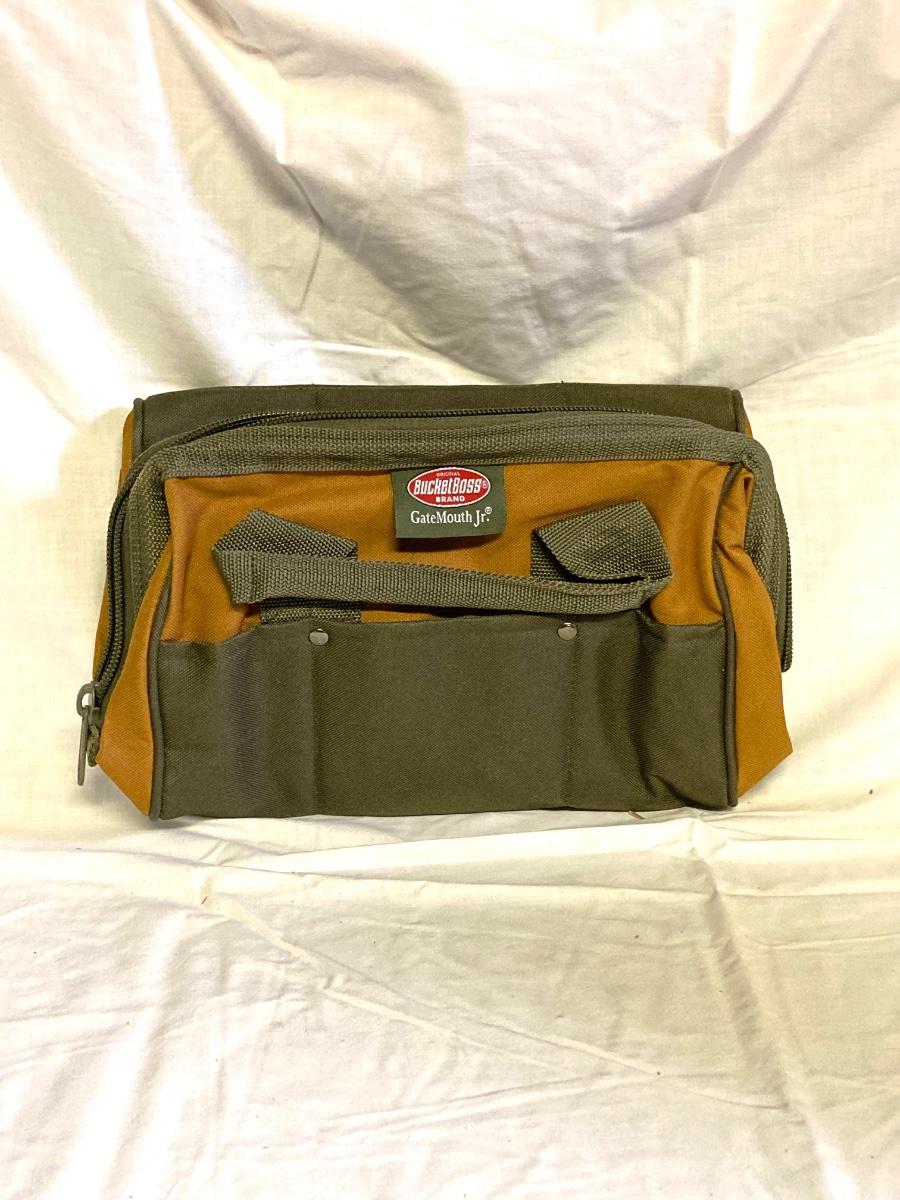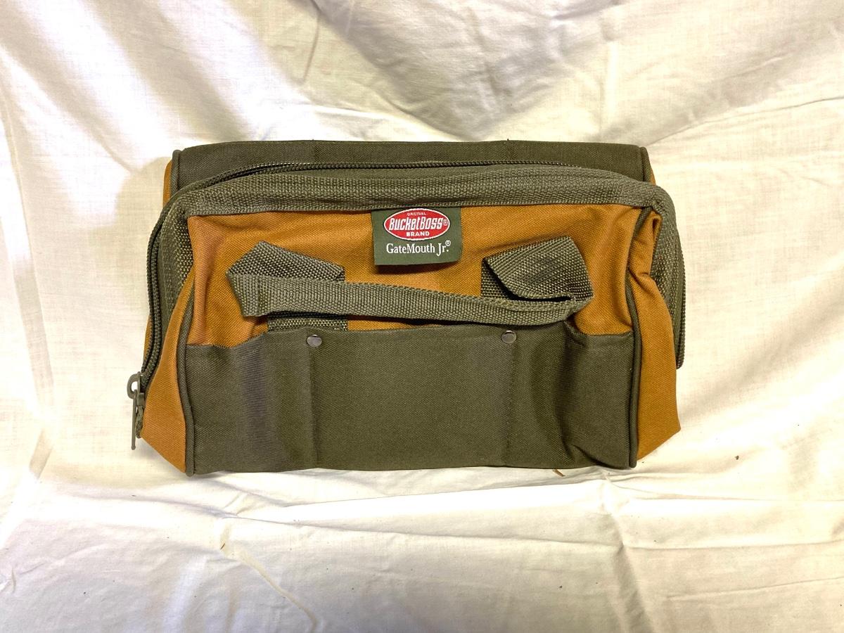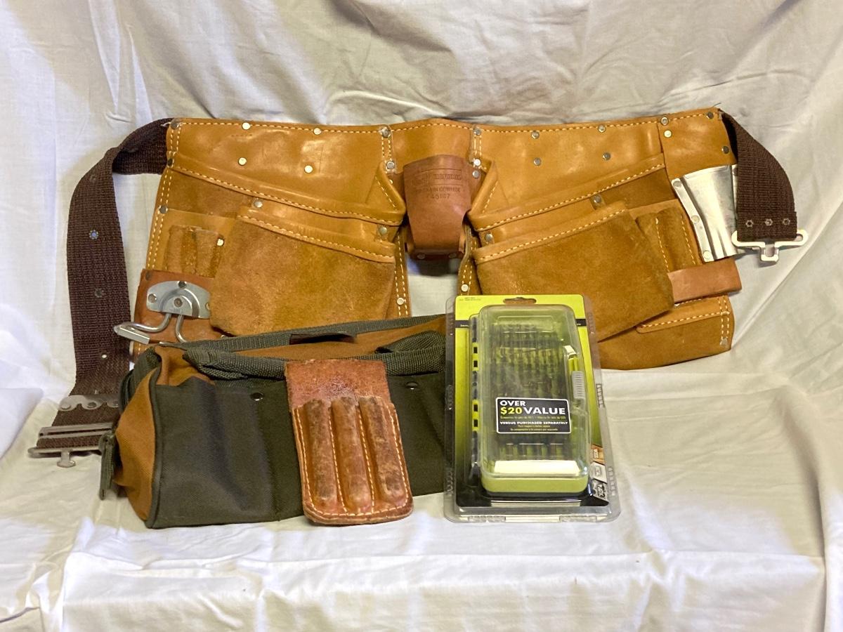 LOT 179: Bucket Boss Brand Gatemouth Jr Tool Bag, Craftsman Tool Belt, Pencil Holder, Ryobi Drill Bits