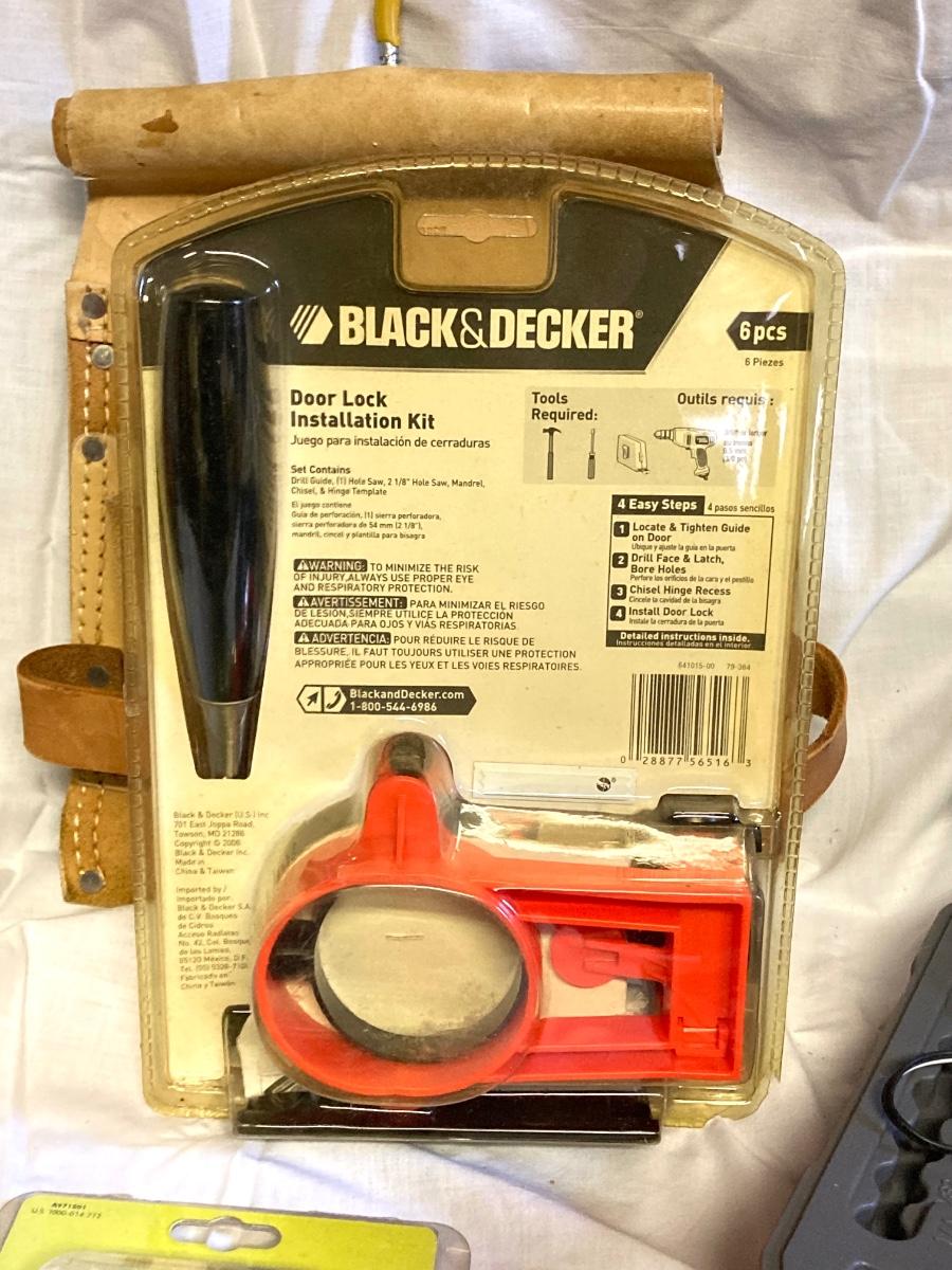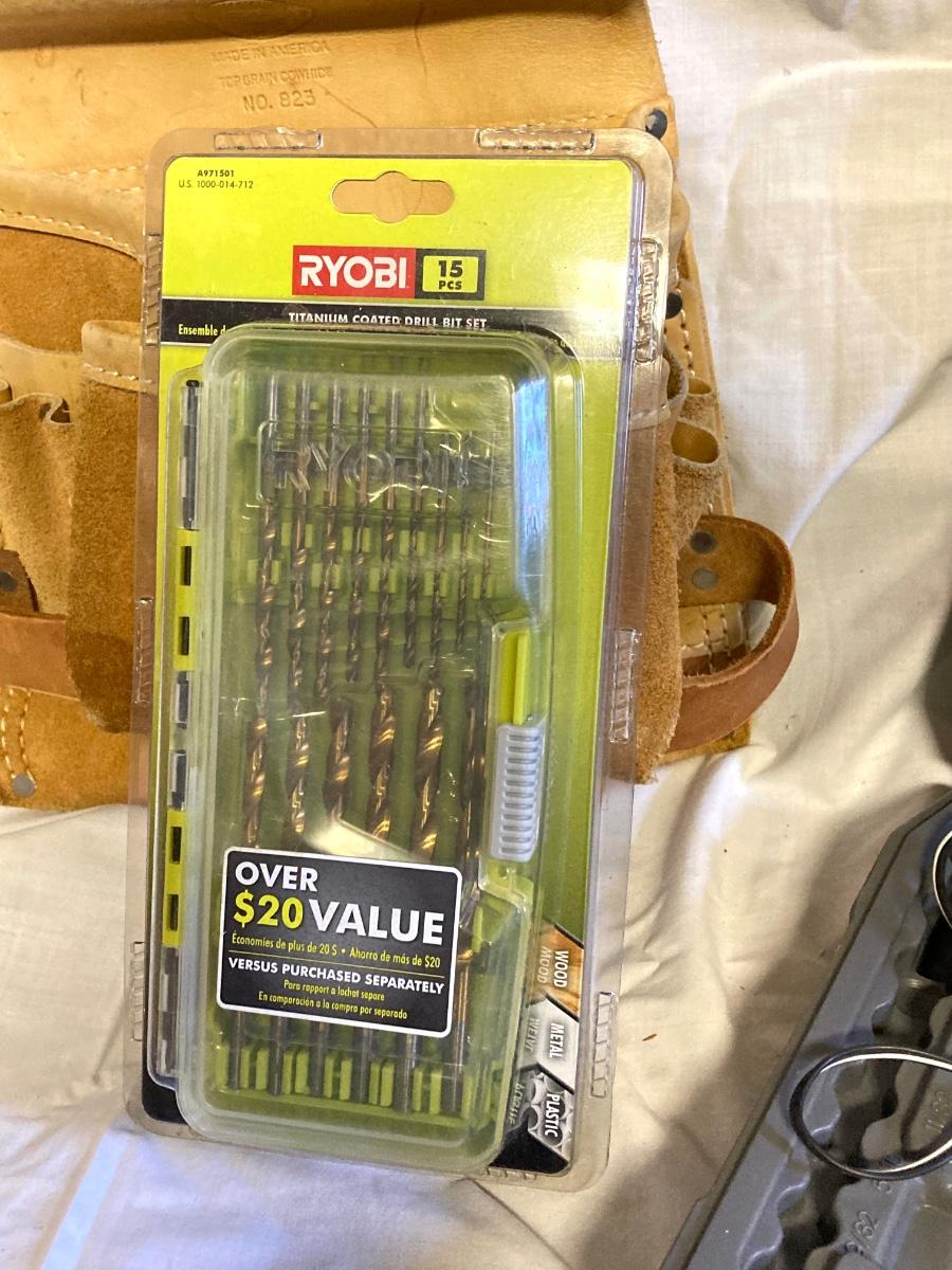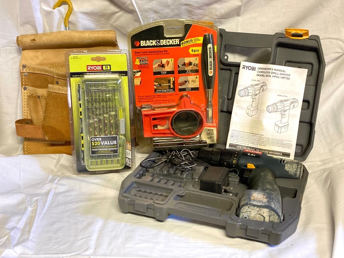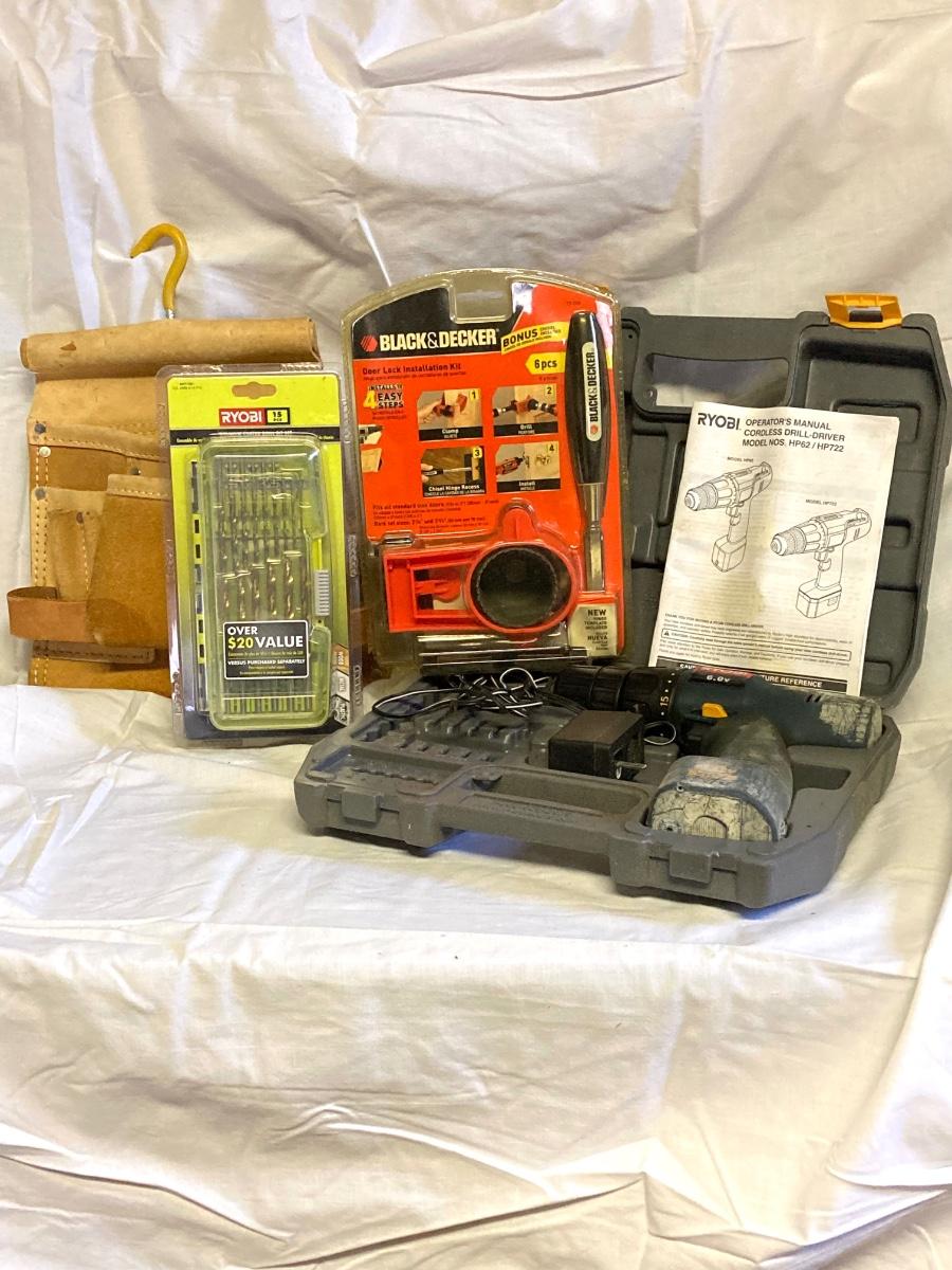 LOT 180: Ryobi Cordless Drill, Ryobi Drill Bits, Black & Decker Door Lock Installation Kit and Nicholas Tool Pouch