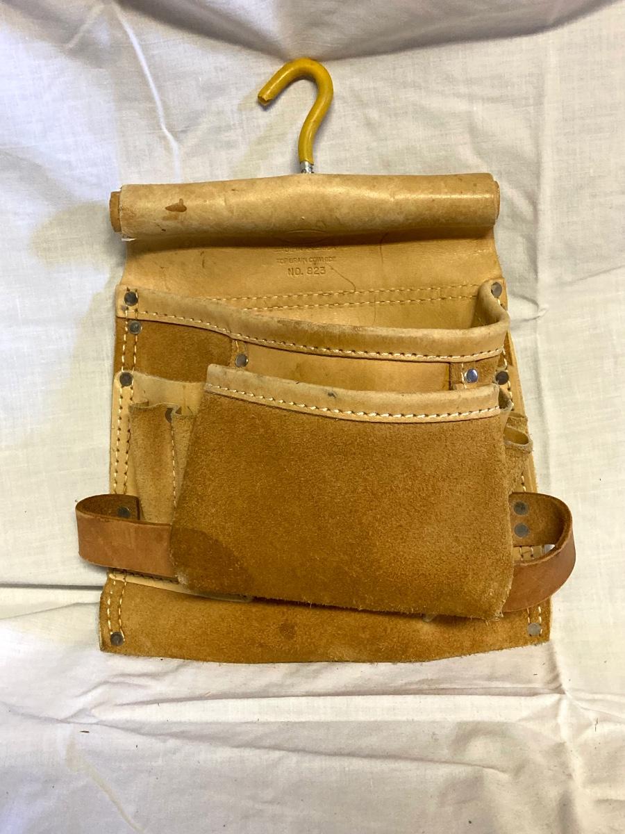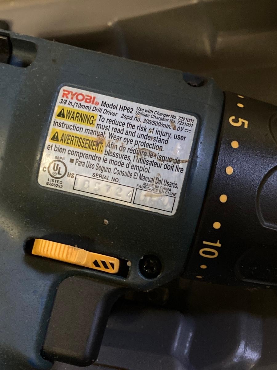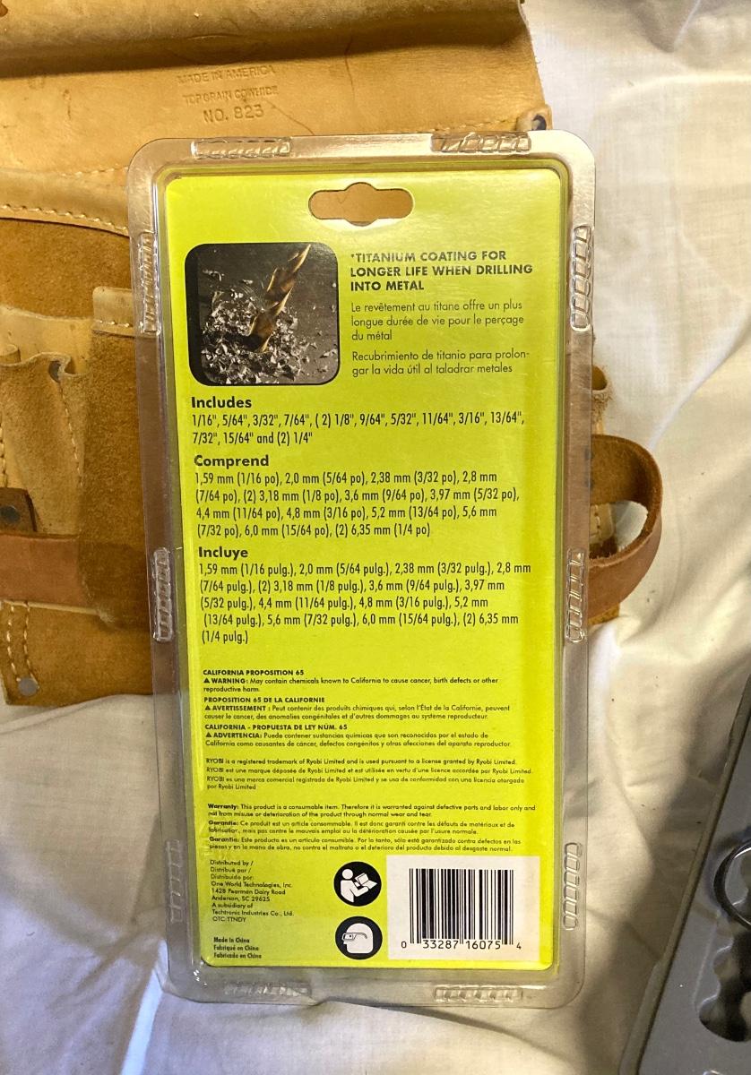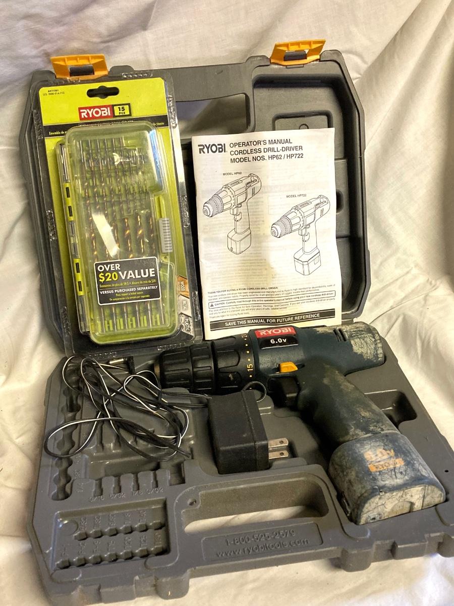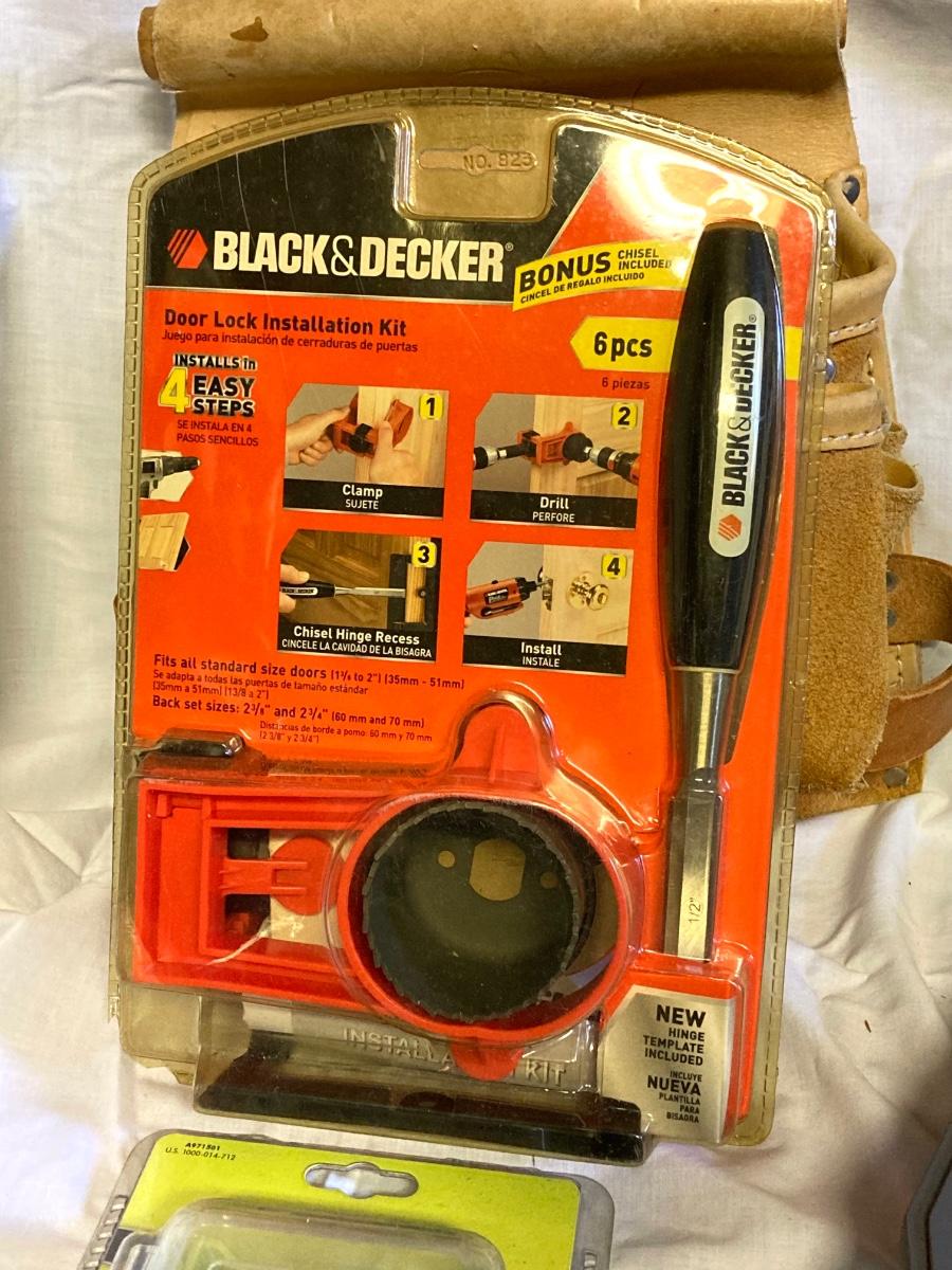 LOT 180: Ryobi Cordless Drill, Ryobi Drill Bits, Black & Decker Door Lock Installation Kit and Nicholas Tool Pouch