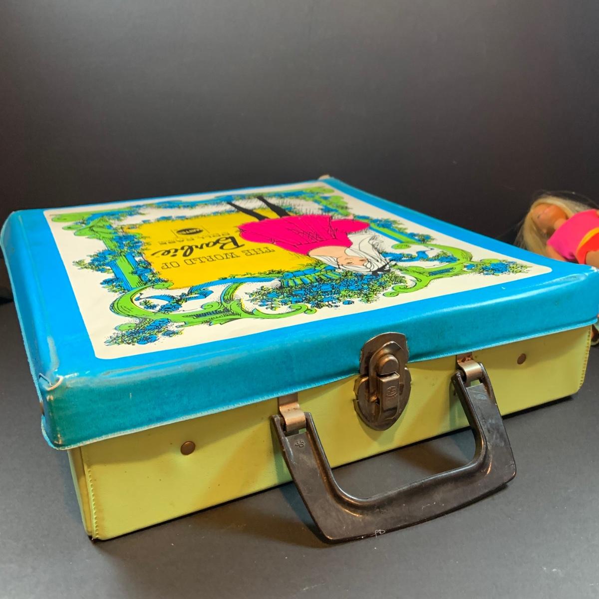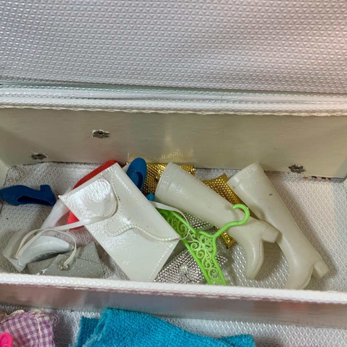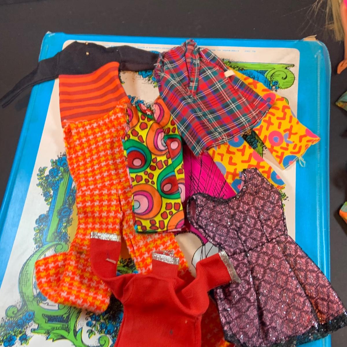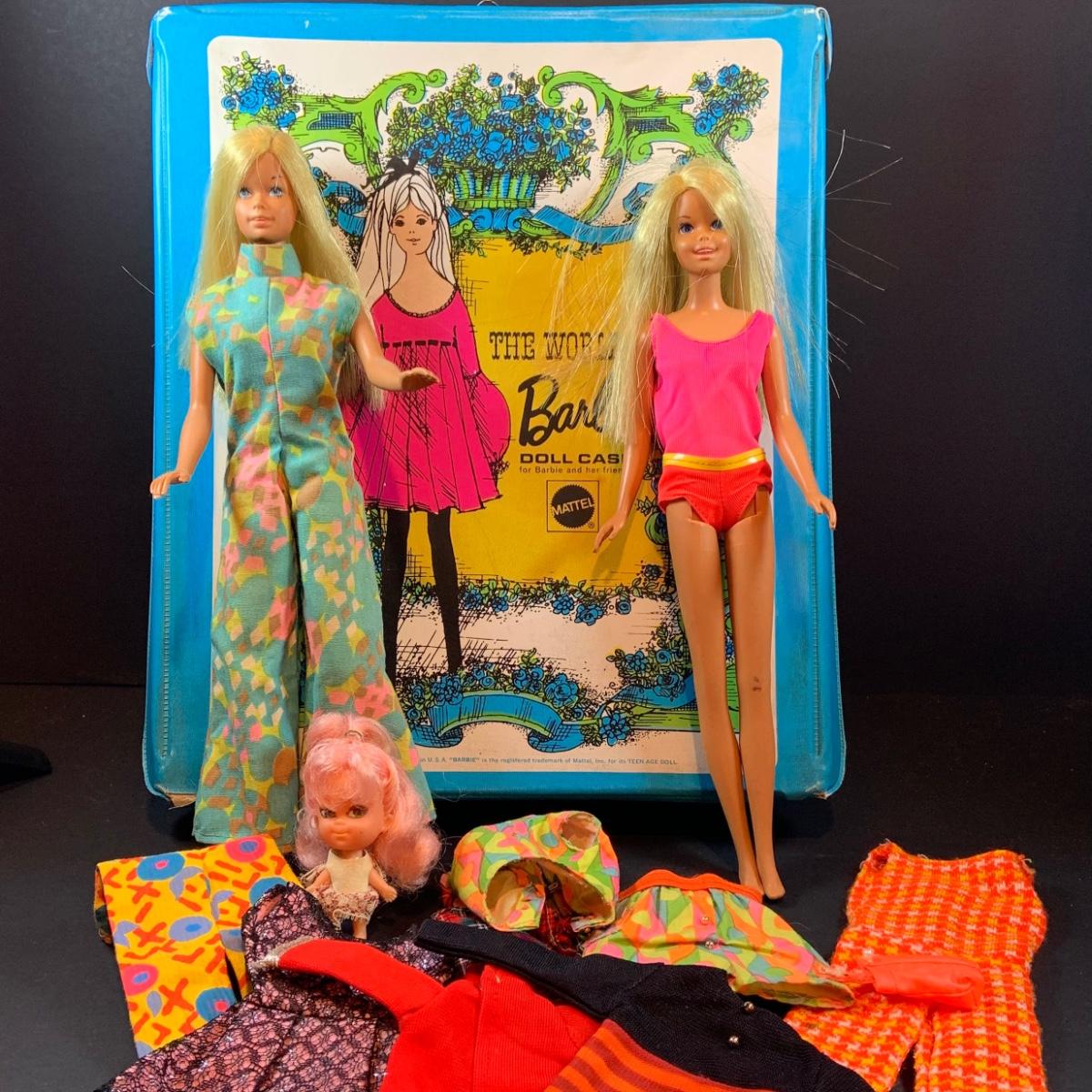 LOT 197: Vintage Barbie Doll Case (1968) Loaded with Groovy 60's Clothing; Babrie (1966), Francie (1966) and Little Kiddies Dolls