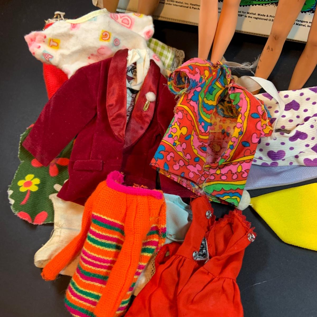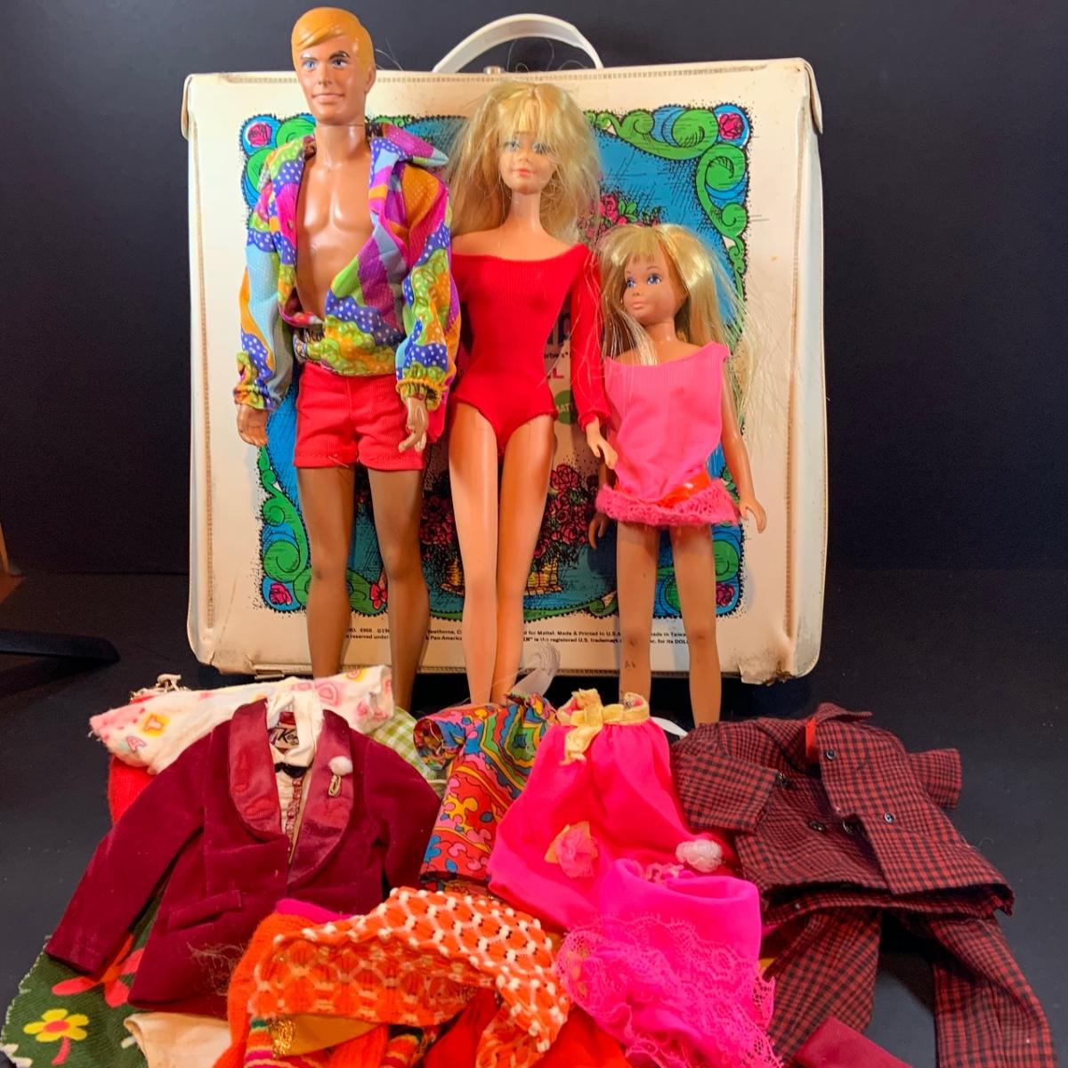 LOT 198: Vintage Skipper Doll Case Loaded with 60's Clothing for Ken, Skipper, Francie and Barbie, and a Ken (1966) Barbie (1967) and Stacie (1967) Dolls