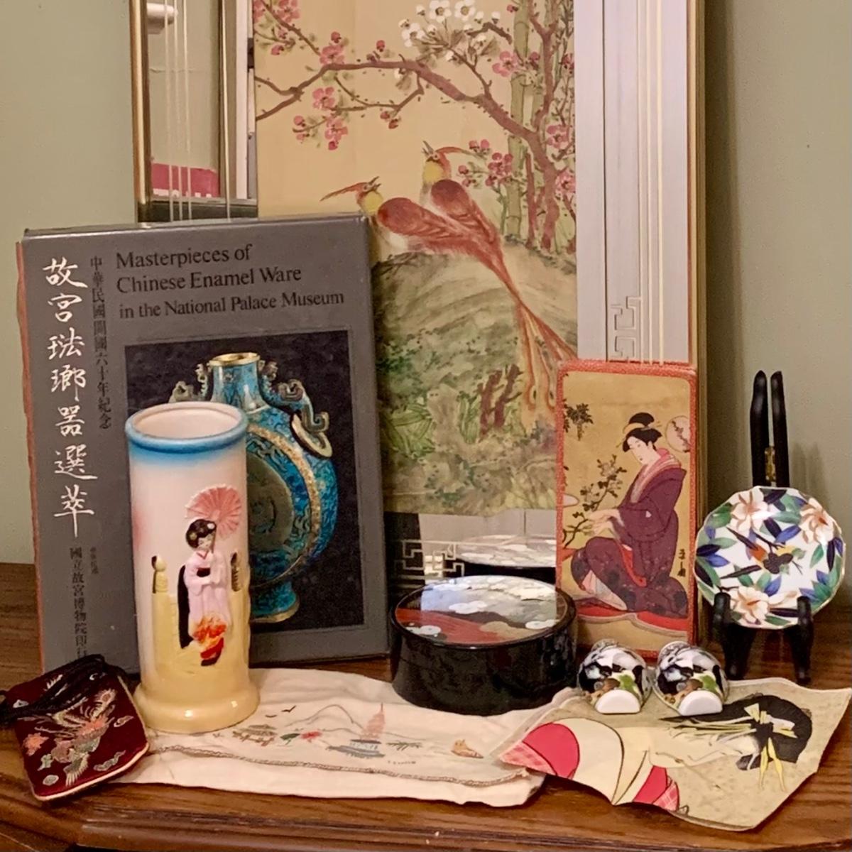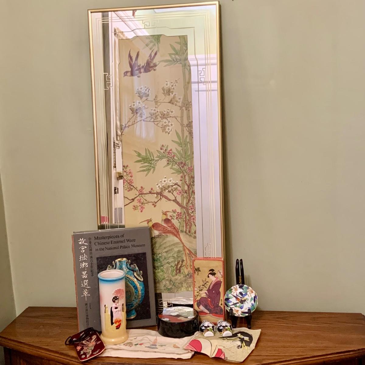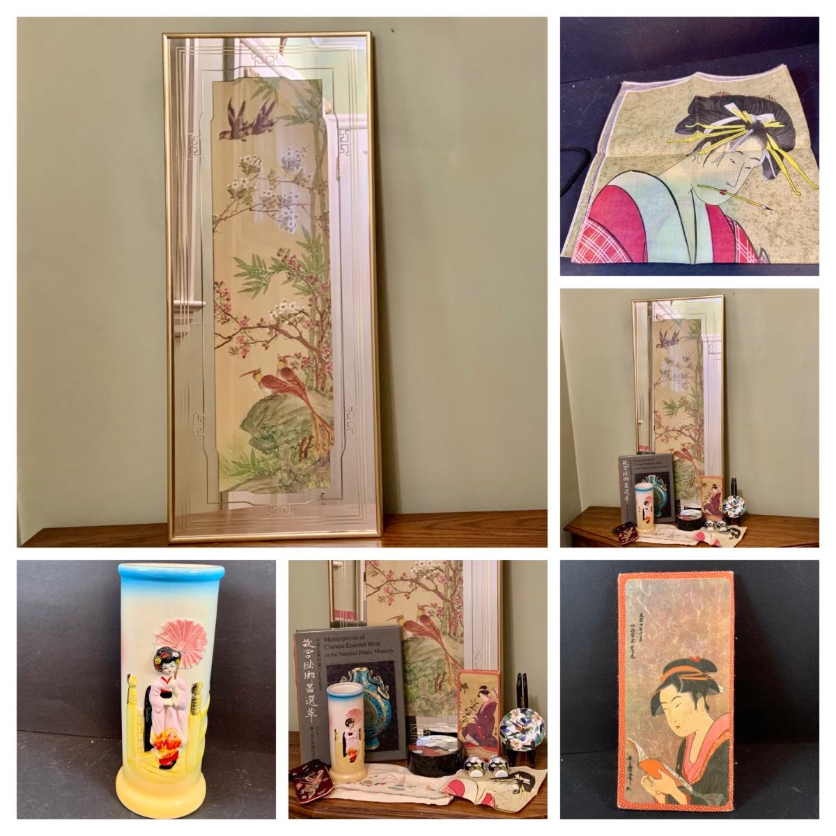 LOT 205: Academy Arts Chinese Bird Panels with Dull Gold Foil Background and Scrub-out Mirror, Japanese Tiki Mug, and Other Asian Inspired Items