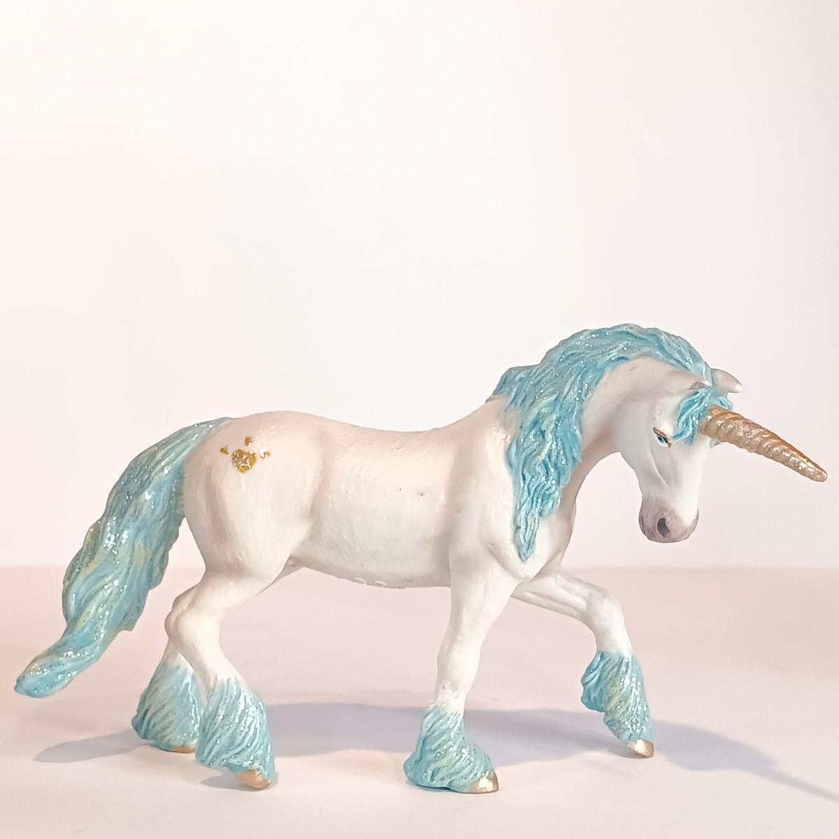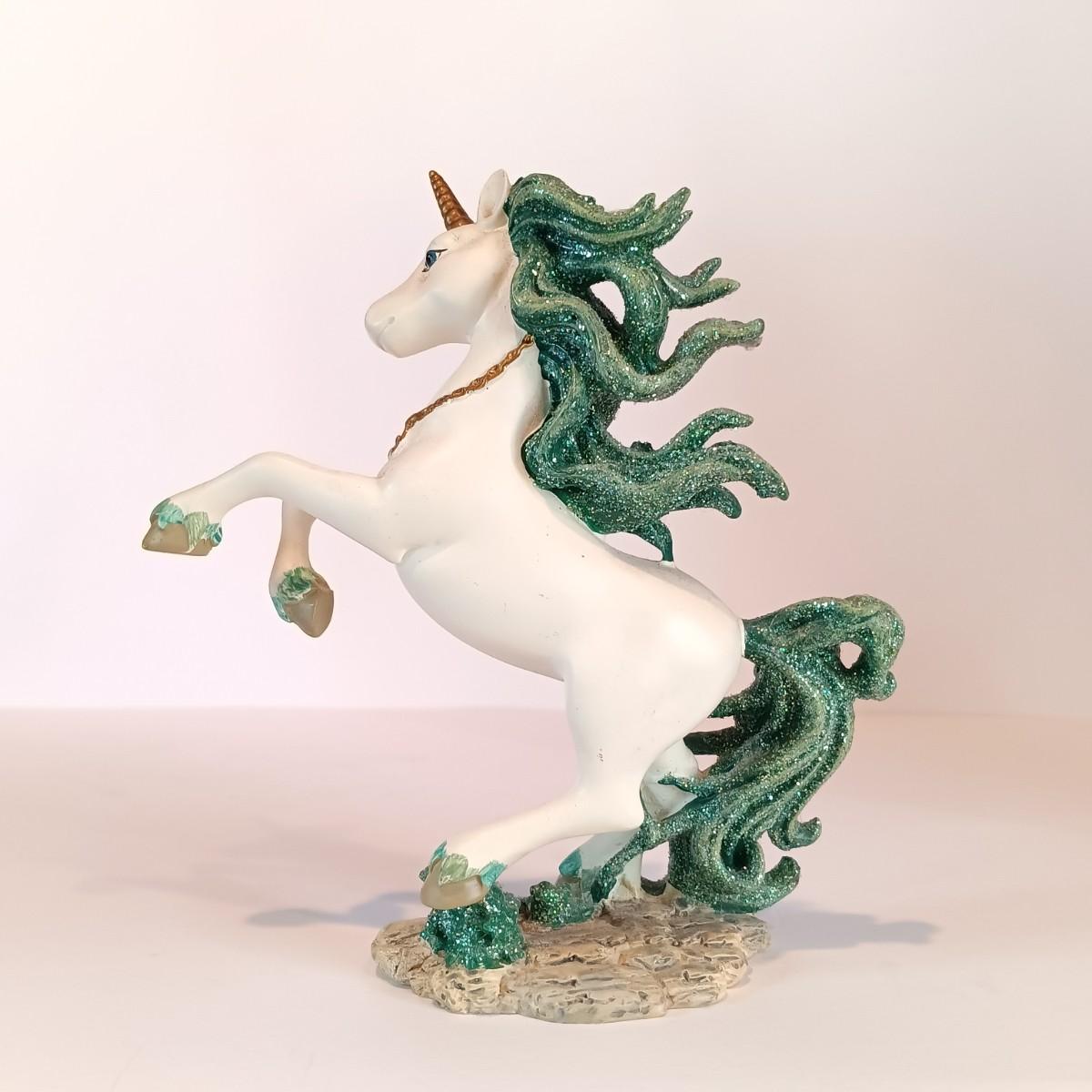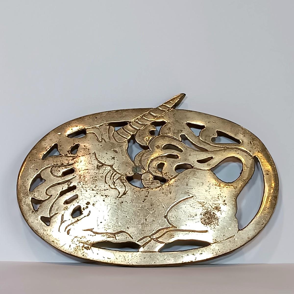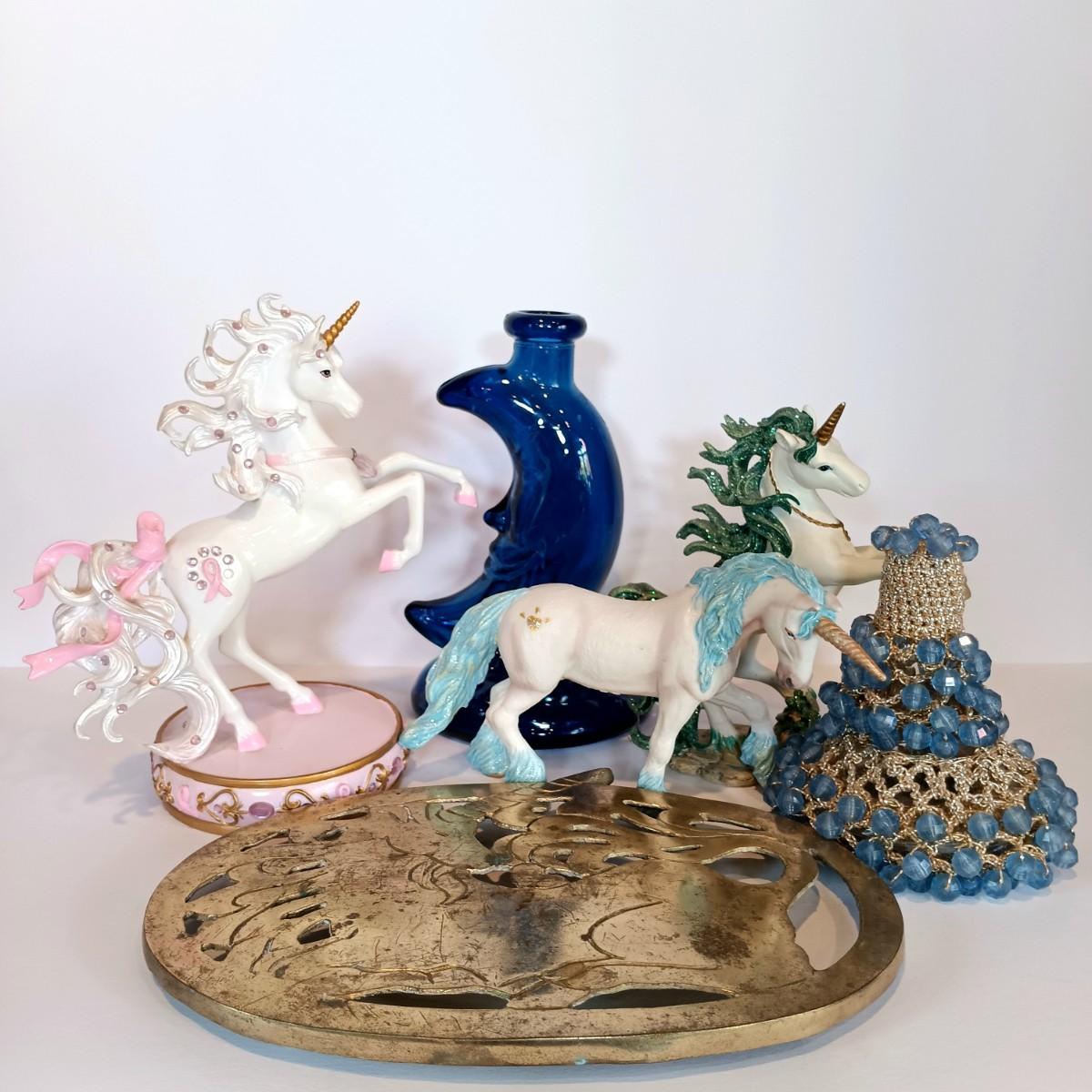LOT 32A: Brass Unicorn Trivet, Pink is for Hope Unicorn, Cobalt Blue Half-Moon Art Glass & More