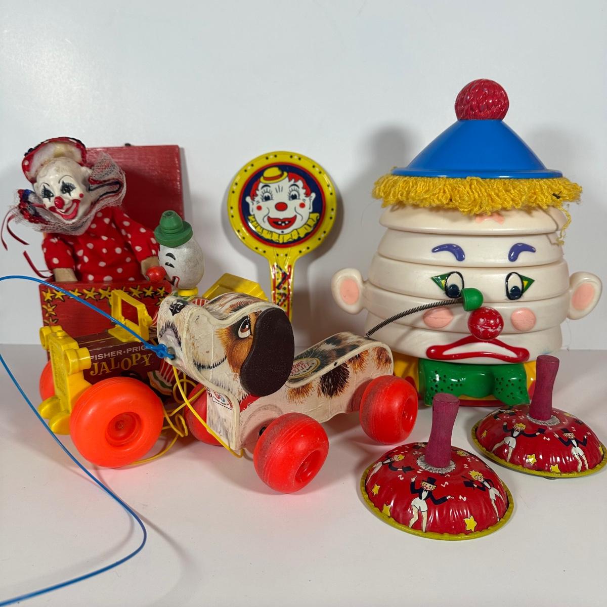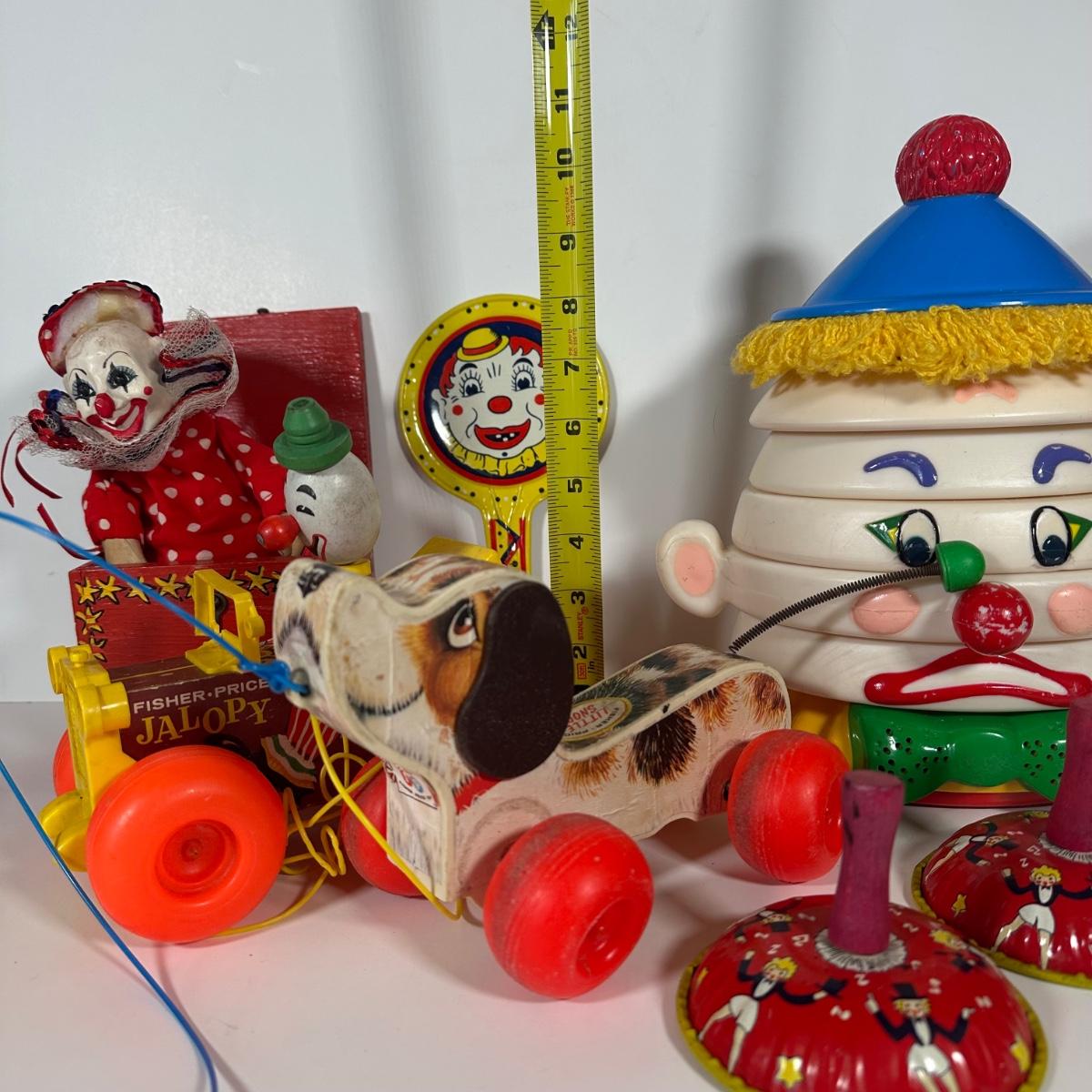 LOT 103C: Vintage Children’s Toys - Fisher Price 1965 Jolly Jalopy & Little Snoopy pull toys, Joanne Fox Jack in the Box & More