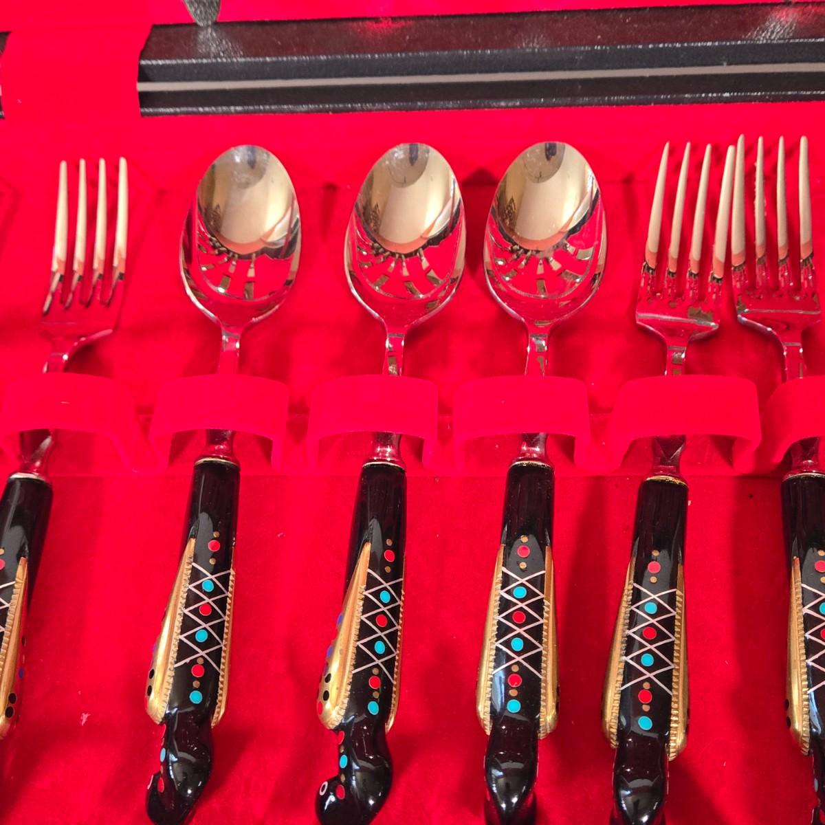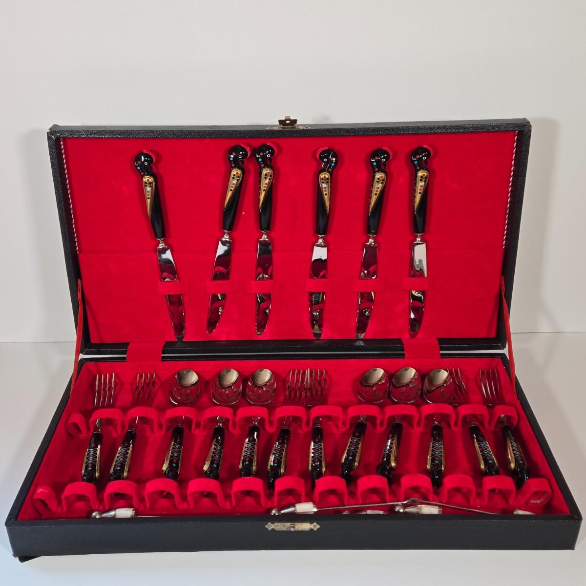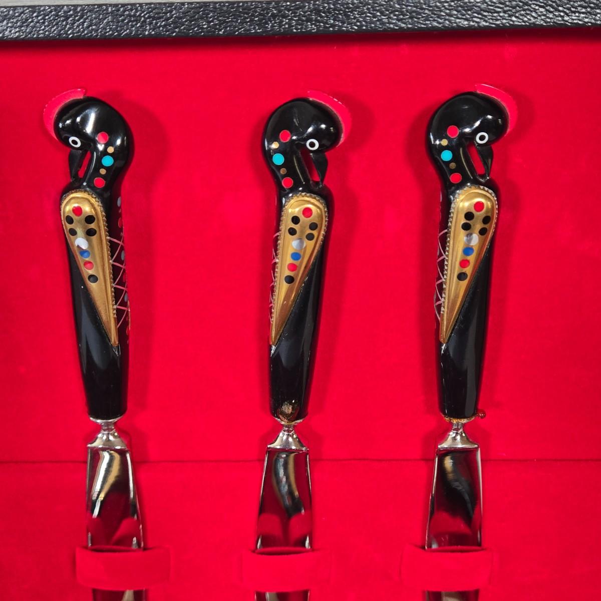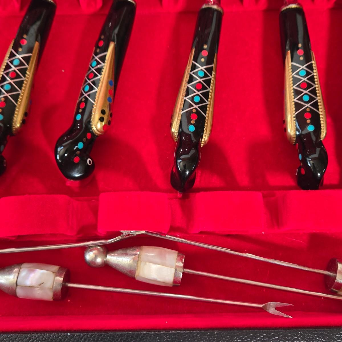 LOT 143B : MID CENTURY MIDDLE EASTERN LEBANESE CARVED PHOENIX BIRD CUTLERY SET & Mother of pearl fondue skewers l