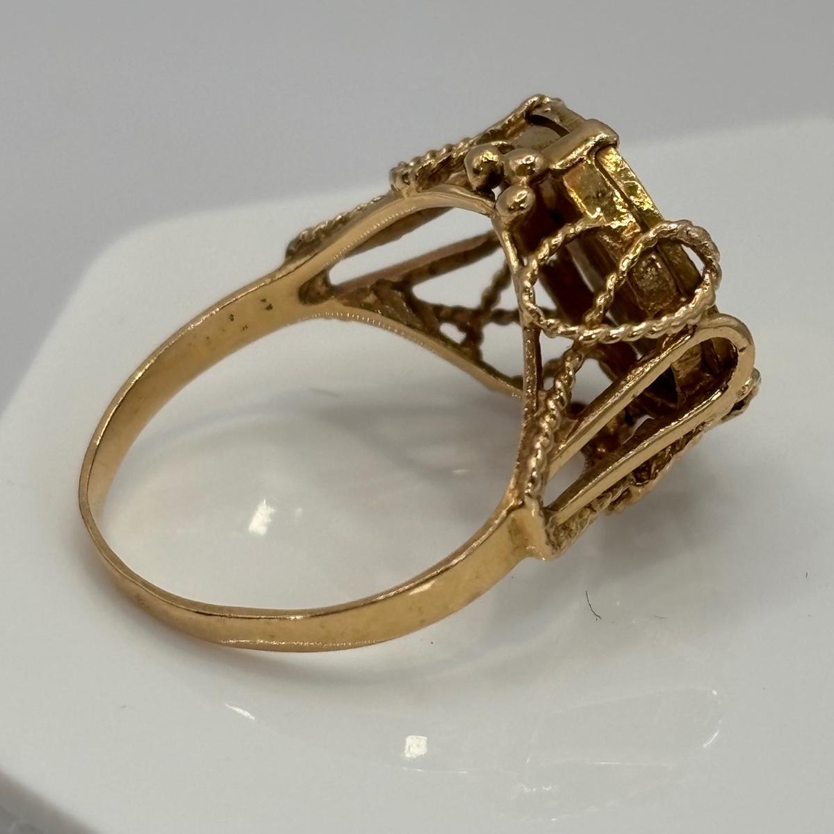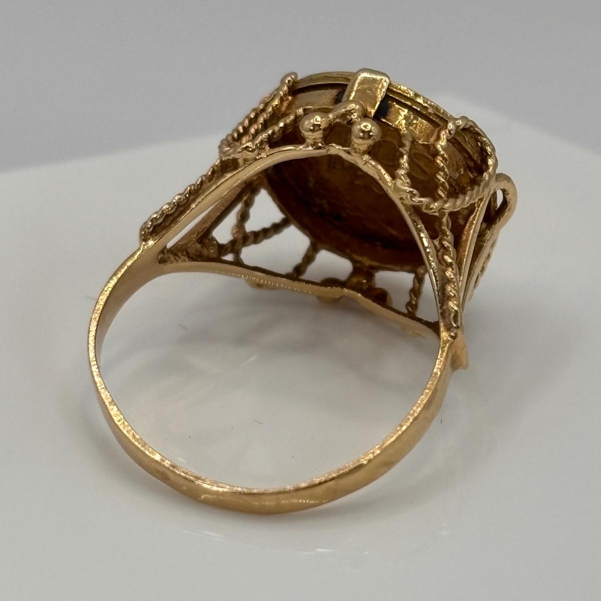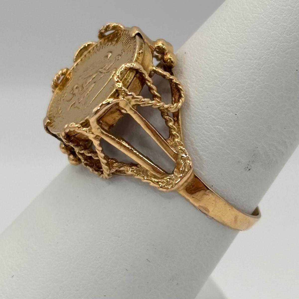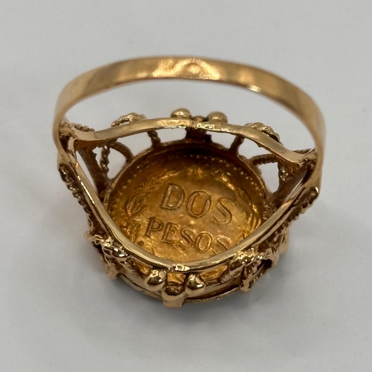 LOT 300: 1945 Dos Pesos Mexican Gold Coin Ring Size 6.5, 18k Gold (Tested) The Coin is 1.66g and 90% Gold and the Setting is 18K Gold.