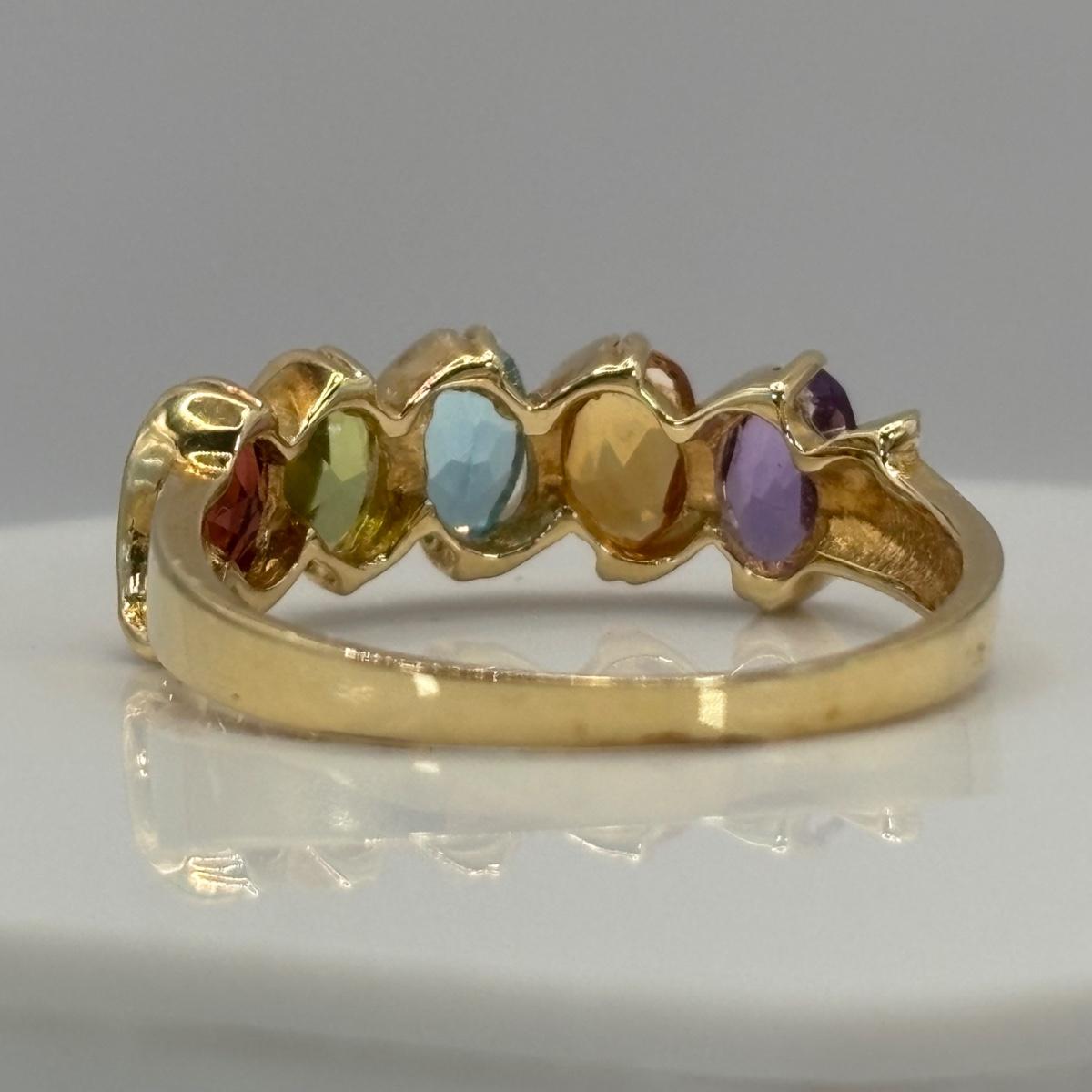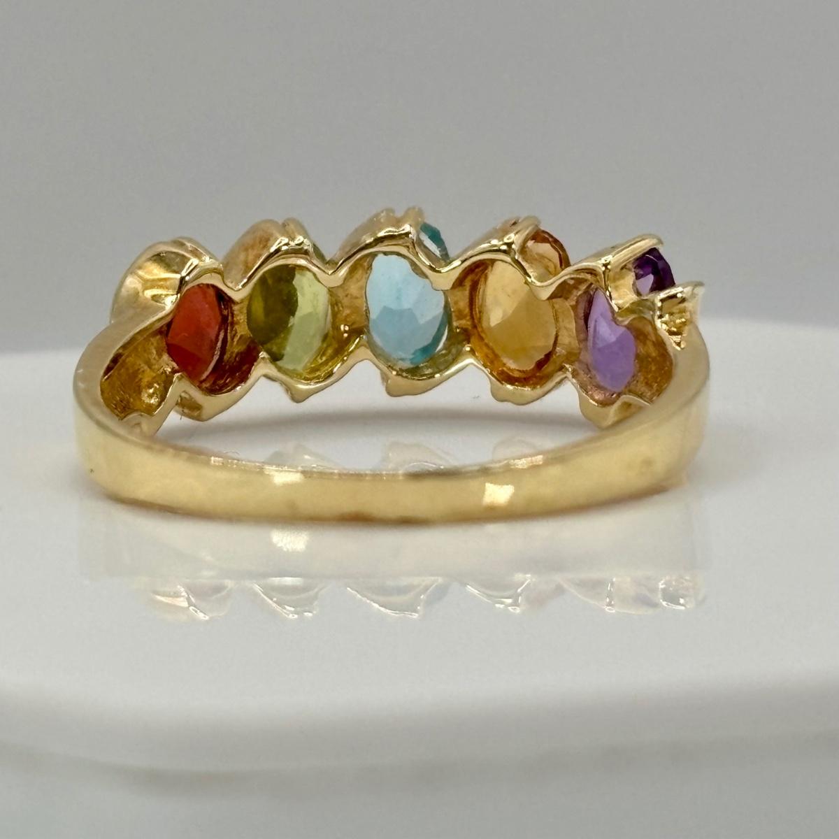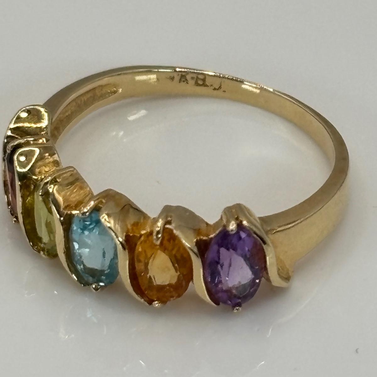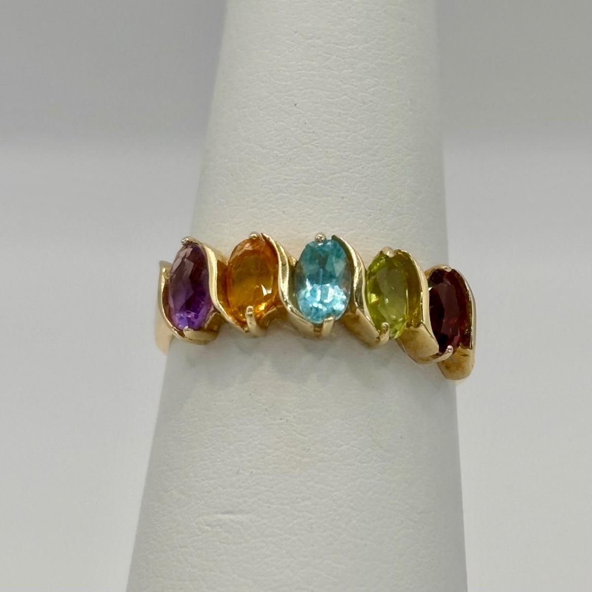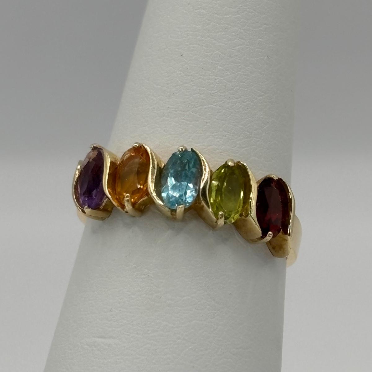LOT 298: 14 K Gold (tested) Ring Semi-Precious Gemstone Anethyst, Blue Topaz, Peridot, Garnet Size 6 - 2.1 gtw