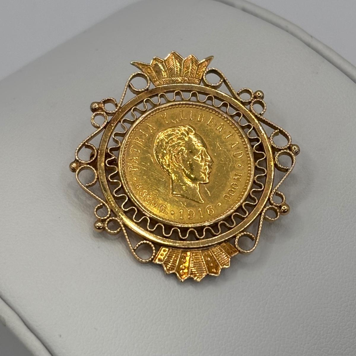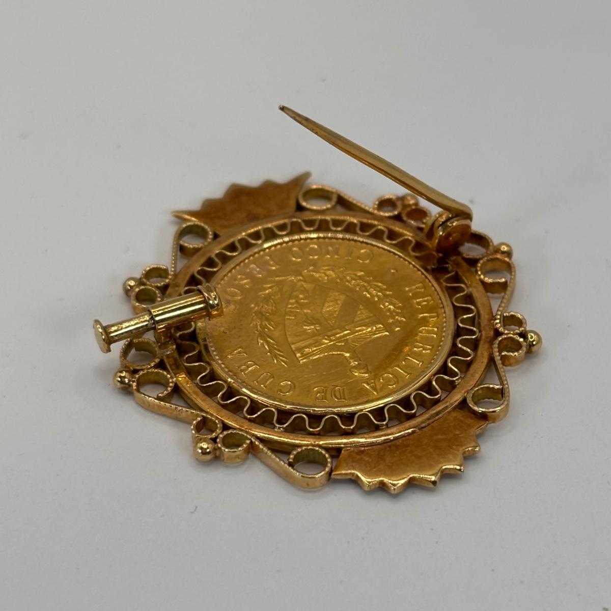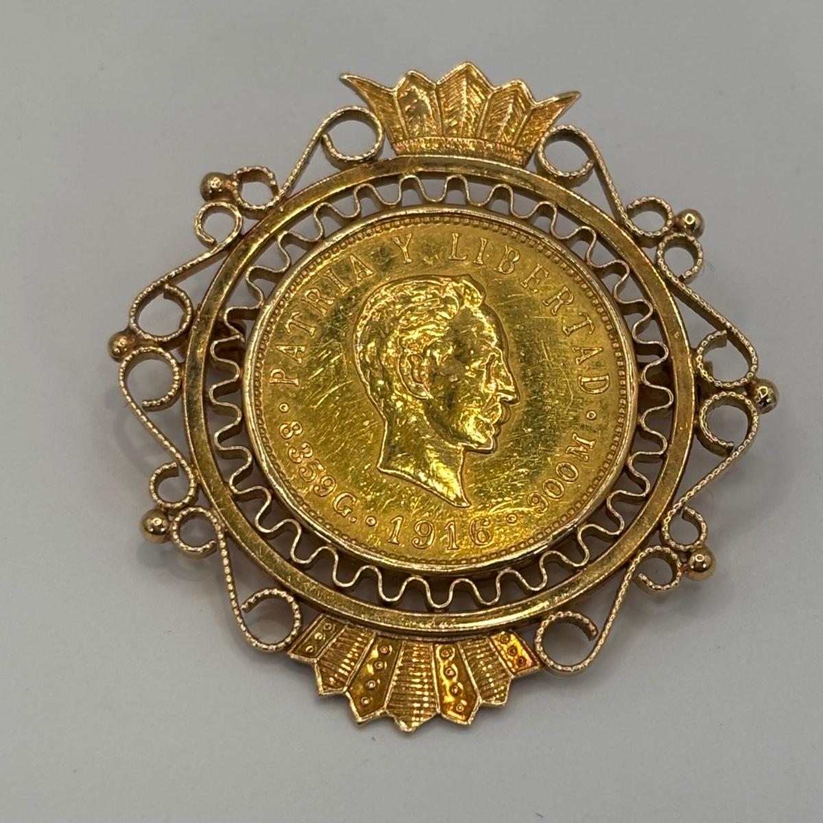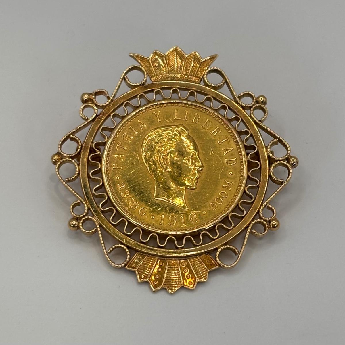 LOT 303: Antique 18 K Gold (Tested) 1916 Cuban 5 Peso Gold Coin Brooch with Trombone Clasp 15.3 g