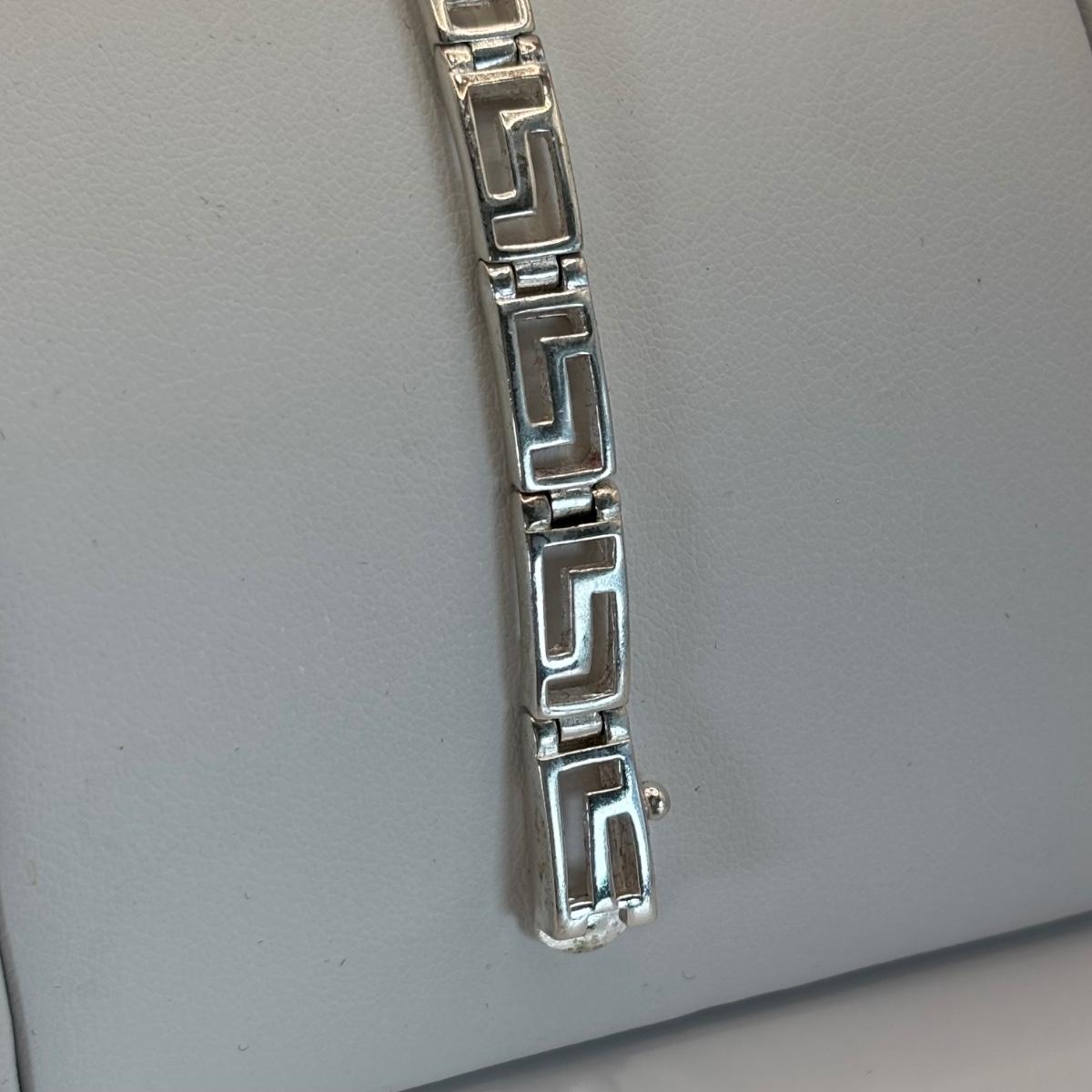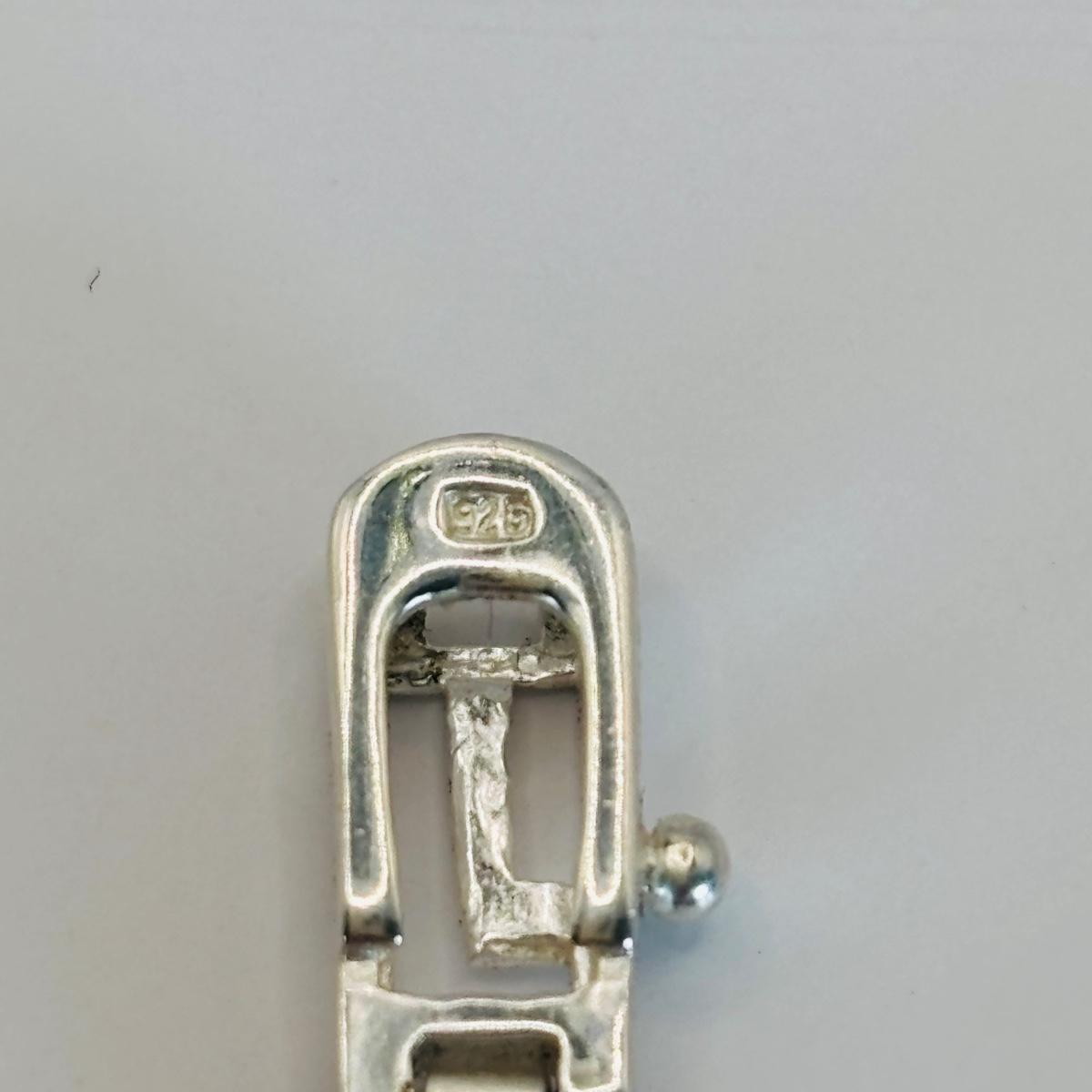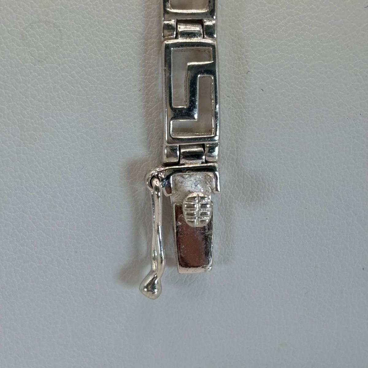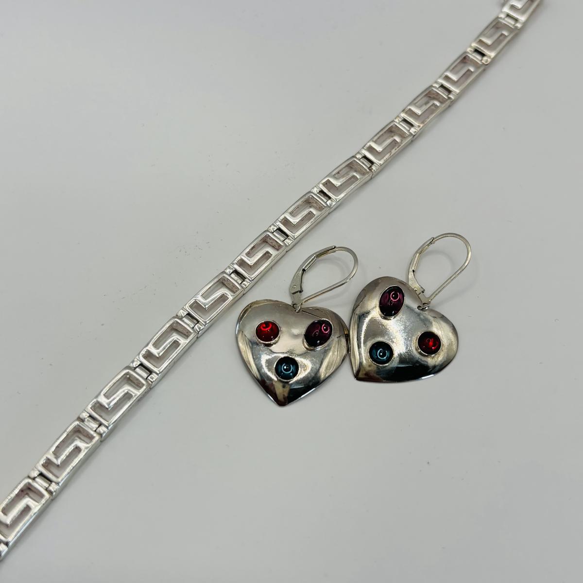 LOT 315: Sterling Silver 925 Pierced Heart Shaped Earrings with Gemstones and Sterling Silver 925 Greek Key Design Braclet with Saftey Clasp 7" Long and 13.1 G