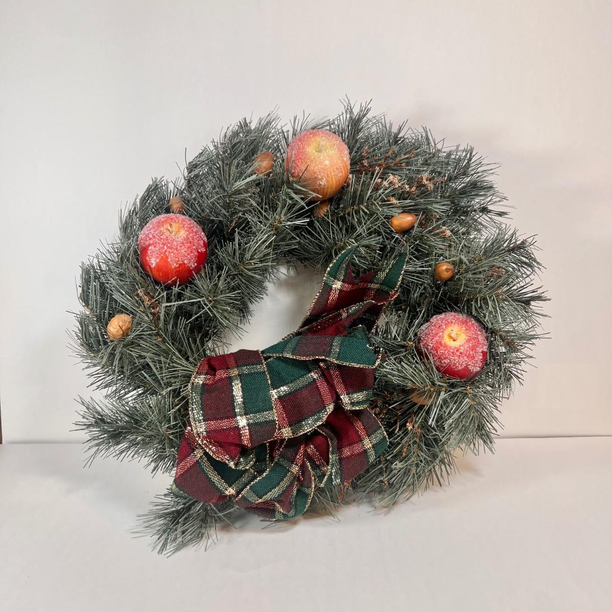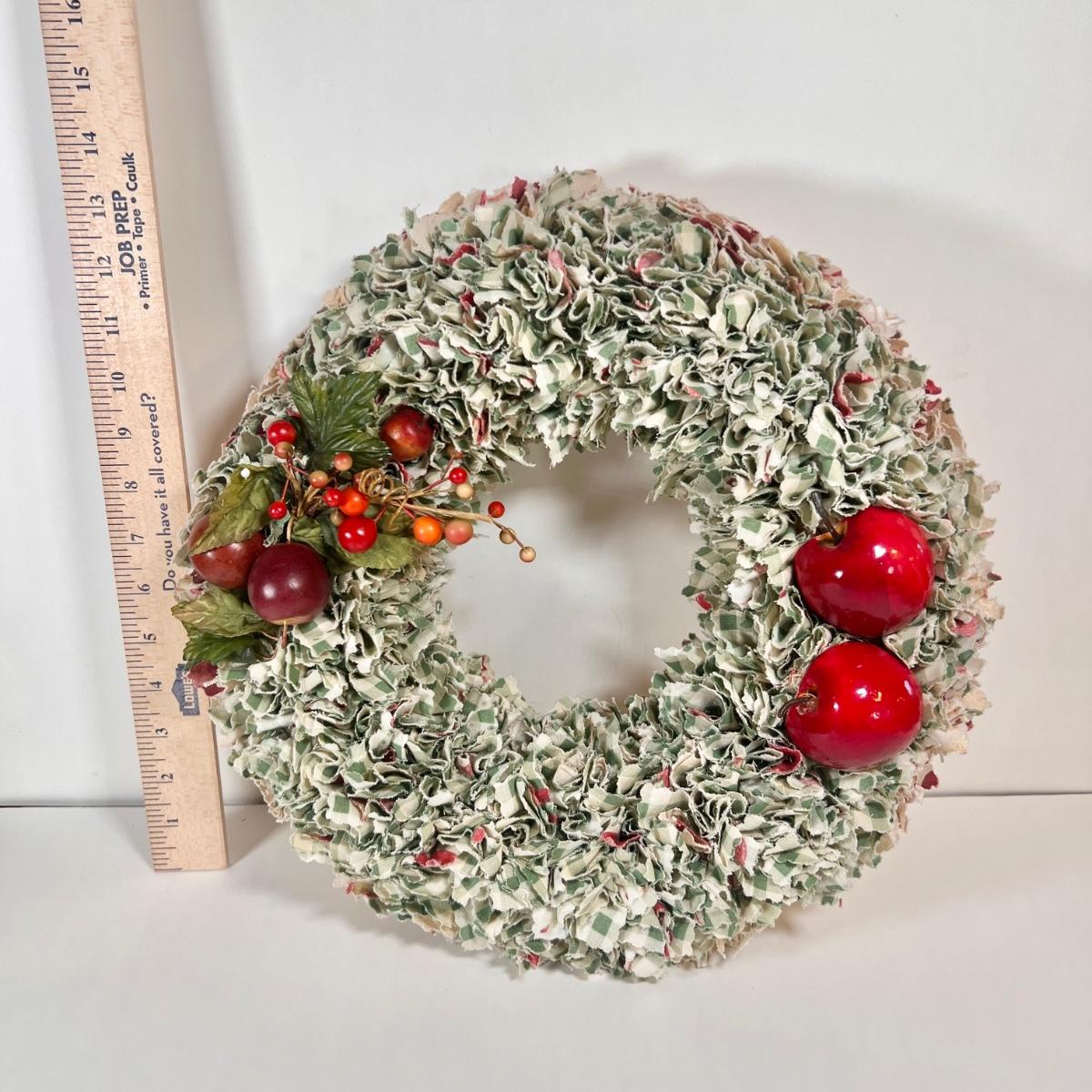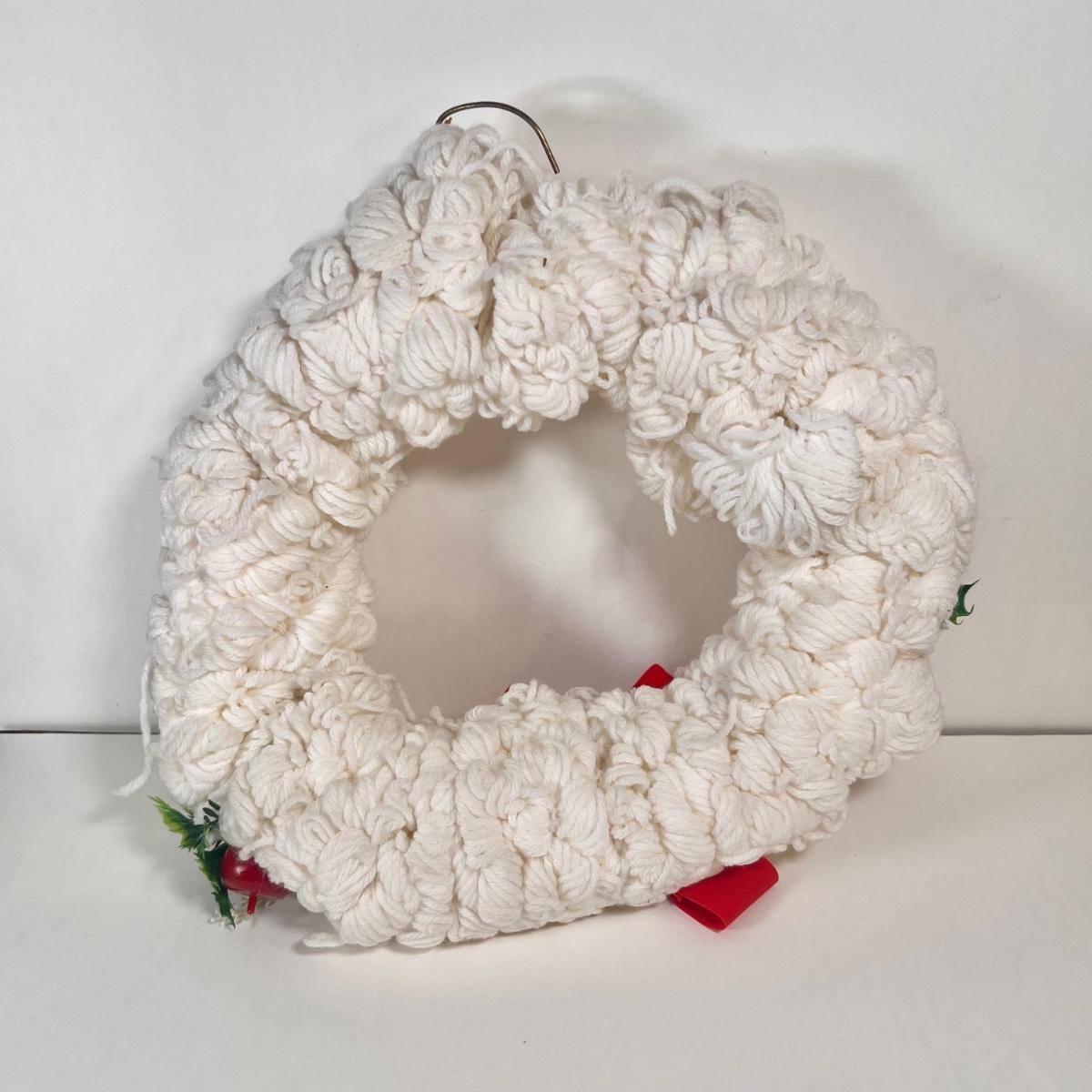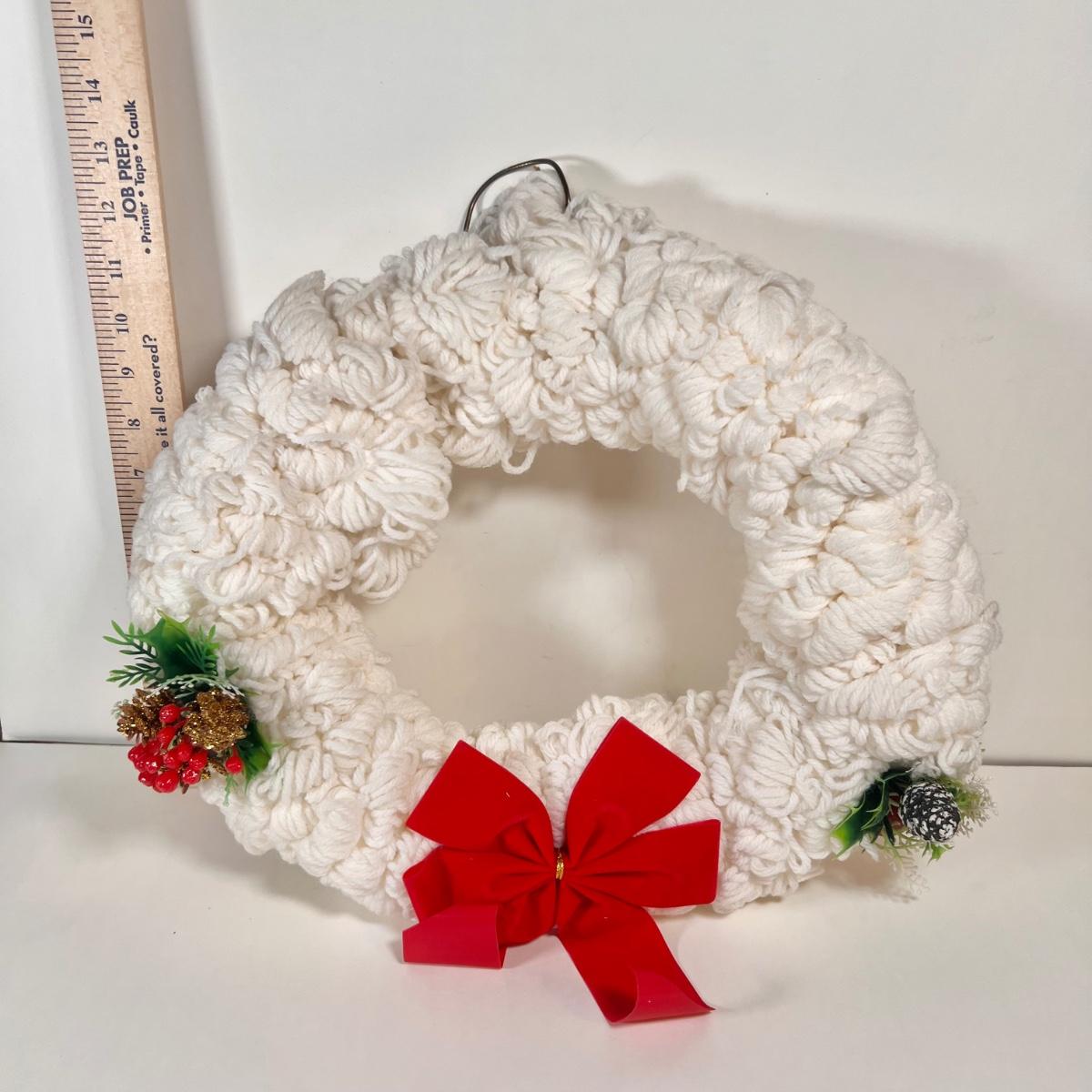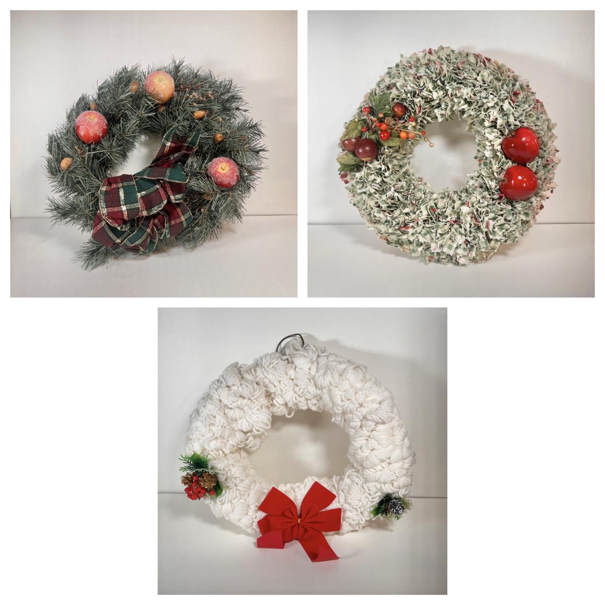 LOT 65L: Three Christmas Wreathes Decorated with Yarn, Bows & Artificial Fruit