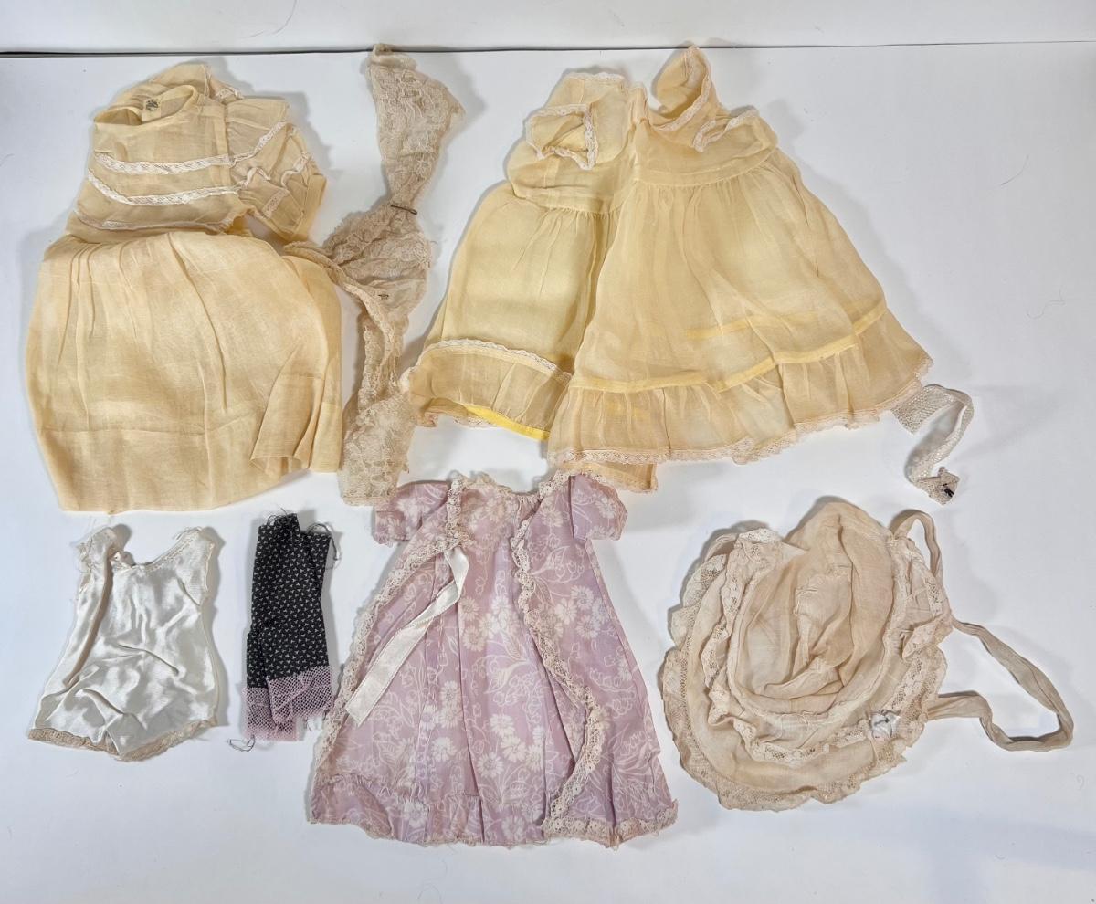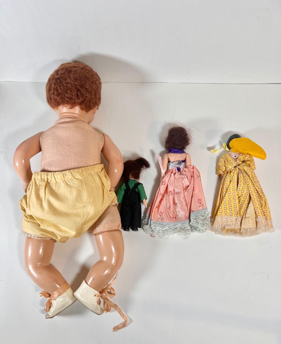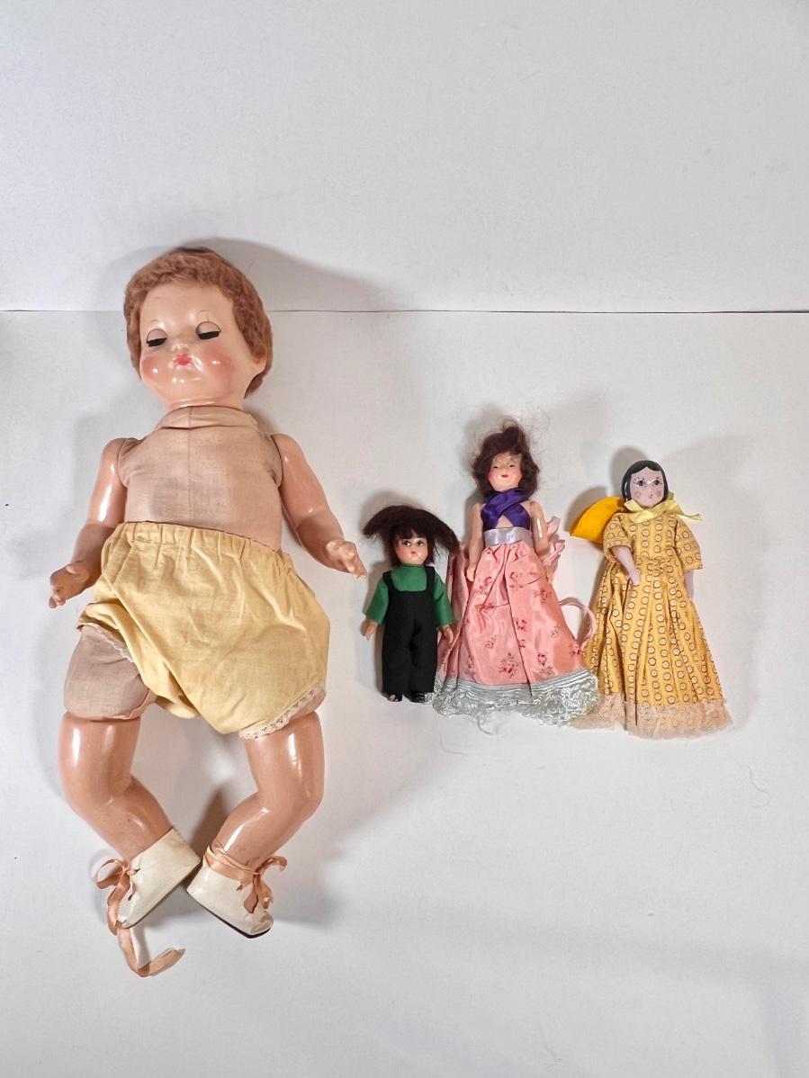 LOT 74L: Vintage / Soft Body Baby Doll, Small Porcelain Head Doll, Two Small Dress Up Dolls & Clothes (Dresses, Bonnets, Miniature Necklaces, Outfit Sets)