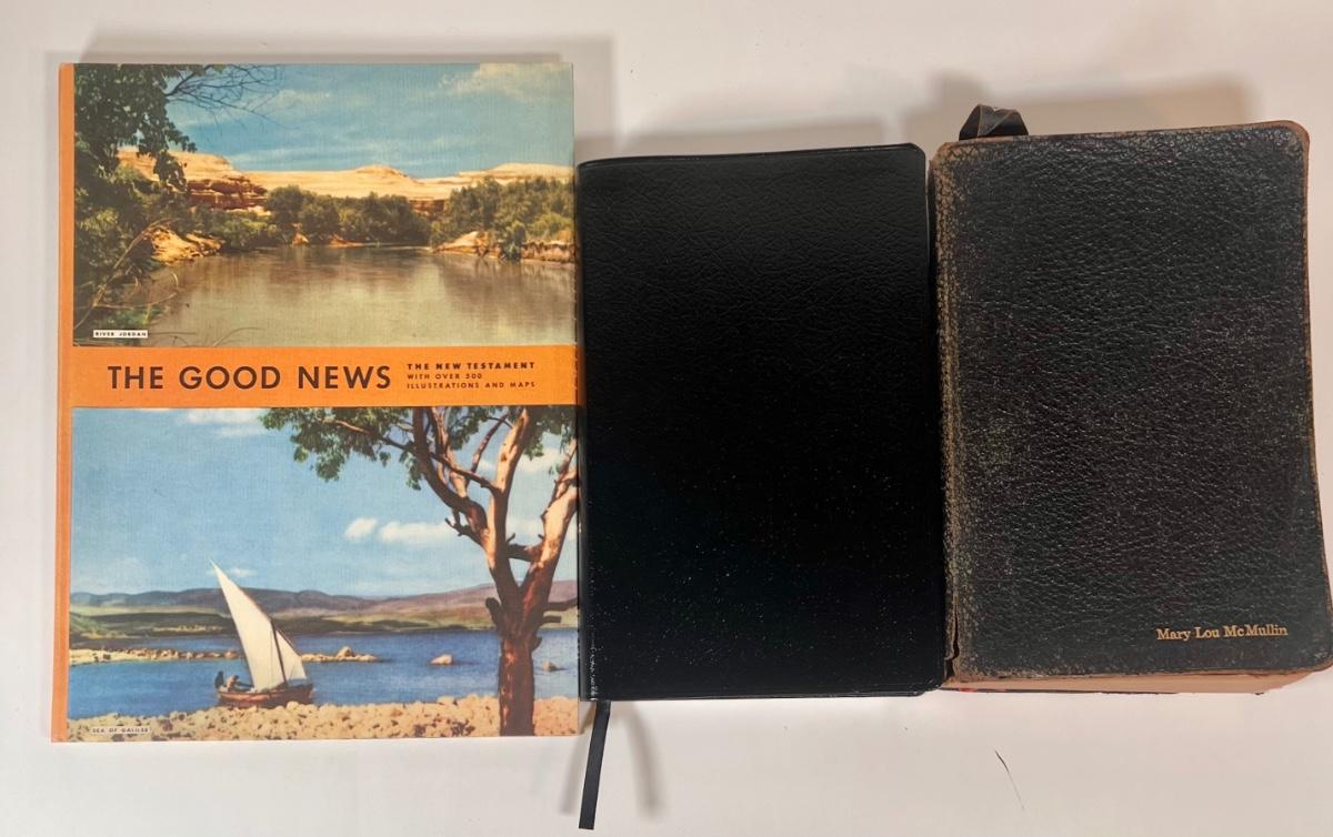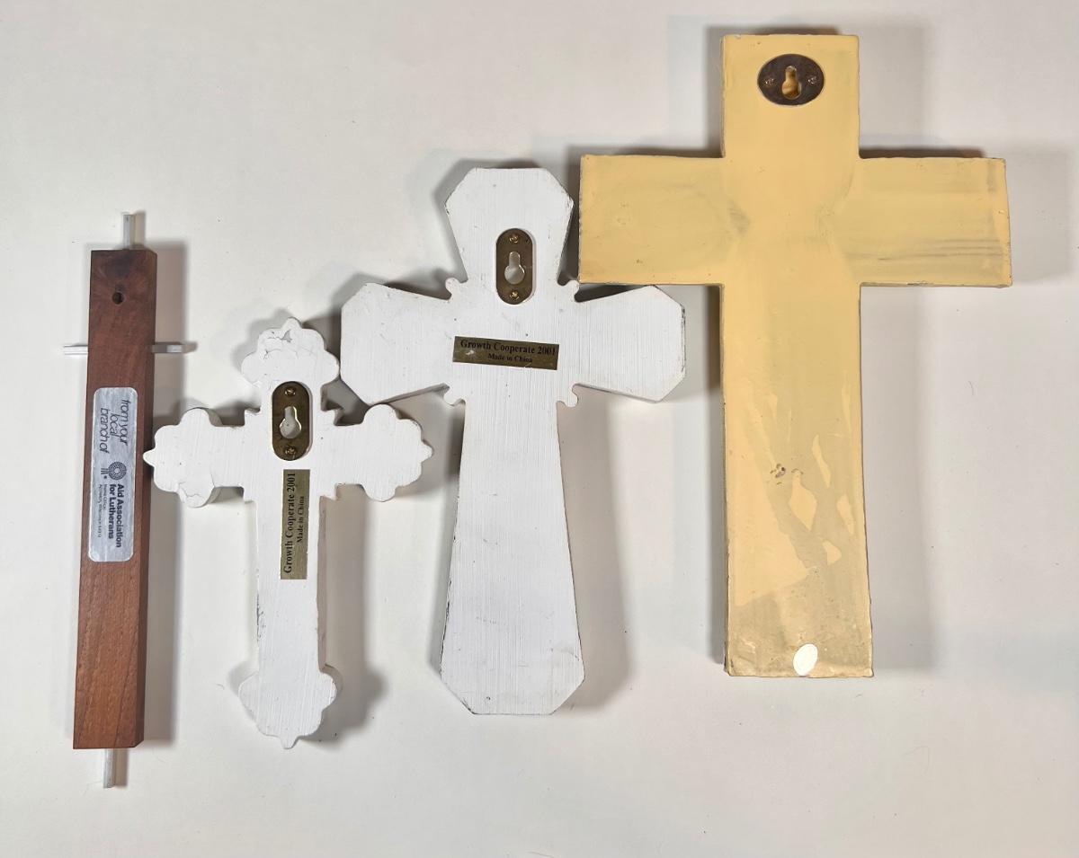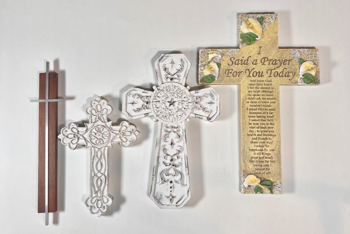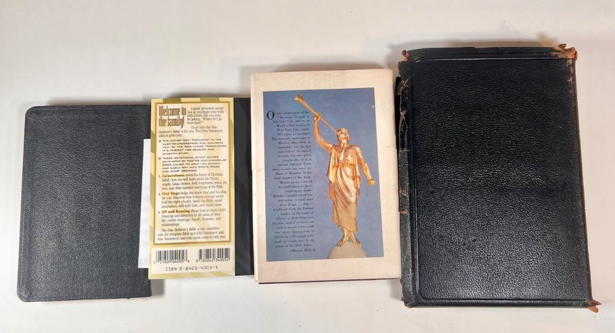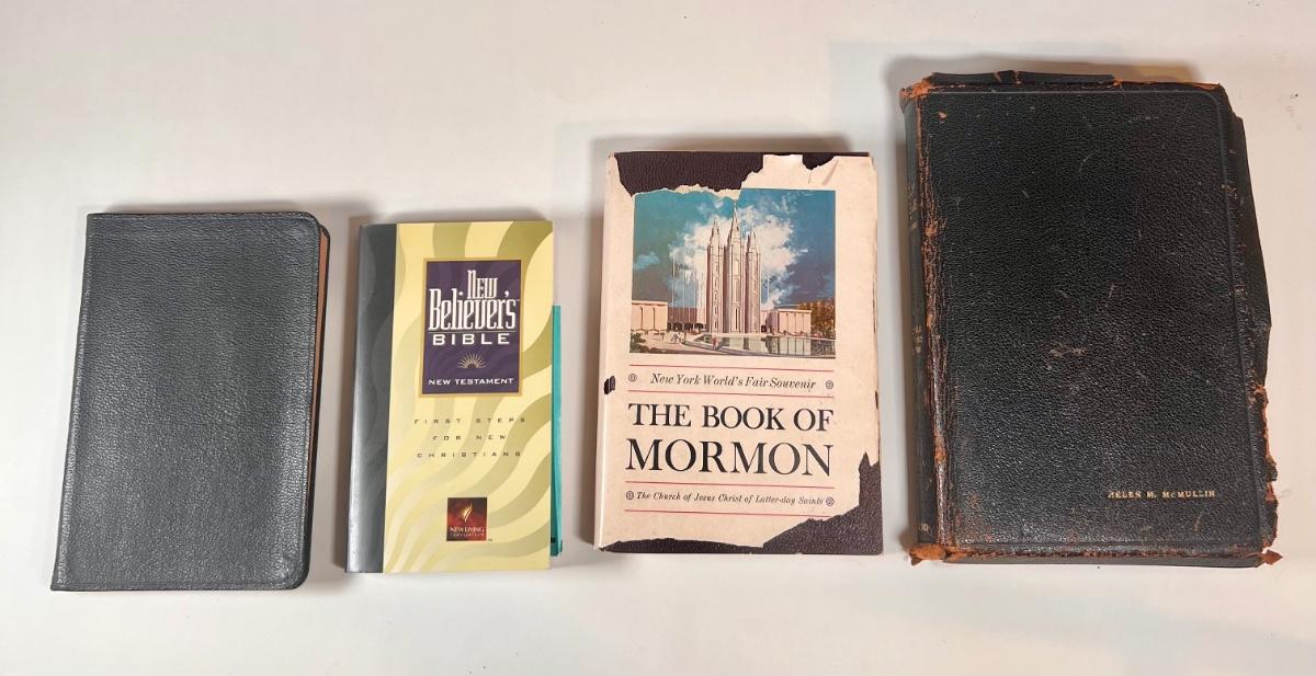 LOT 75L: 2001 Growth Corporate Pair Crosses, Lutheran Wood & Metal Cross, Yellow Prayer Cross, Small Cross Pendants, The Book of Mormon, & Various Editions of The Holy Bible