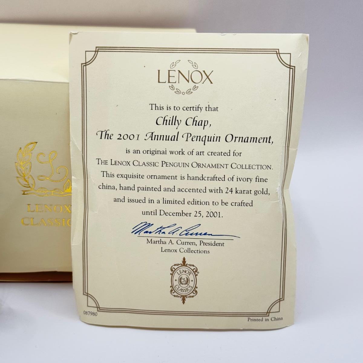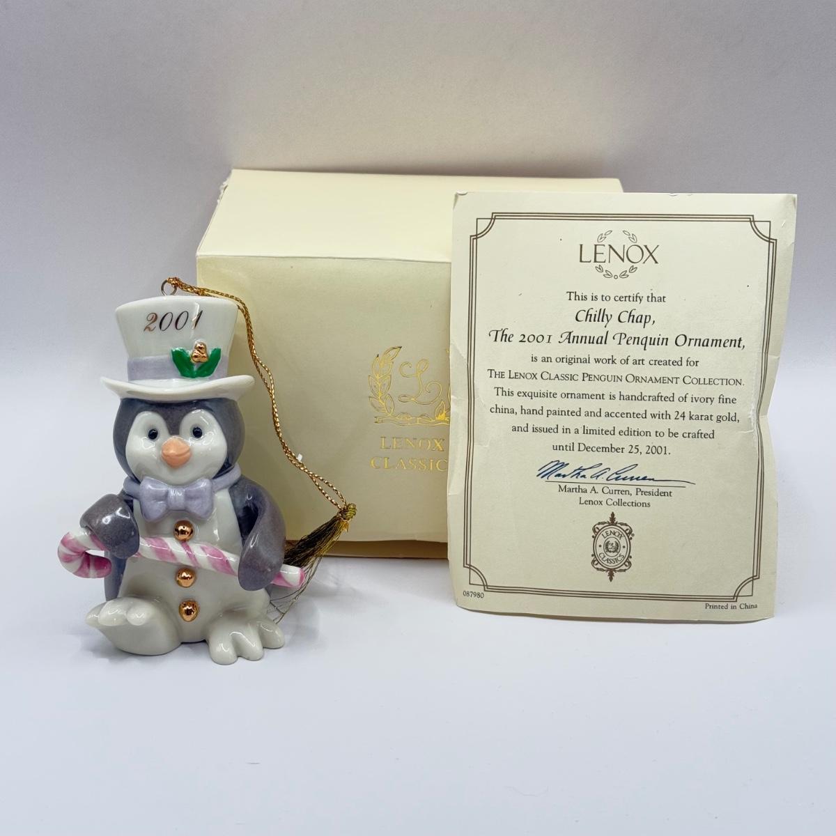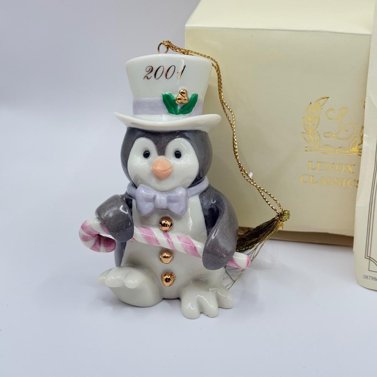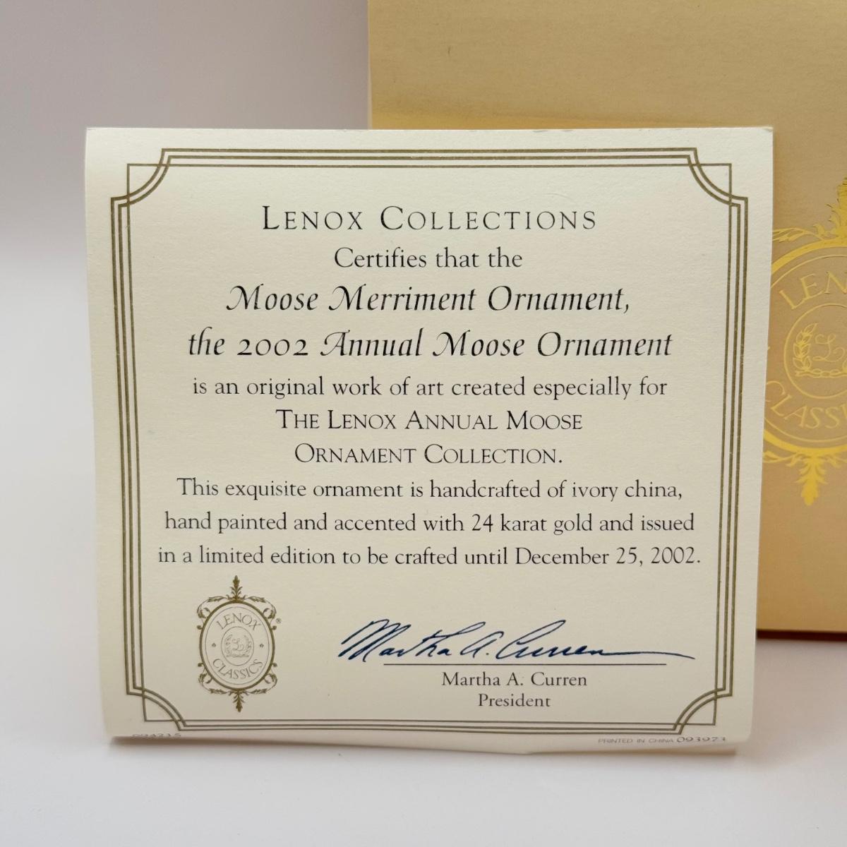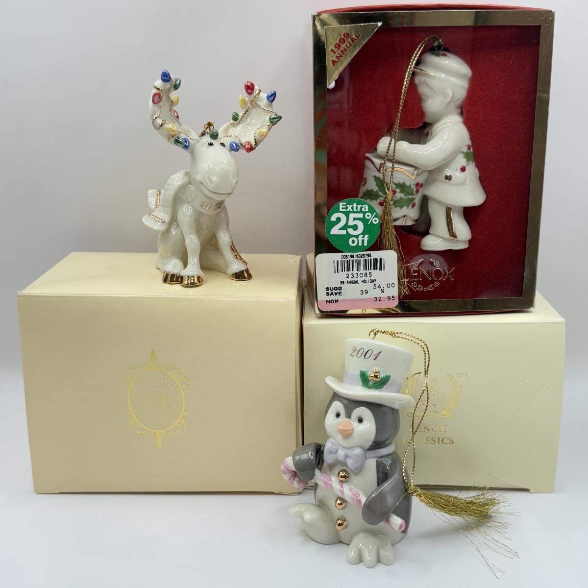 LOT 137K: Lenox Christmas Ornaments w/ Boxes - 1999 Annual Holiday Toy Soldier, 2001 Chilly Chap Penguin w/ COA & 2002 Moose Merriment w/ COA
